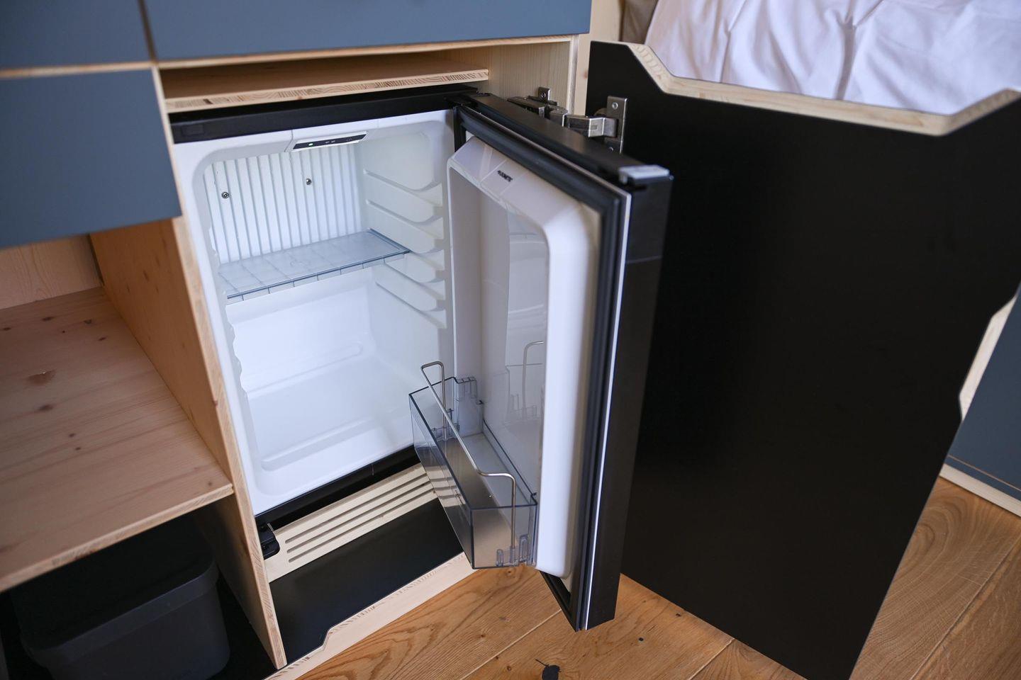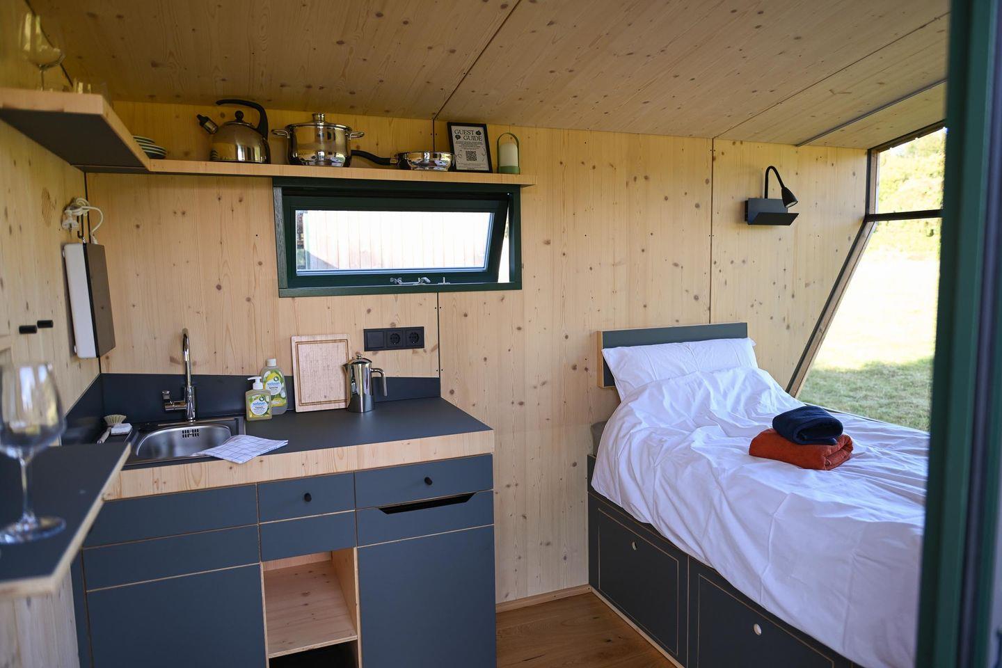 Auf 5 m² Innenfläche findest du alles, was nötig ist für einen Aufenthalt zu zweit: ein gemütliches Bett (1,40 × 2,00 m) inklusive Decken, Kopfkissen und hochwertiger Bettwäsche, genügend Stauraum, eine Heizung und ein großes Panoramafenster mit Verdunklungsmöglichkeit, das dir einen wunderbaren Blick über die Weide schenkt (je nach Saison mit Schafen). Für das leibliche Wohl sorgt eine kleine, aber gut ausgestattete Kochnische: Mini-Kühlschrank, ein mobiles Induktionskochfeld, Flötenkessel, French Press, Geschirr, Pfanne, Topf und Kochutensilien sowie Reinigungsmittel – alles da, um einfache Mahlzeiten und Kaffee ganz entspannt zuzubereiten.