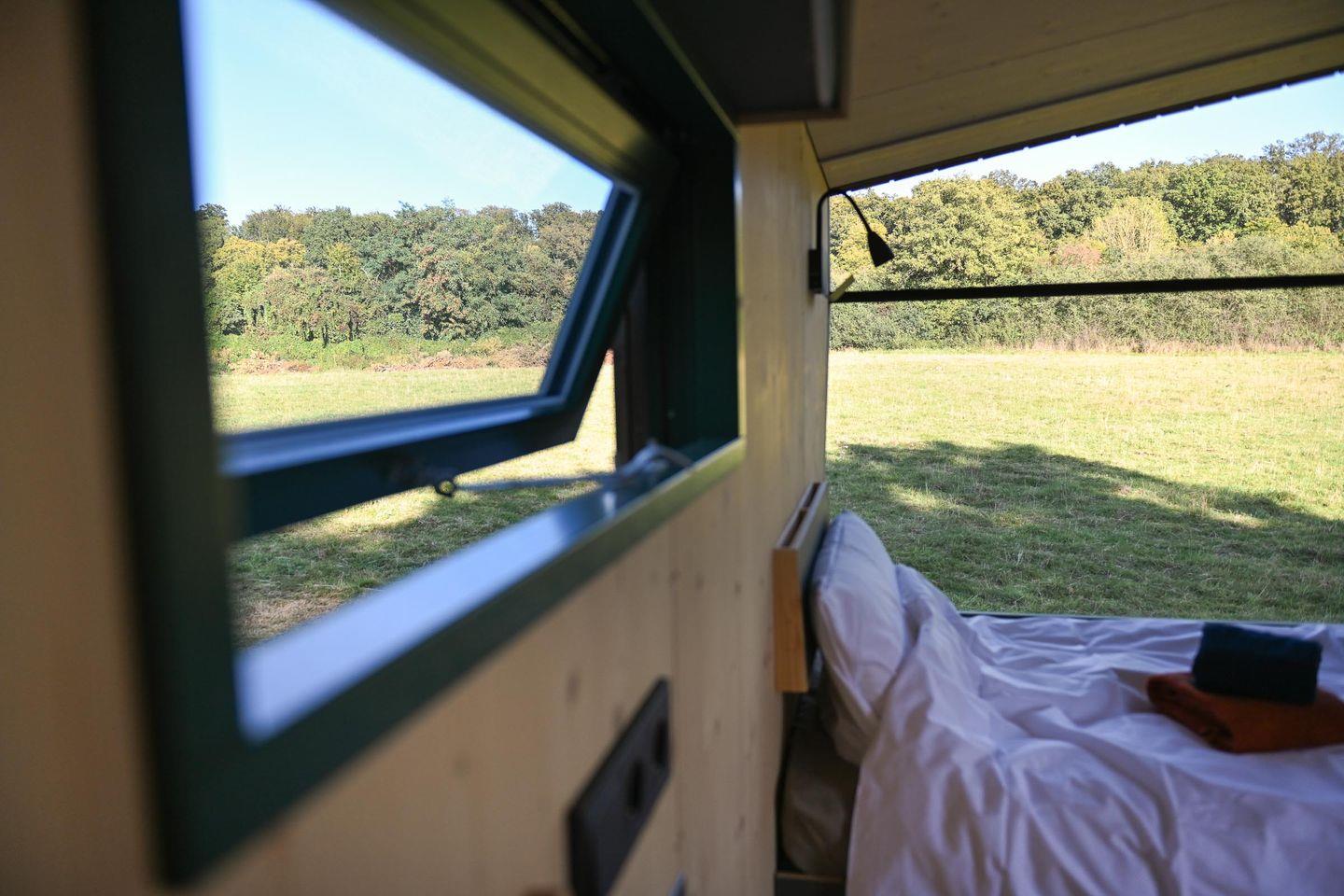 Draußen gibt es eine Mini-Terrasse mit Tisch und zwei Stühlen – perfekt für das Frühstück in der Morgensonne oder den Abend bei Naturgeräuschen. Eine ausklappbare Loungefläche im Inneren lädt tagsüber zum Lesen, Podcast hören oder einfach Liegen und Natur beobachten ein, abends wird daraus ein Schlafplatz.