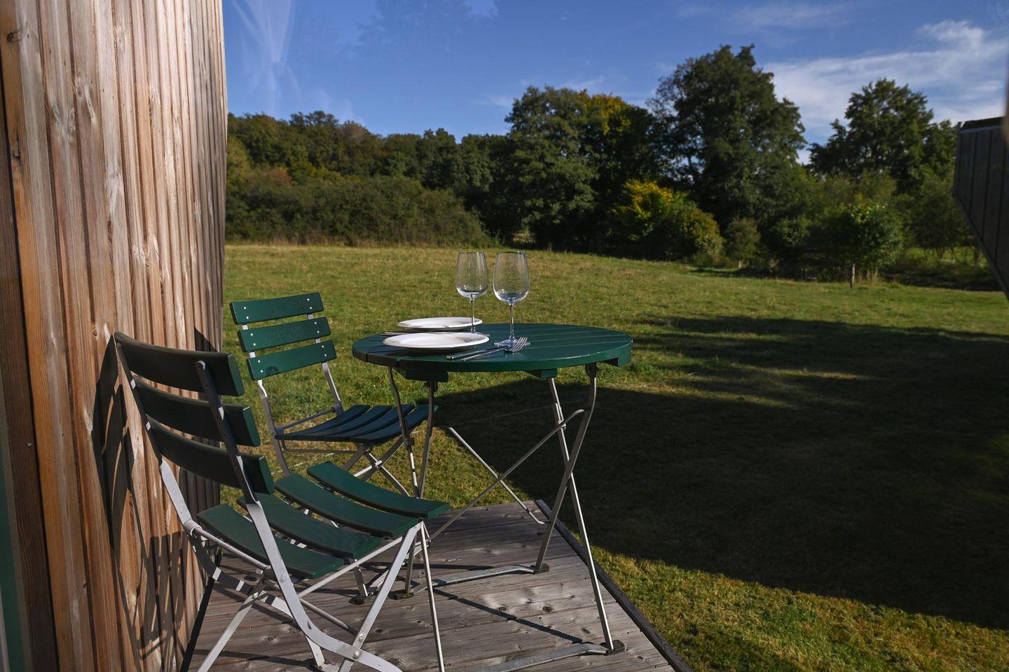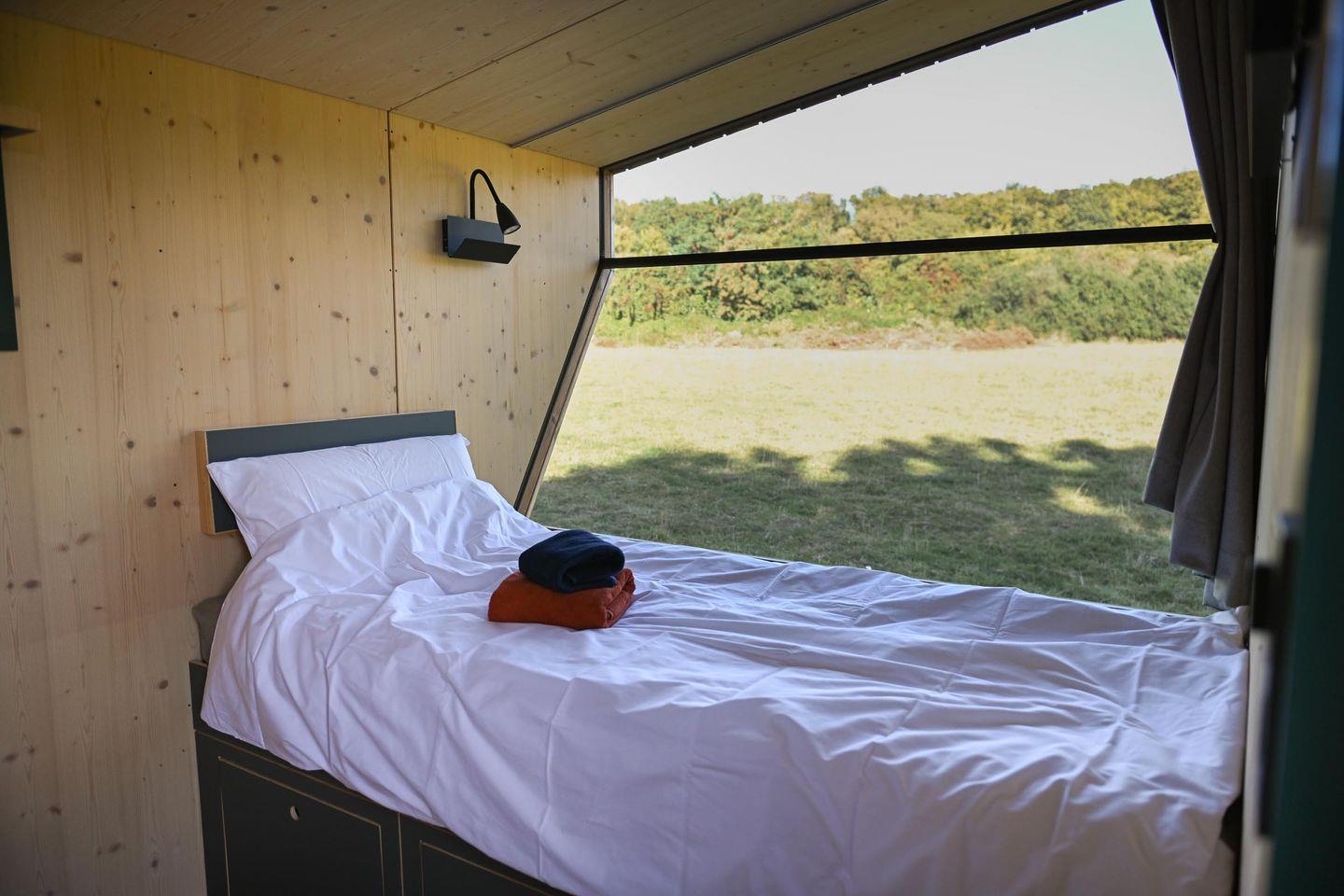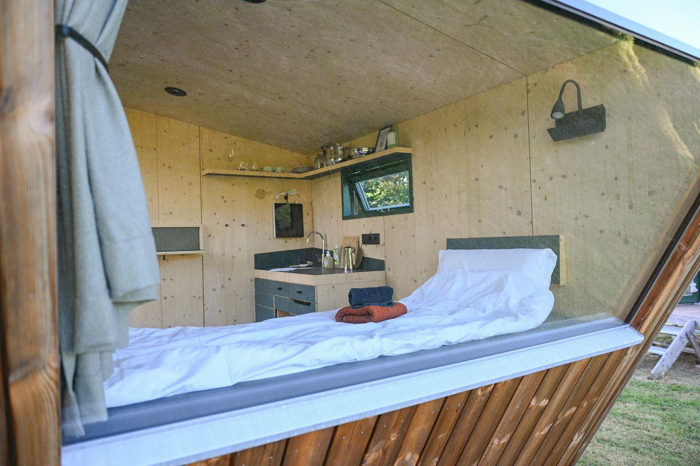 Draußen gibt es eine Mini-Terrasse mit Tisch und zwei Stühlen – perfekt für das Frühstück in der Morgensonne oder den Abend bei Naturgeräuschen. Eine ausklappbare Loungefläche im Inneren lädt tagsüber zum Lesen, Podcast hören oder einfach Liegen und Natur beobachten ein, abends wird daraus ein Schlafplatz.