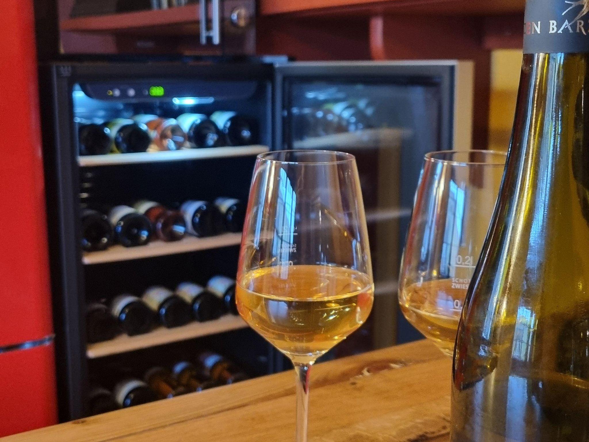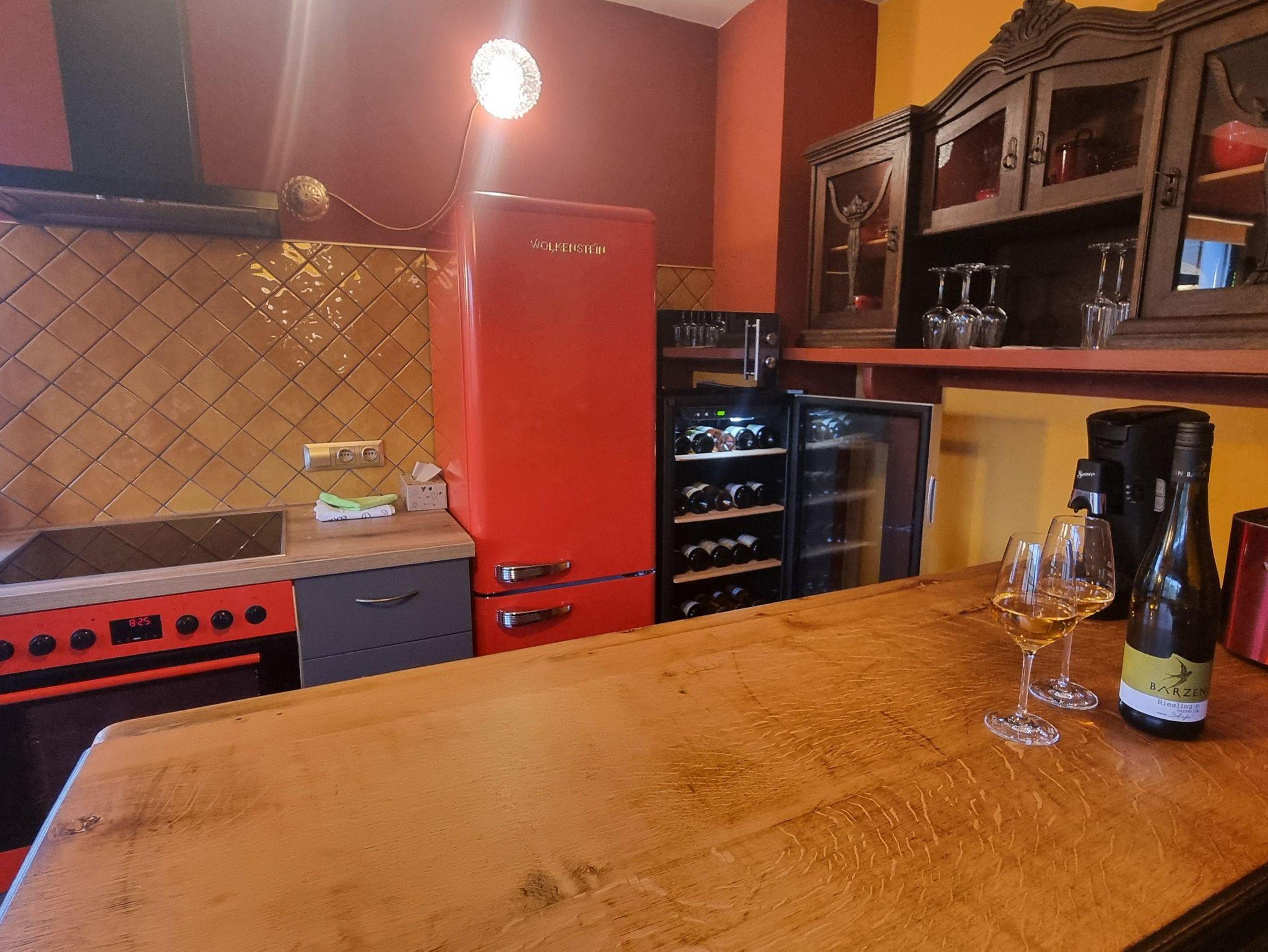 Weinkühlschrank mit Tropfen aus eigenem Weingut. Relax-Pavillon mit ´Hollyweinschaukel´ im Grünen.