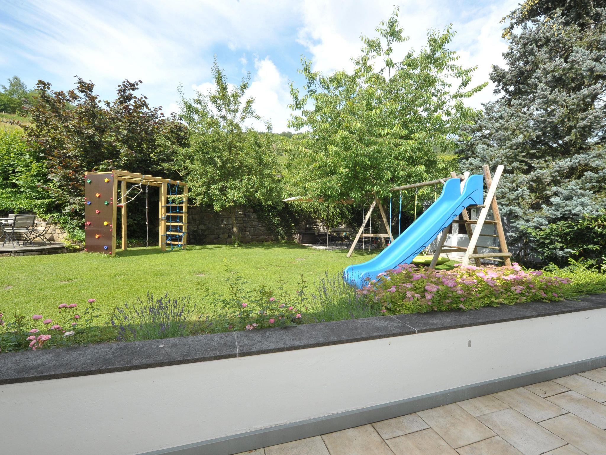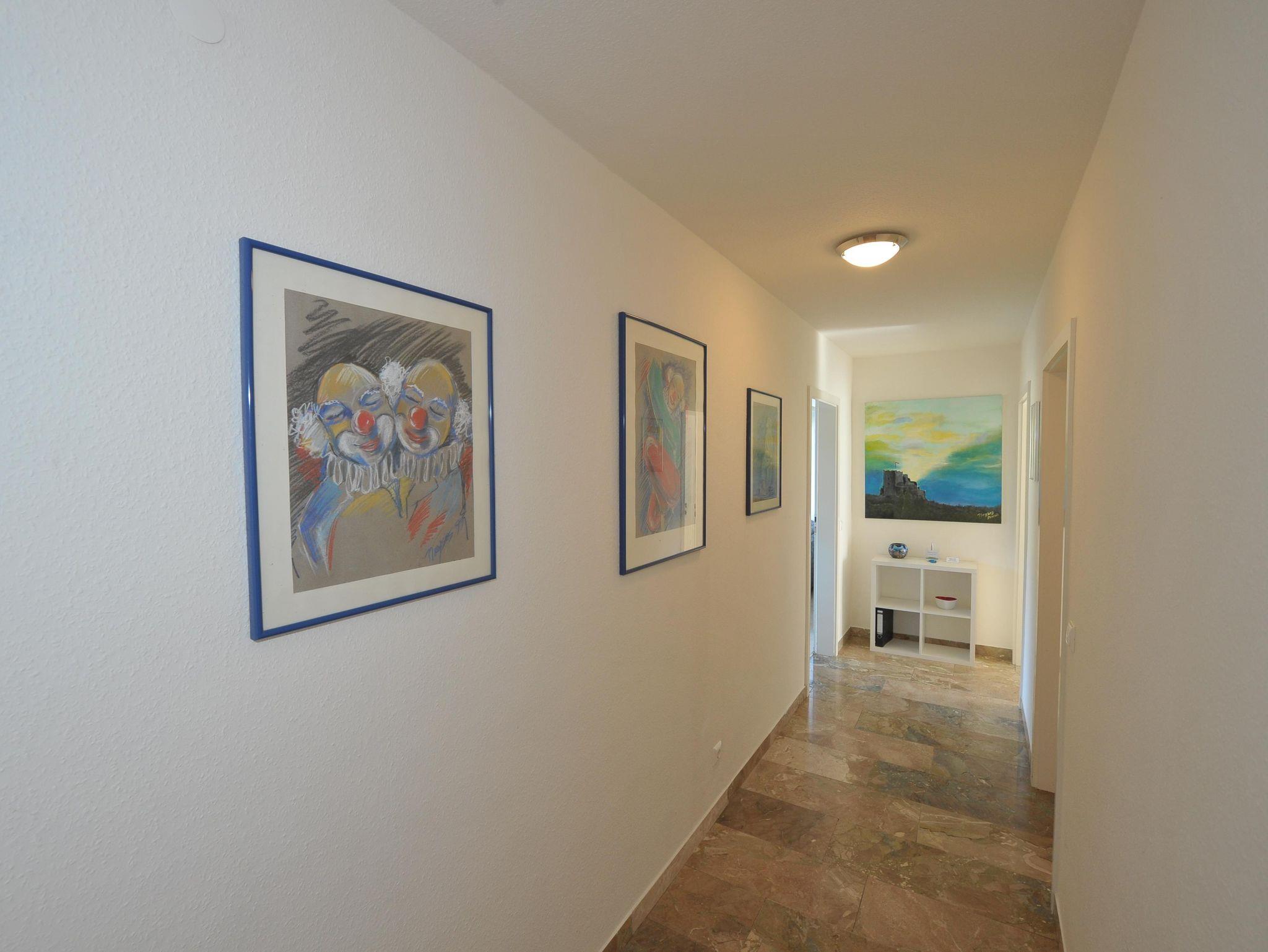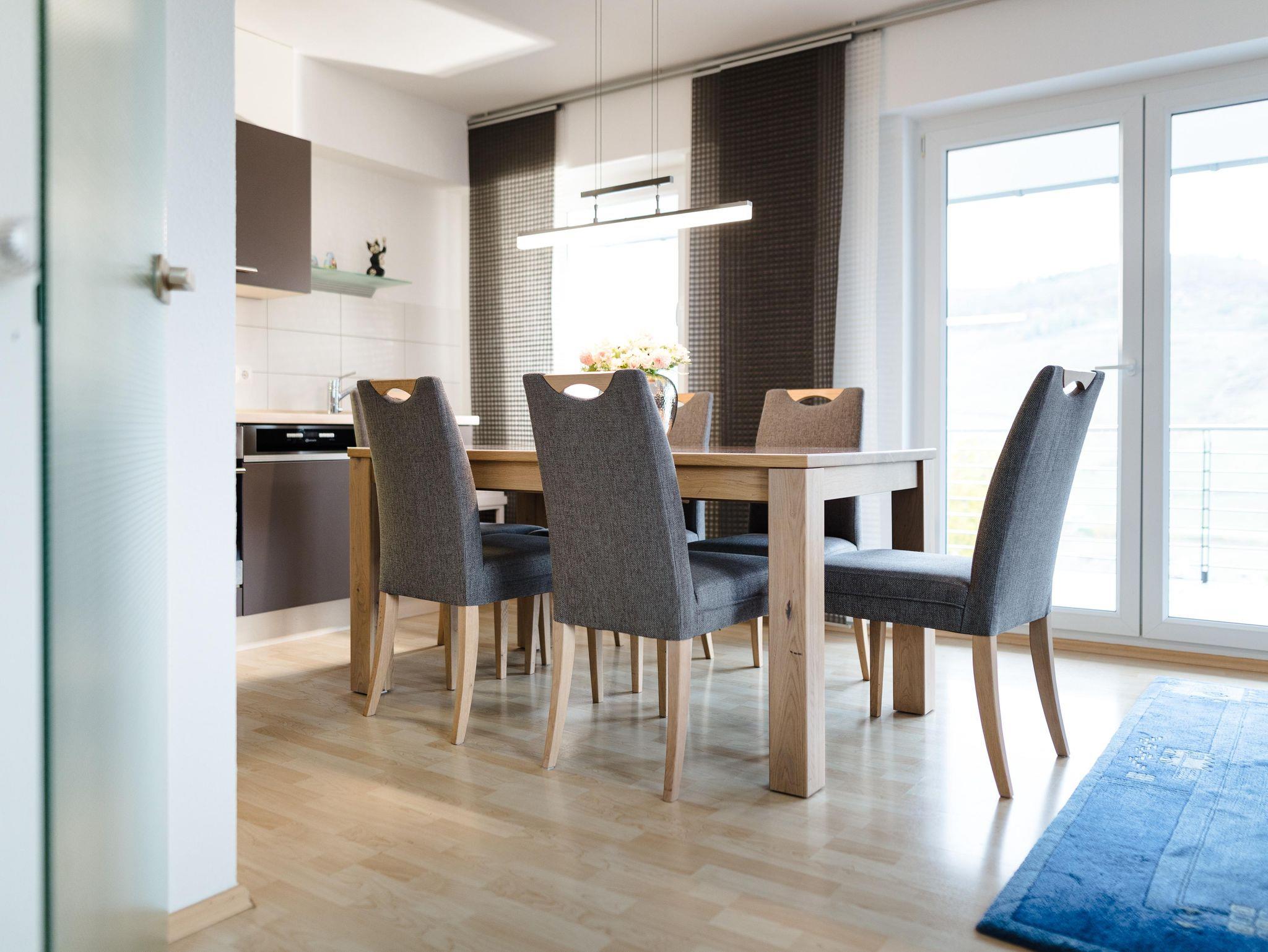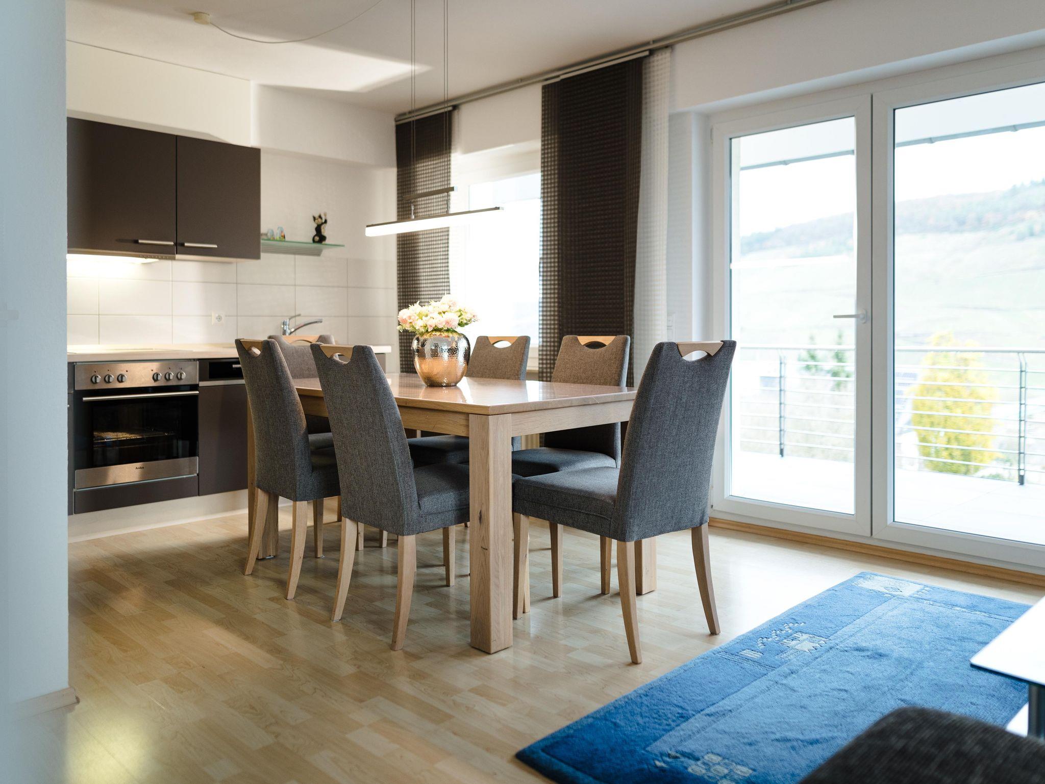 Die Wohnung verfügt über einen großen eigenen Balkon zur Moselseite und hat einen direkten Zugang zum Garten. Im Garten stehen Gartenmöbel und Liegen bereit zur Nutzung. Eigene, kostenfreie Parkplätze sind direkt am Haus. Es handelt sich um eine Nichtraucherwohnung. Auf den Terrassen oder im Garten kann gerne geraucht werden. Haustiere sind nicht erlaubt. Hund auf Anfrage. Die Wohnung befindet sich im 1.Stock. Sie kann jedoch über den Garten mit nur zwei Stufen erreicht werden. Im Flur steht ein Schrank mit Putzmitteln, Staubsauger, sowie Brettspielen, Spielkarten und Büchern bereit für unsere Gäste.