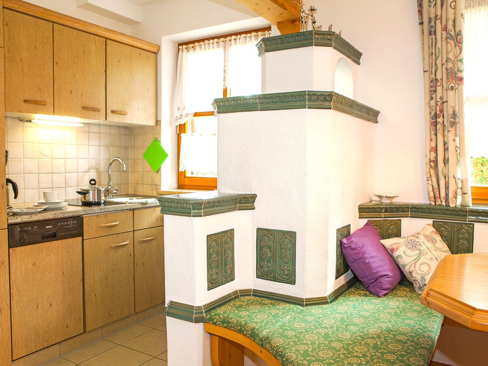 Das Wohnzimmer befindet sich im Erdgeschoss und verfügt über eine gemütliche Essecke und einen wassergeführten Kachelofen, welcher dem Raum eine romantische Stimmung verleiht. Zudem befindet sich hier eine bequeme Ausziehcouch, die Platz für eine Person bietet, ein goßer LCD Fernseher und eine kleine HiFi-Anlage.
