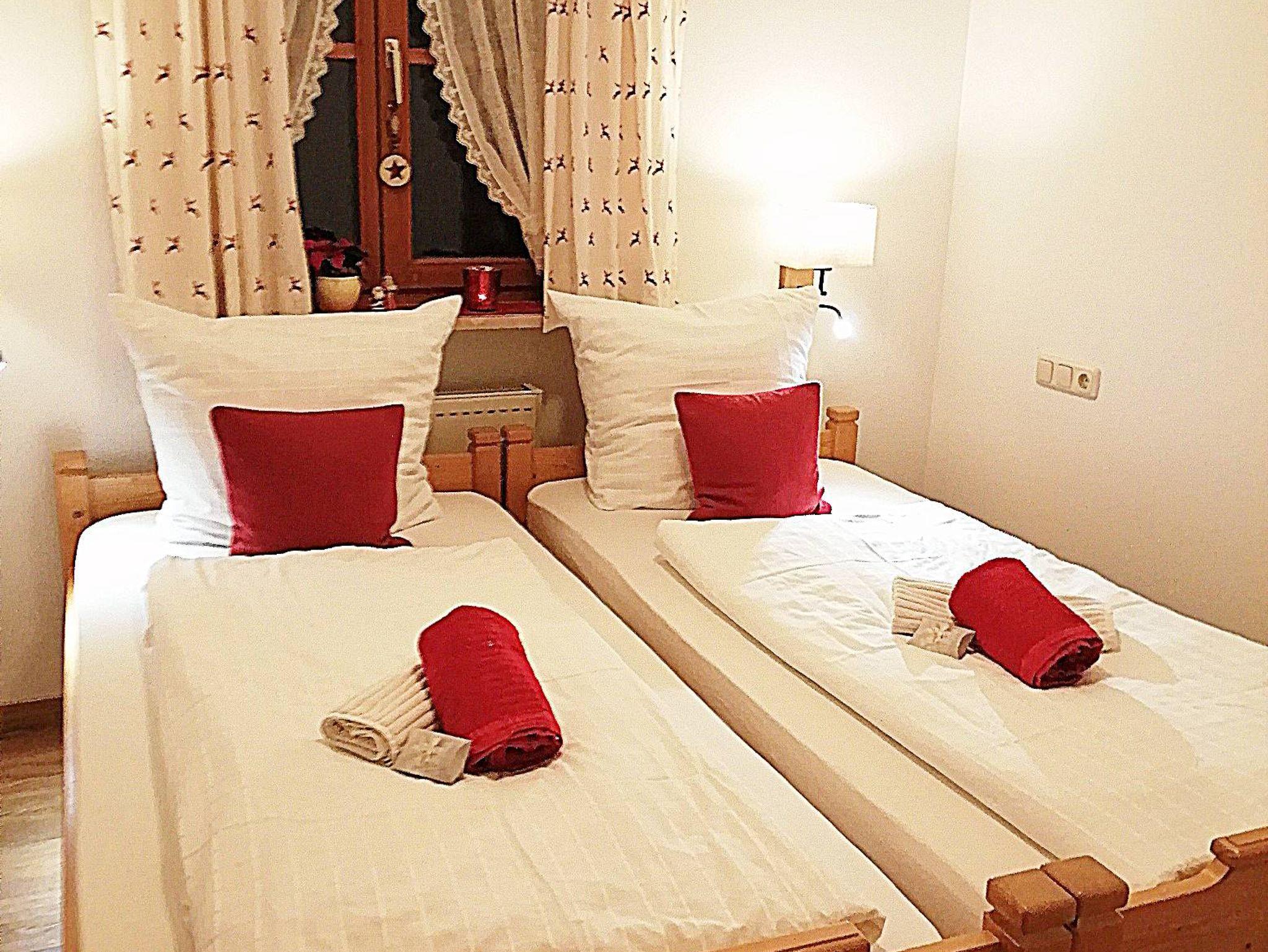 Schlafzimmer mit 2 Betten auch getrennt stellbar, Wohnzimmer mit ausziehbarer gr. Schlafcouch, Küchenzeile, Backofen, Geschirrspüler, Kühlschrank, echter Parkettboden, Balkon, gemütlich im bayerischen Stil eingerichtet und neu renovierte Ferienwohnung. Haustiere sind auf Anfrage erlaubt.