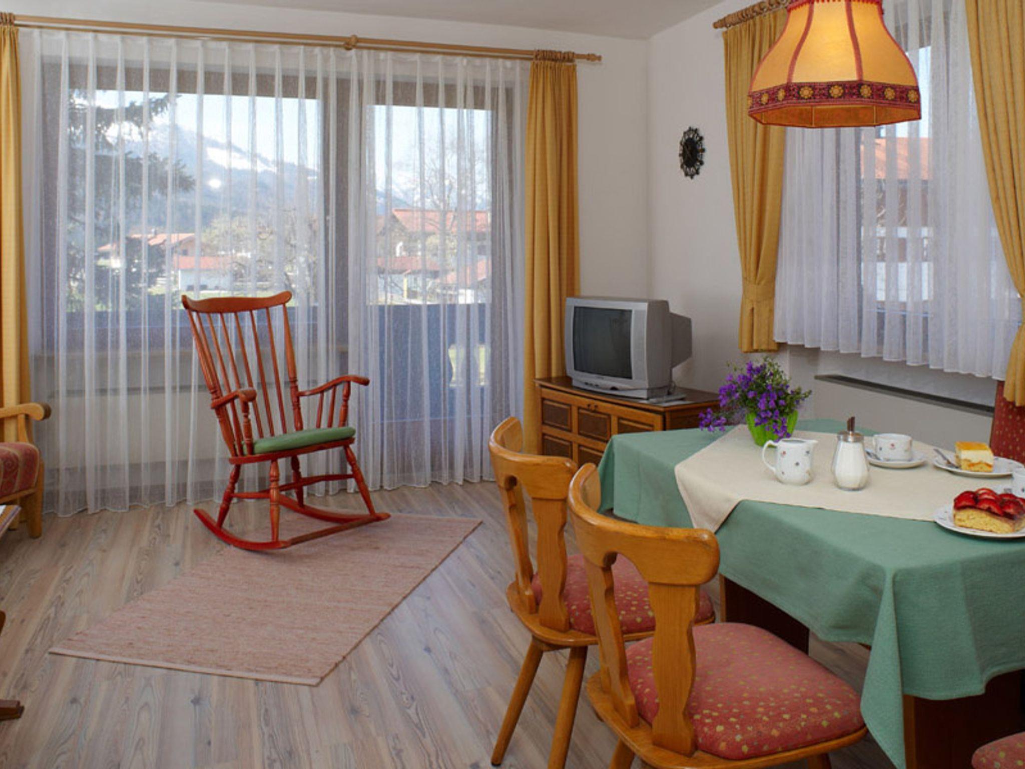 Gemütlich eingerichtete Zwei-Raum Ferienwohnung (1Doppelzimmer/ 1 Wohnzimmer mit Essecke und angrenzender Küche). Ideal für zwei Personen. Zur komfortablen Ausstattung gehört Kabel-Fernsehen, eine Stereoanlage (Radio, CD, Kassette) und ein Telefonanschluß mit der Möglichkeit zur Internetanbindung mit mitgebrachtem Modem PC. Die Küche verfügt neben einem Vierplattenherd über eine Kaffee- und Spülmaschine. Toaster und Wasserkocher sind ebenfalls vorhanden. Das Badezimmer ist mit einer Dusche ausgestattet. Südbalkon mit Gartenmöbeln und Sonnenschirm. Freier Blick ins schöne Bergpanorama.