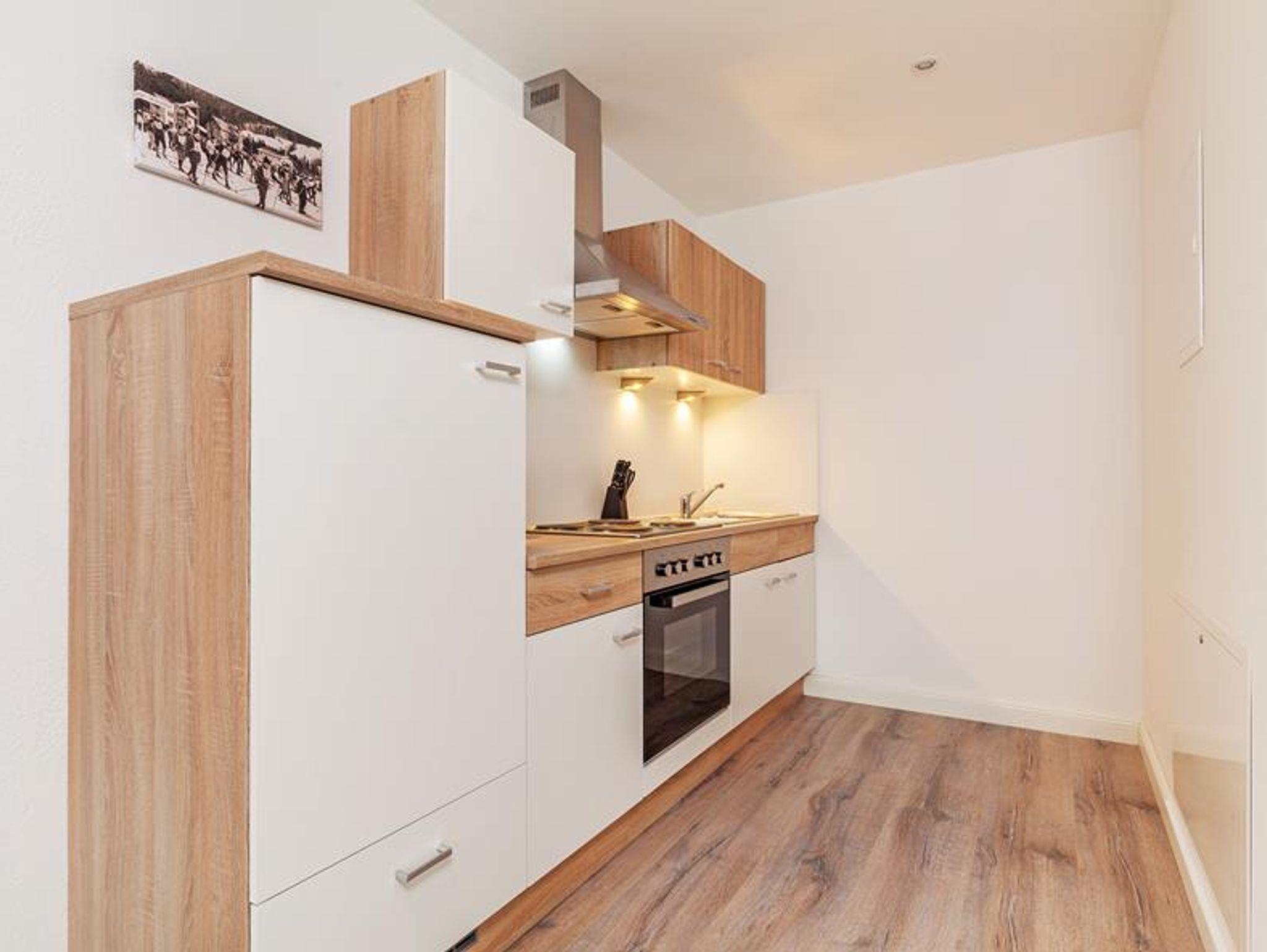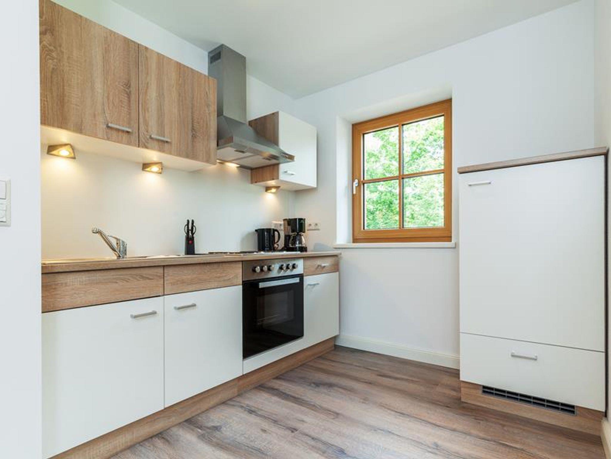 Die Küchenzeile im Wohn-Esszimmer verfügt über einen 4-Platten-Elektroherd mit Backofen, Kühlschrank und Gefrierfach. Ebenfalls stehen Ihnen eine Kaffeemaschine, Wasserkocher und ein Toaster zur Verfügung.