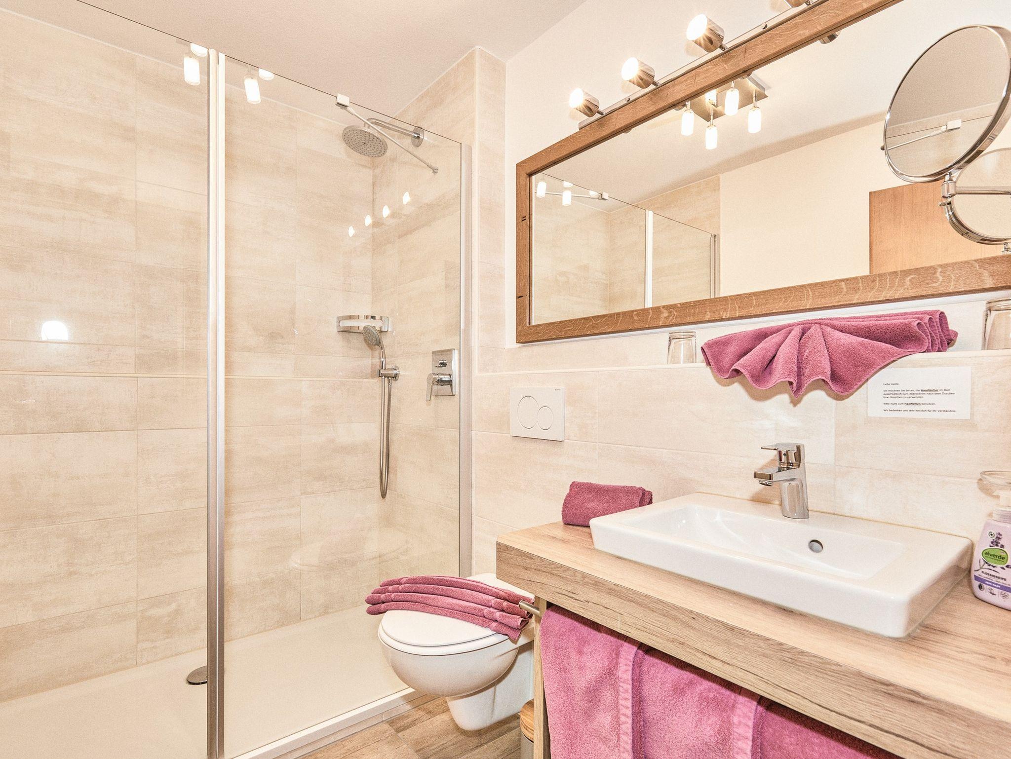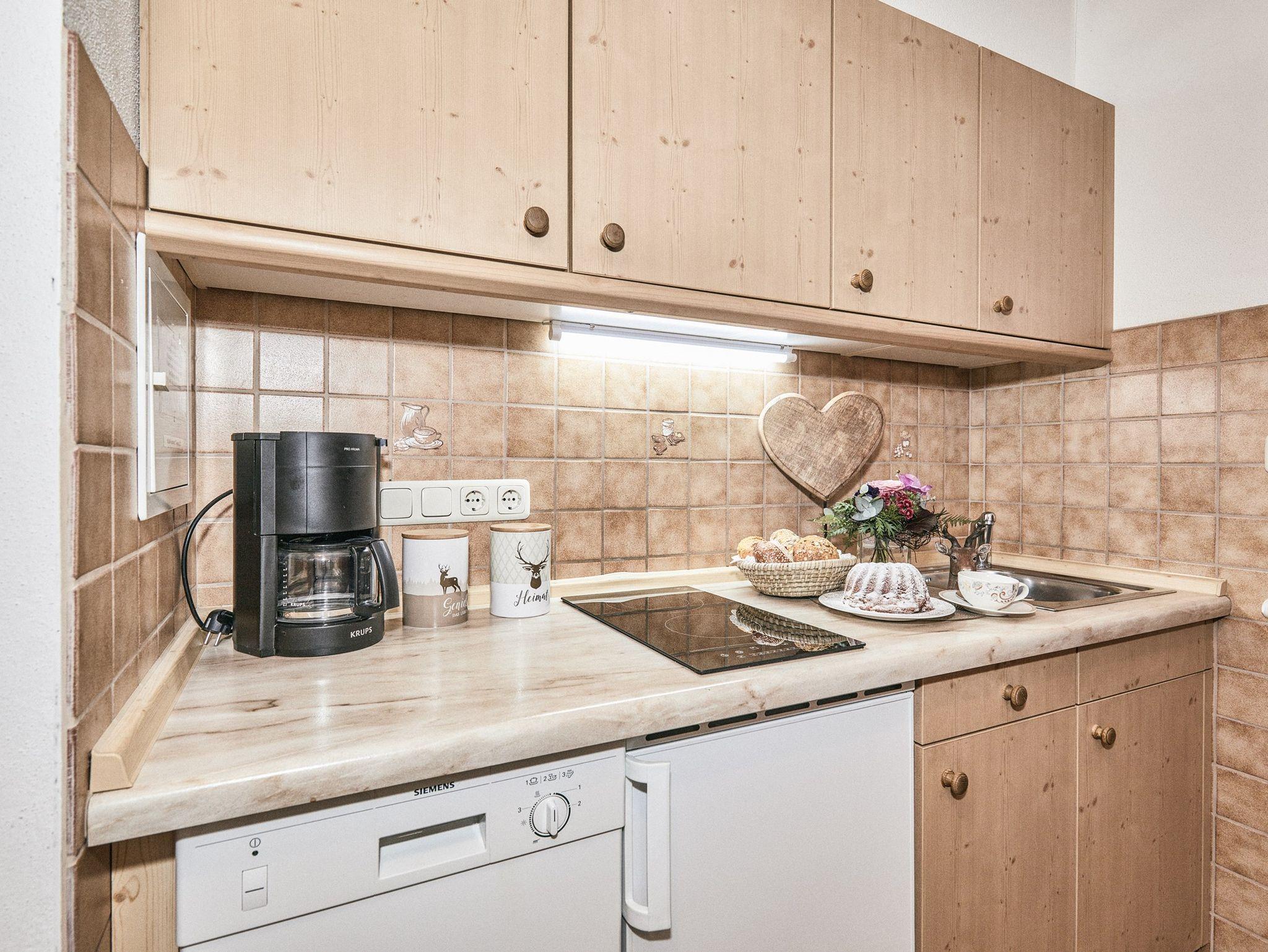 Wohn-, Schlafraum getrennt (mit Parkettboden ausgestattet). Schöner Wohnraum mit Eßecke und Sitzgruppe. Abgeschlossene komplett ausgestattete Küche, große, ebenerdige Dusche. Großer Balkon zur Südseite mit Blick zum Wilden Kaiser.