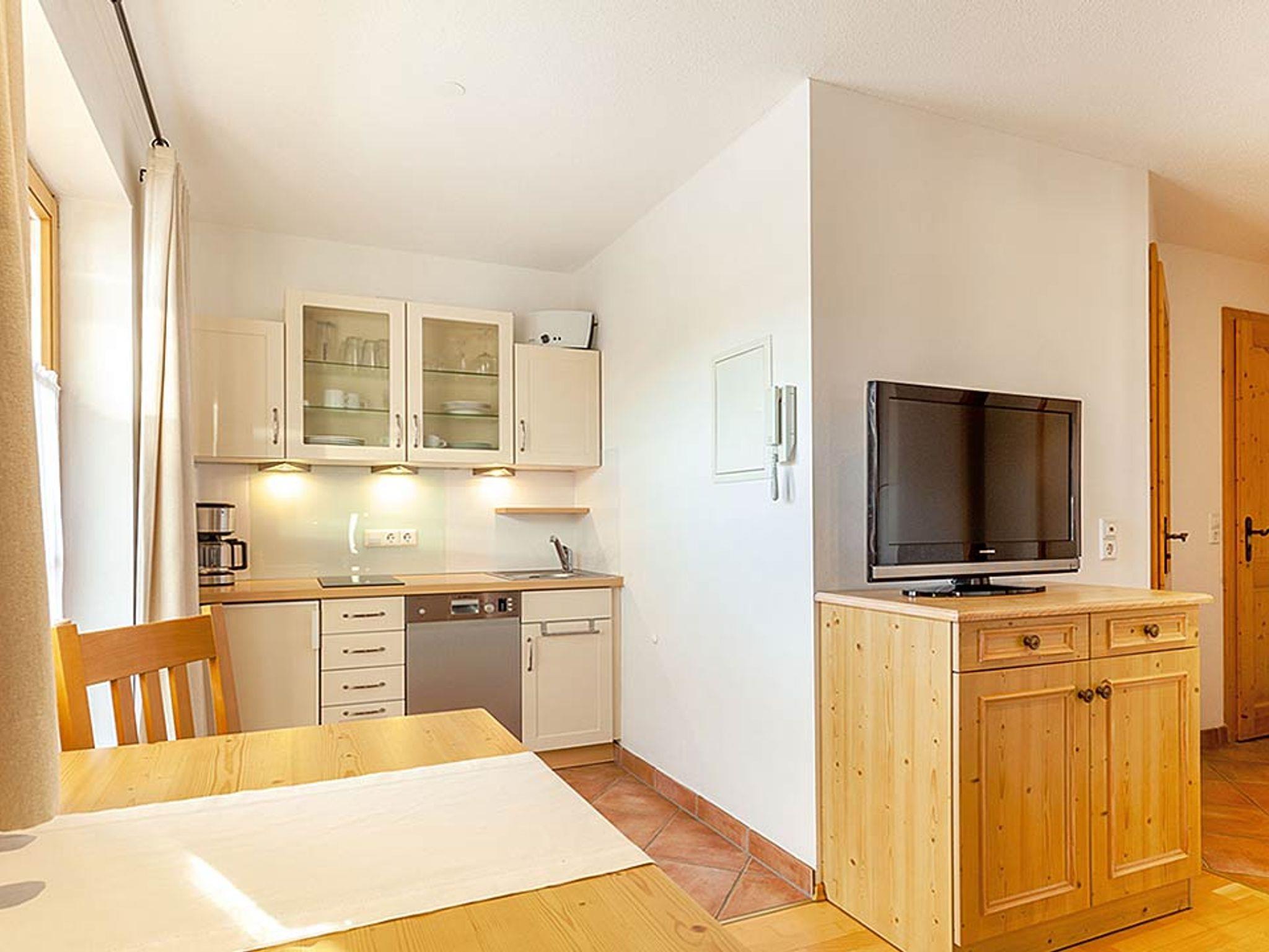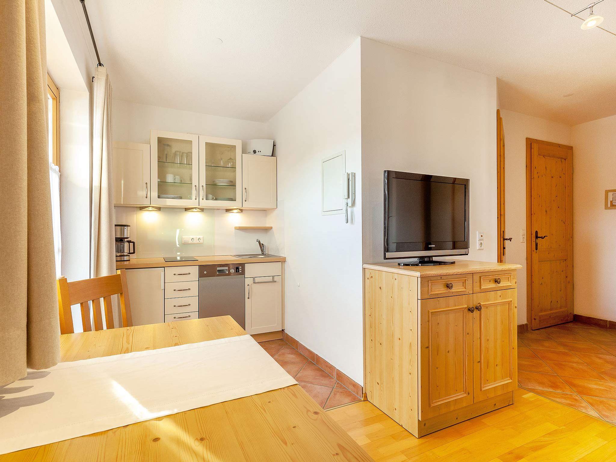 Sonnige 2-Zimmer-Ferienwohnung im 1.OG, Größe ca. 33 m². Der große Süd-Balkon bietet freien Blick ins Kaisergebirge und den Unterberg. An der kleinen Essecke im Wohnraum können Sie die selbst zubereiteten Mahlzeiten genießen. Die Küchenzeile ist mit einem Geschirrspüler ausgestattet. Allergikergerecht wurde in der gesamten Wohnung hochwertiges Echtholz-Parkett verlegt. Bettwäsche und Handtücher sind ausreichend vorhanden und werden nach Ihren Wünschen gewechselt. Für den Fernsehabend steht Ihnen ein DVD-Player sowie je ein Fernsehgerät in Wohn- und Schlafzimmer zur Verfügung. Die CD-Radio-Anlage komplettiert die Ausstattung. Das Duschbad im App. Walmberg wurde komplett renoviert. In unseren Badezimmern bekommen Sie keine kalten Füße! Dafür sorgt die ganzjährig beheizte Fußbodenheizung.