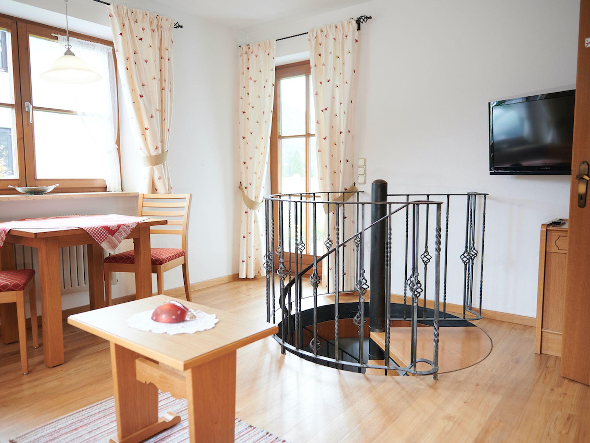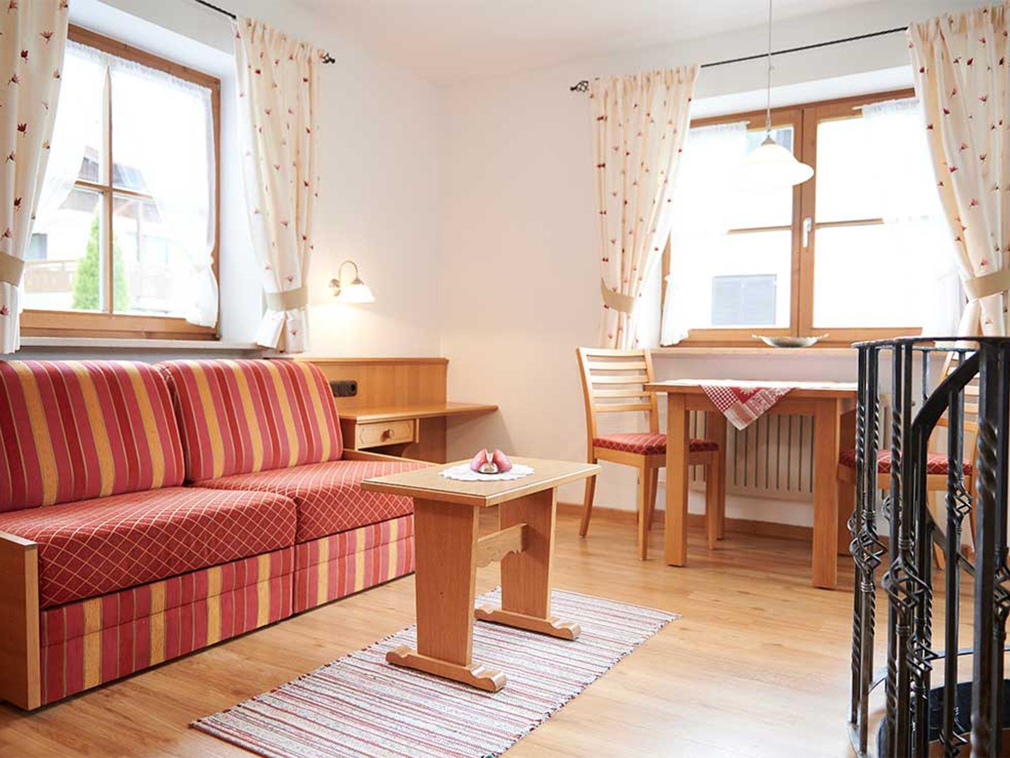 Unsere Ferienwohnung Nr. 1 liegt im Erdgeschoss unseres schönen Hauses. Die Terrasse erstreckt sich über die gesamte Seite des Hauses mit Blick auf das Skigebiet Unterberg Hoch-Kössen und das Kaisergebirge. Im Sommer können Sie die Paraglider beobachten, die am Unterberg ihre Flüge absolvieren. Und im Winter können Sie die Langläufer beobachten, die ganz in der Nähe auf den Loipen ihre Runden drehen. Das Schlafzimmer im Keller erreichen Sie über die Wendeltreppe in der Ferienwohnung.