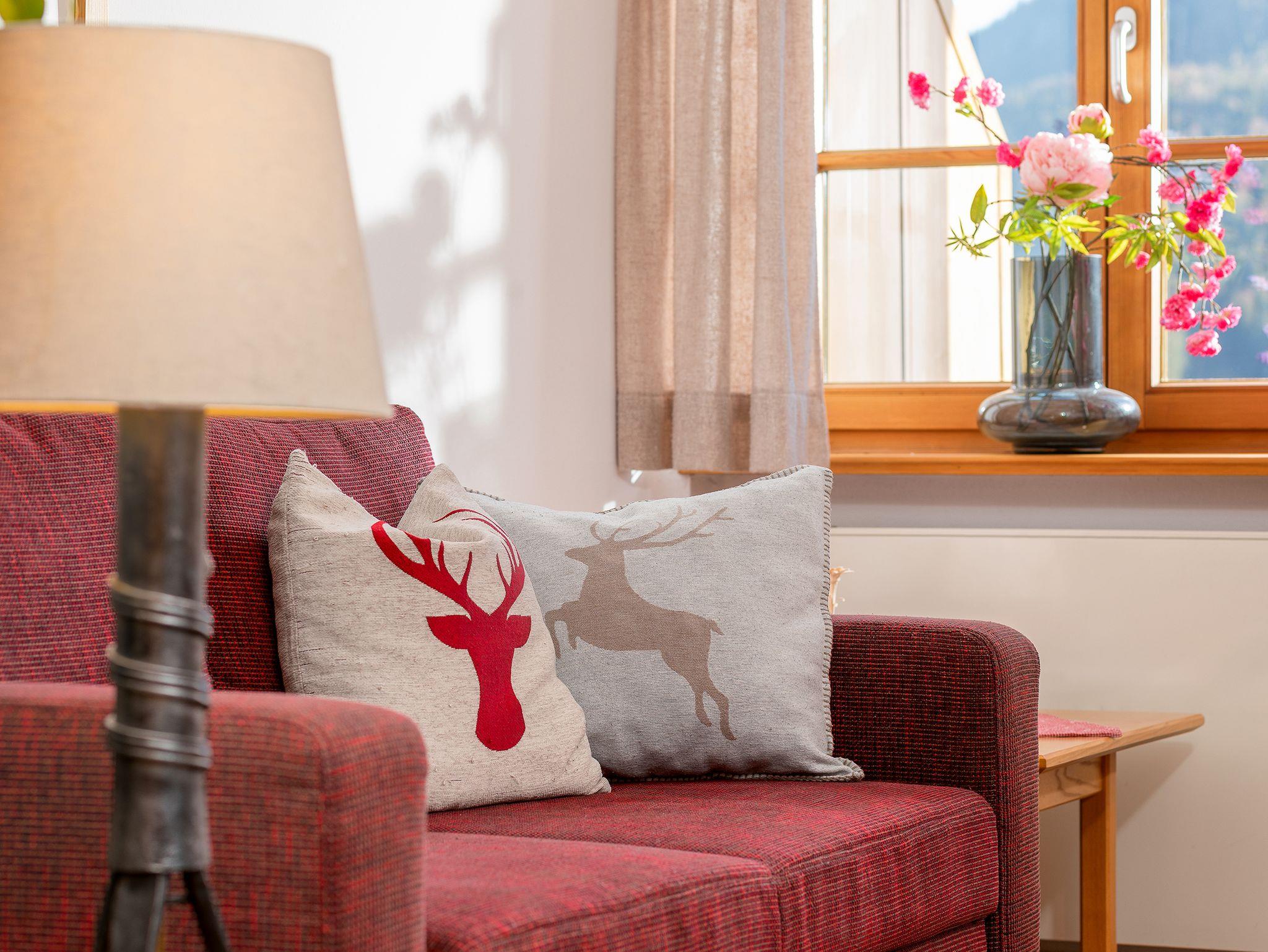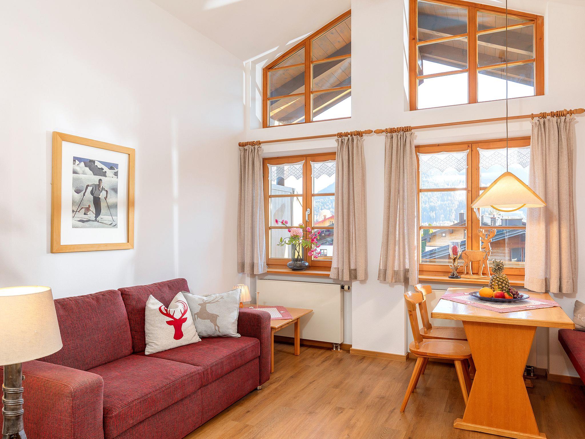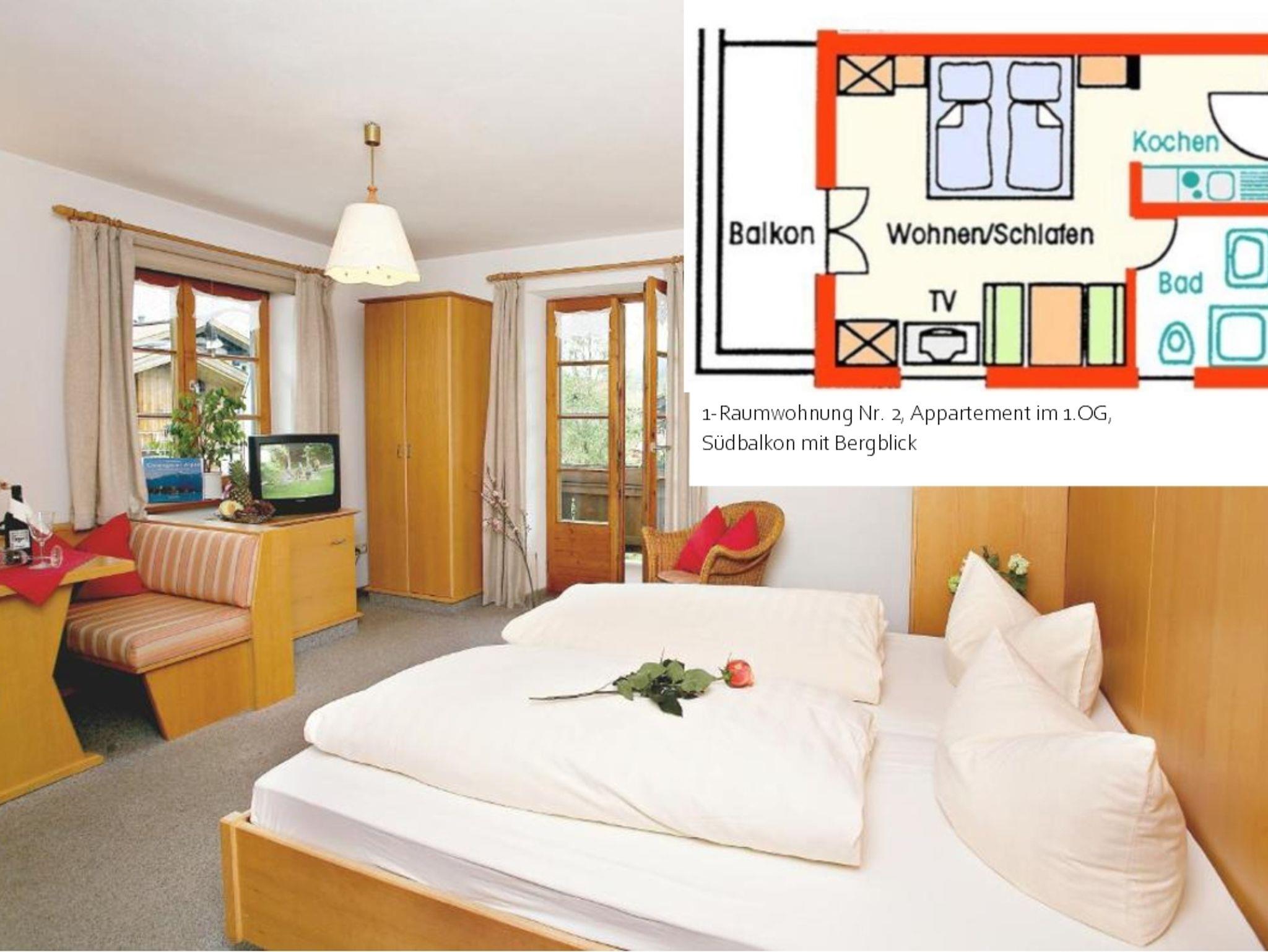 Die Einzimmer-Ferienwohnung mit Wohn-Schlafraum ist ausgestattet mit einem Doppelbett, einer Sitzecke, Südbalkon, Kabel-TV sowie Telefon. Das Bad verfügt über Dusche/WC und Fön. Im Vorraum mit Garderobe befindet sich eine Küchenzeile. Vom Südbalkon aus haben Sie einen herrlichen Bergblick.