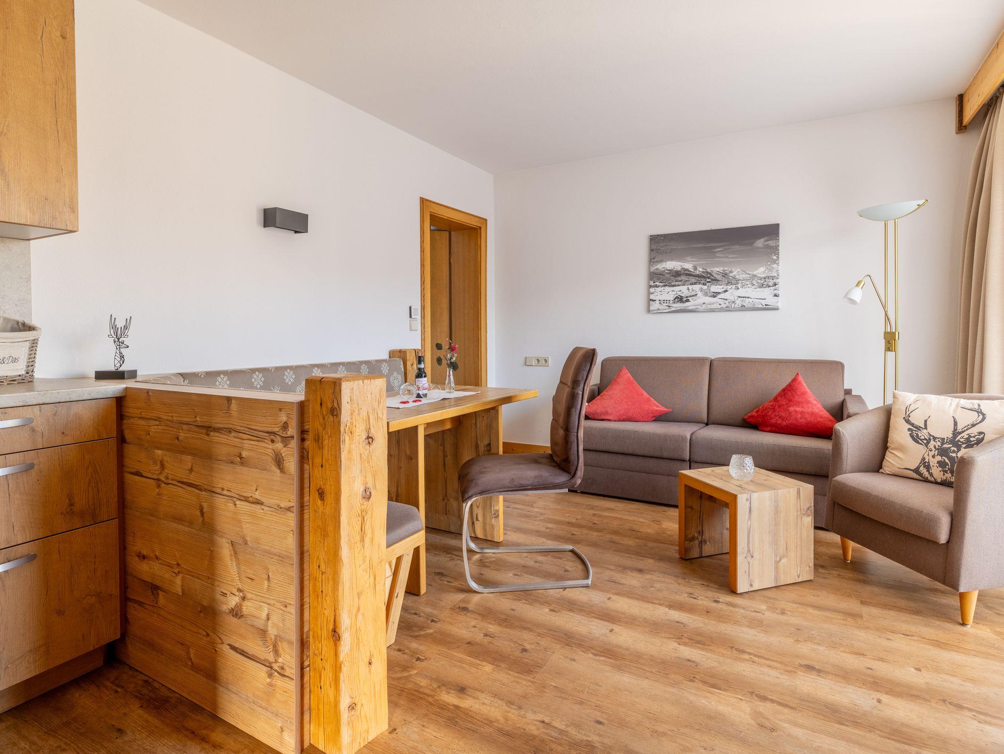 Die neu renovierte, großzügige 2-Raumwohnung im 2. OG hat eine Größe von ca. 41 qm. Die exklusive Wohnung verfügt über ein Schlafzimmer mit DU/WC (Fußbodenheizung), eine hochwertige moderne Küchenzeile (mit Geschirrspüler, Backofen, 4-Platten-Ceranfeld, Kaffeemaschine, Toaster, uvm.) und ein schönes helles Wohn/Esszimmer mit Panoramafenster, gemütliche Essecke und eine hochwertige Ausziehcouch. Vom West-Balkon hat man einen traumhaften Blick auf das Kaisergebirge und den Unterberg.