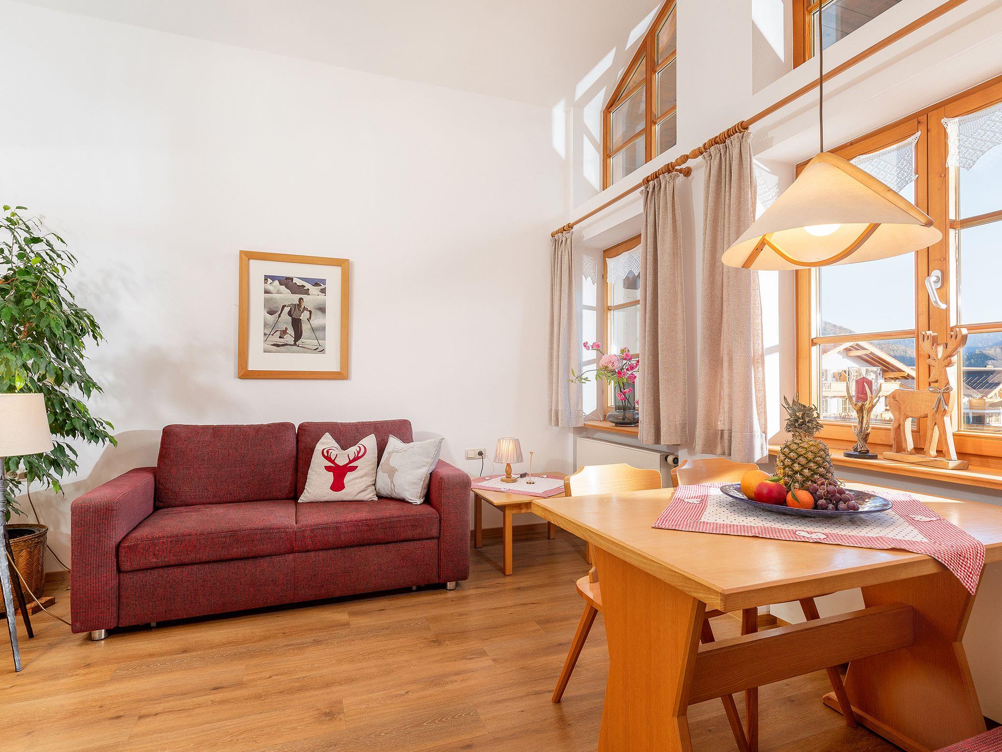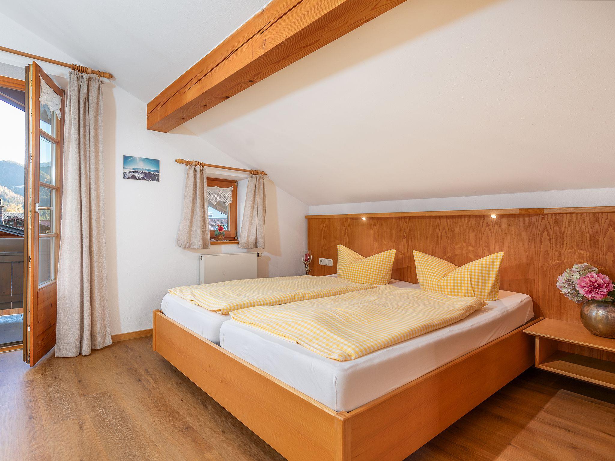 Die Zweizimmer-Ferienwohnung mit Wohn- und separatem Schlafraum ist ausgestattet mit einem Doppelbett, einer Sitzecke, Südbalkon, Kabel-TV sowie Telefon. Die Eckbank der Essgruppe im Wohnraum lässt sich in ein weiteres Bett verwandeln. Das Bad verfügt über Dusche/WC und Fön. Im Vorraum mit Garderobe befindet sich eine Küchenzeile. Vom Südbalkon aus haben Sie einen herrlichen Bergblick.