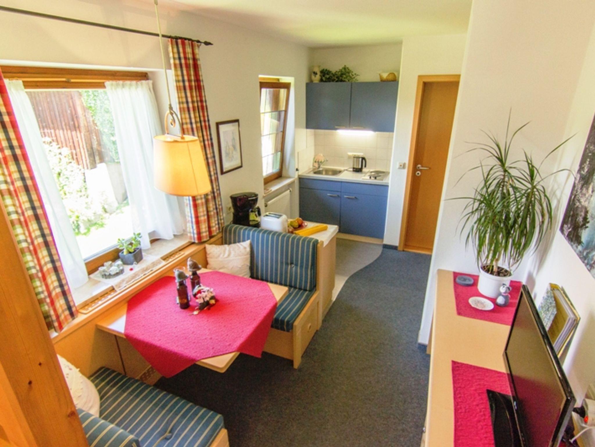 Ein helles und gemütliches Einzimmerappartment für zwei Personen, mit Südbalkon und freiem Blick auf die Berge. Großes Badezimmer mit Dusche, sowie komplett eingerichtete kleine Küchenzeile. Das Doppelbett im abgeteilten Schlafraum hat rückenschonende Bandscheibenmatratzen. Handtücher, Tisch- und Bettwäsche werden selbstverständlich gestellt. Kabel- / Sat TV, Radio, Wecker und kostenloses WLAN. Ihre Freizeitausrüstung ist in einem geheizten und abschließbarem Raum gut aufgehoben.