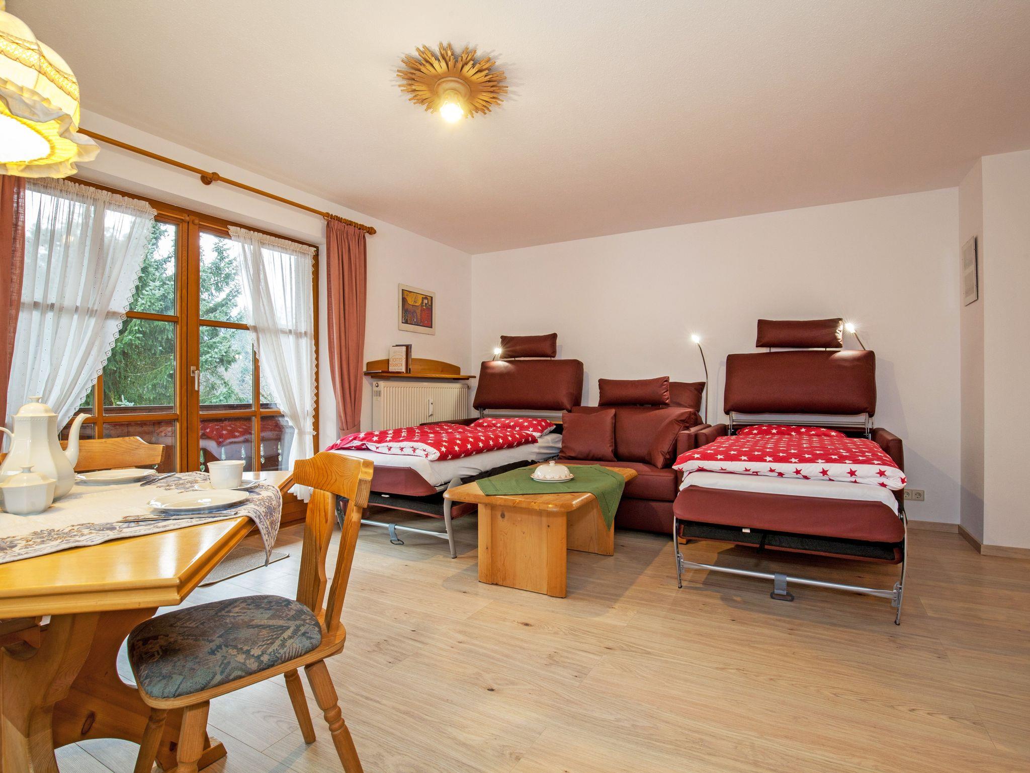 Im Wohnbereich lädt eine neuwertige Premium-Couchgarnitur zum Entspannen ein. Hier können drei Schlafcouchen ausgeklappt werden – ideal für einen Familienurlaub. Zu Ihrer Unterhaltung stehen ein Flachbild-Wand-TV und ein Radio und kostenloses, WLAN zur Benutzung. Alle Leuchtmittel in der Wohnung sind LEDs. Genießen Sie Ihre Mahlzeiten in gemütlichen Essbereich im Erker. Hier ist eine urige Eckbank eingebaut worden, außerdem ein Esstisch mit Stühlen.