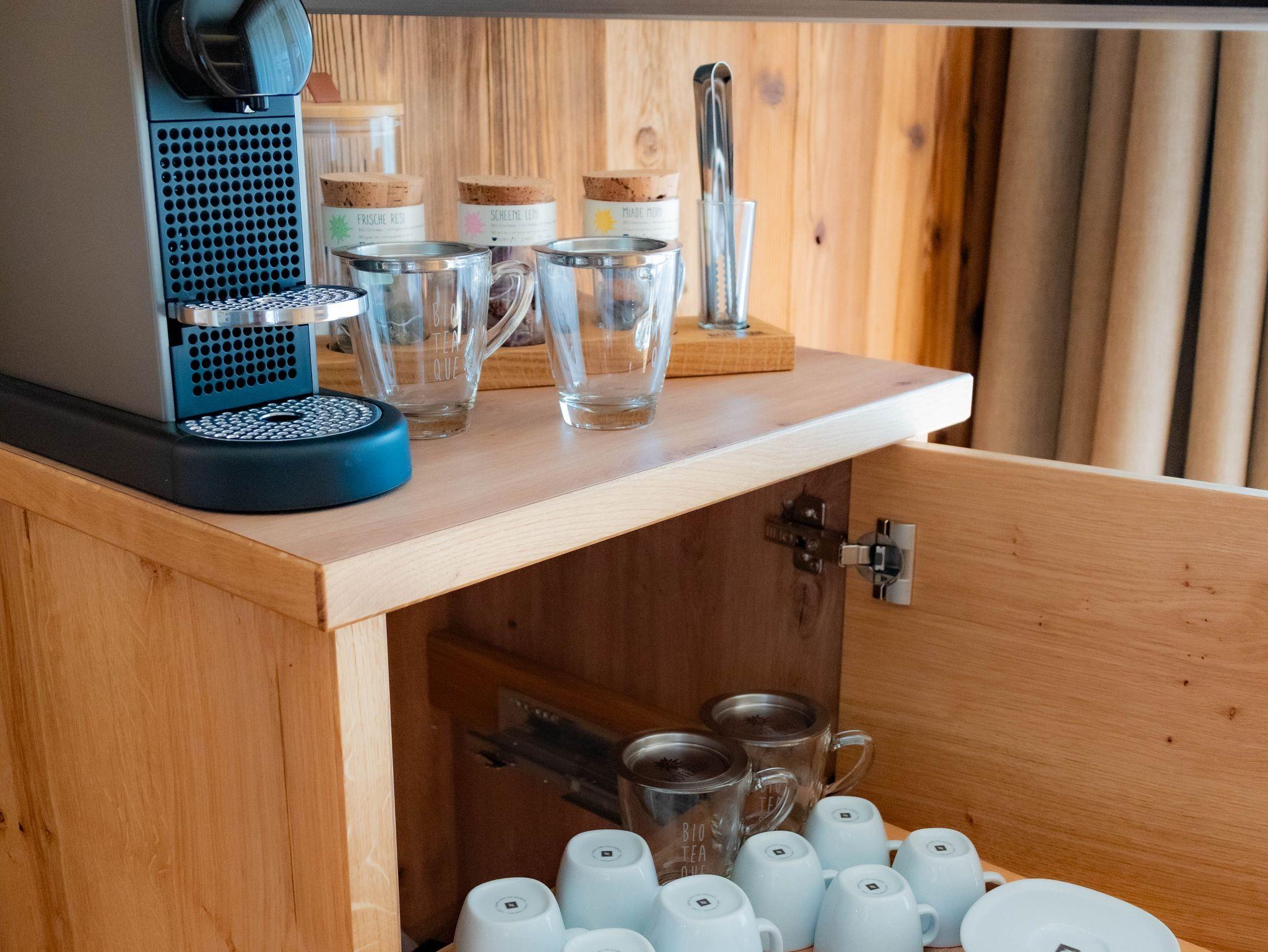 Im Schlafzimmer erwartet Sie ein komfortables Boxspringbett, das höchsten Schlafkomfort garantiert, sowie ein großer LED-Smart-TV und eine Kaffee- und Teebar mit Nespresso-Kapselmaschine – so starten Sie entspannt in den Tag.