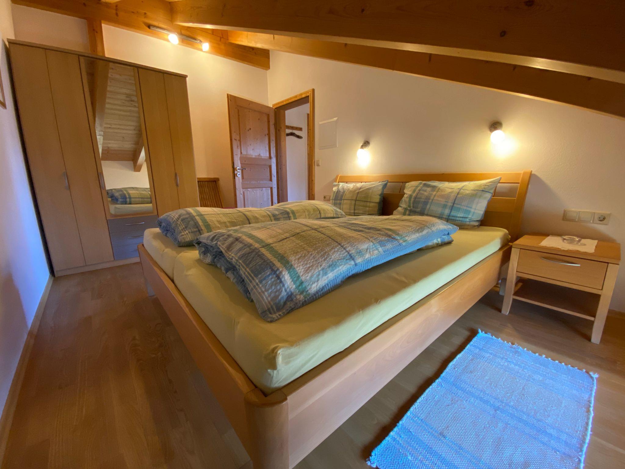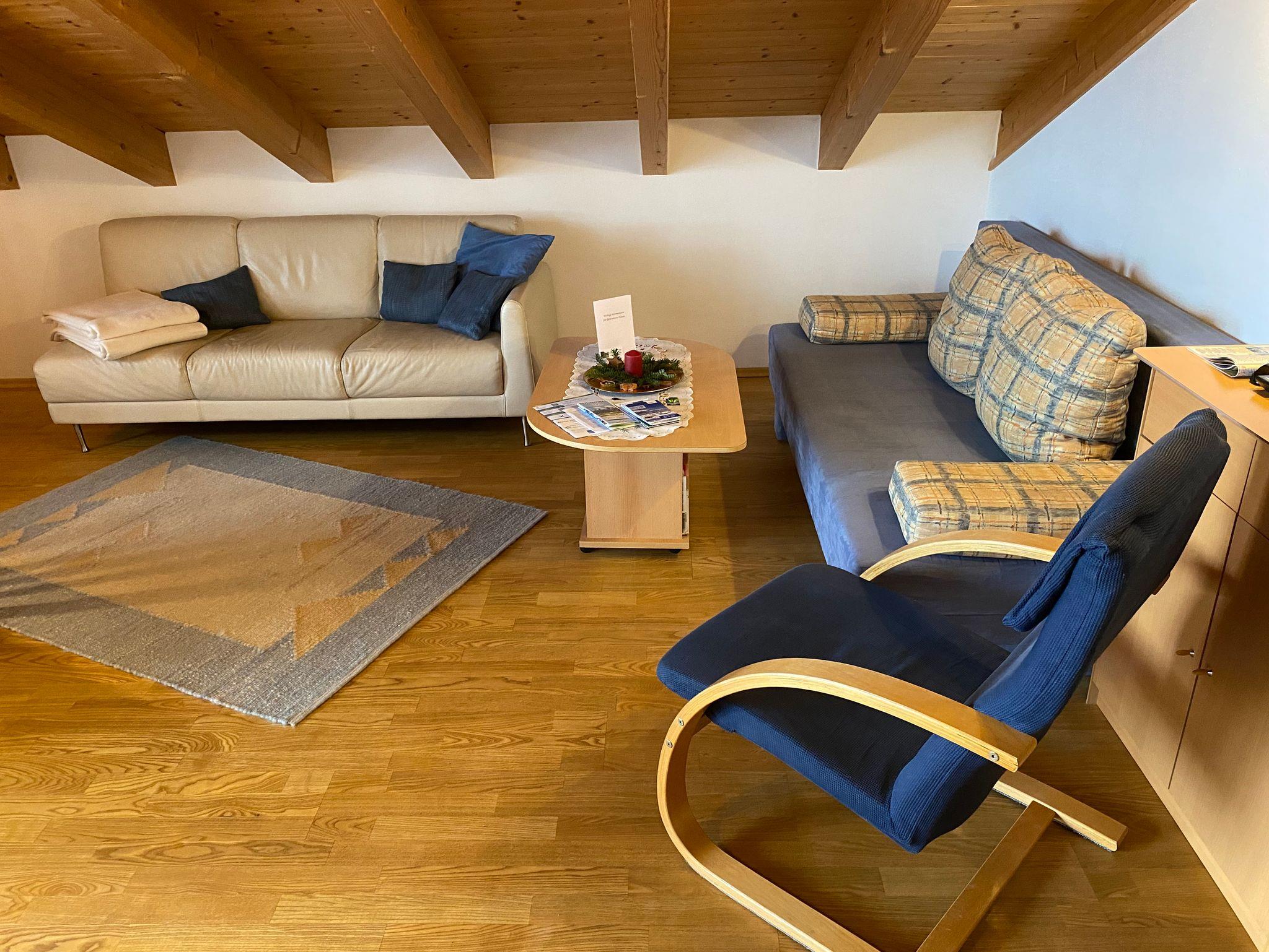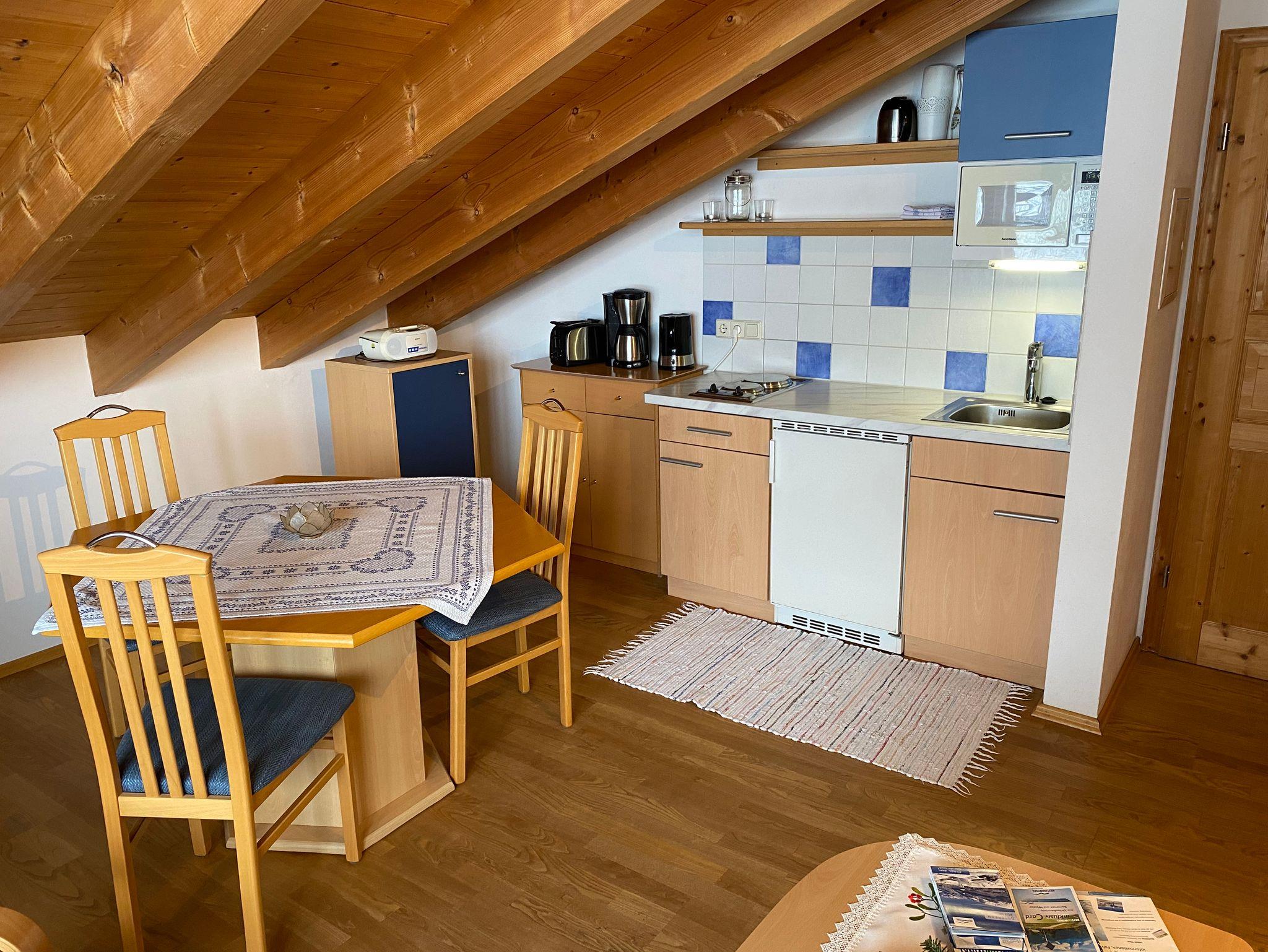 Die nach Osten orientierte Dachgeschoß-Wohnung mit Sichtbalkendecke bietet Platz für 2-4 Personen. Sie verfügt über ein Schlafzimmer mit Doppelbett und einen Wohnraum mit gut ausgestatteter Küchenzeile, Tisch, Stühlen und einer bequemen Sitzecke mit Ausziehcouch für 2 Personen. Auf dem großen Balkon warten bequeme Sessel, ein großer Holzklapptisch und Sonnenschirm sowie ein sehr schöner Ausblick auf den Ortskern und die umliegenden Berge auf unsere Gäste.