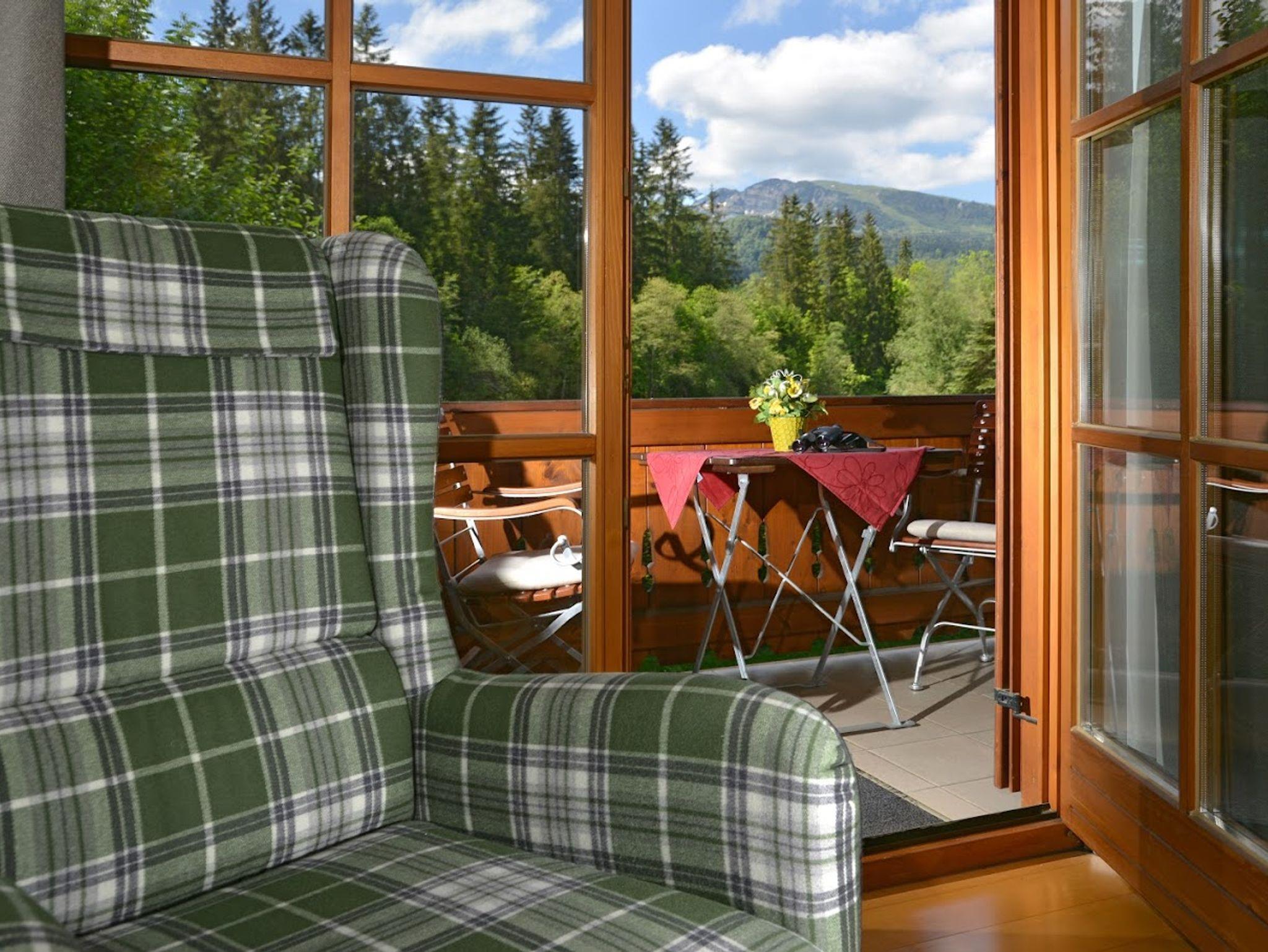 Genießen Sie die herrliche Sicht vom überdachten Balkon direkt auf den Unterberg und den Zahmen Kaiser. Sitzmöbel und Liegestühle warten hier auf Sie.