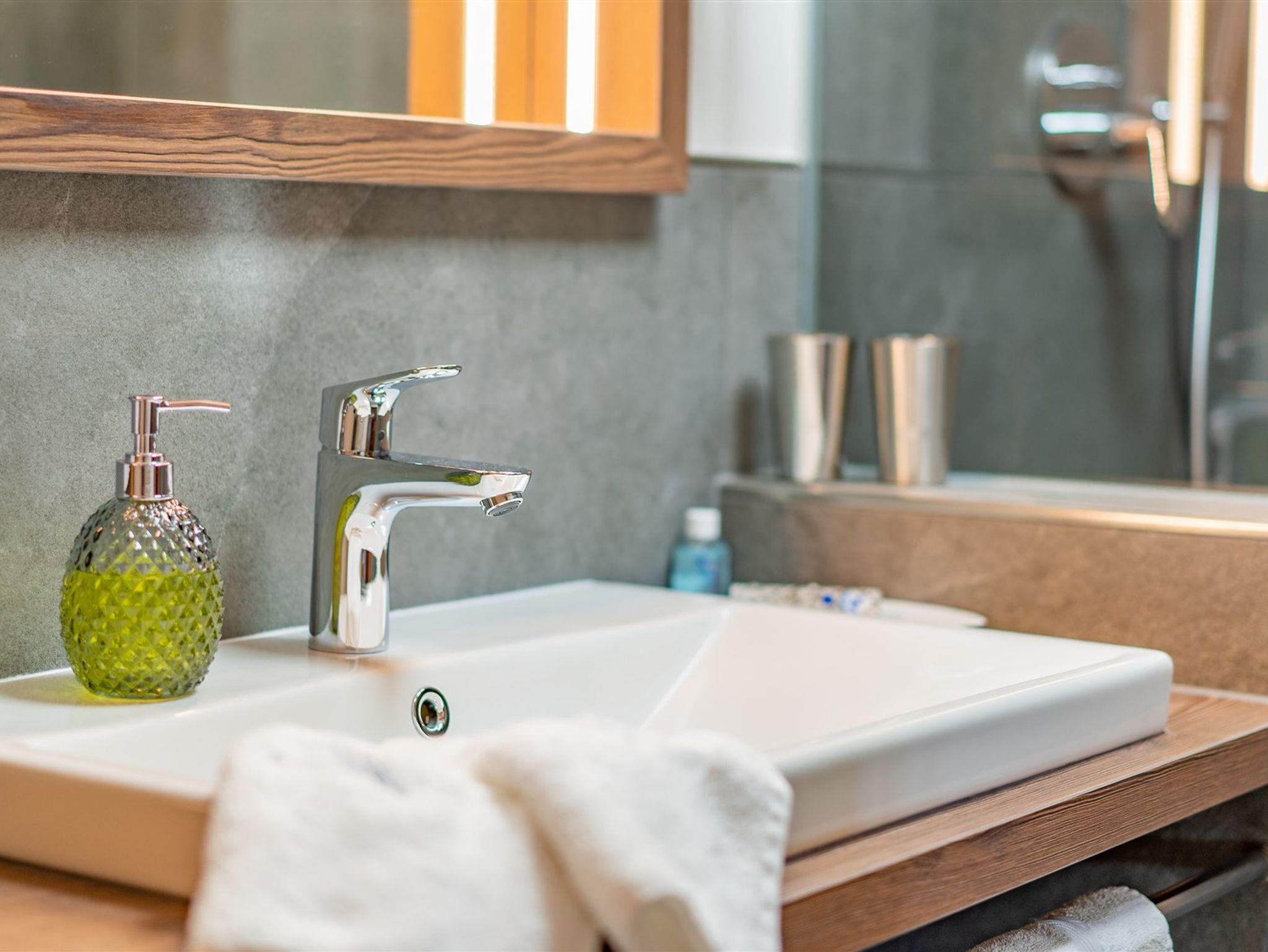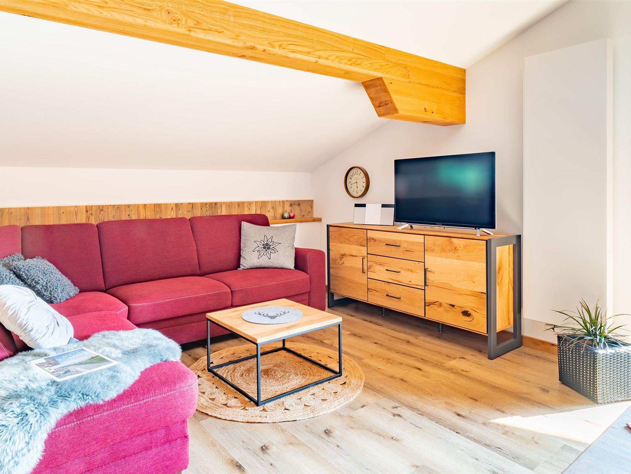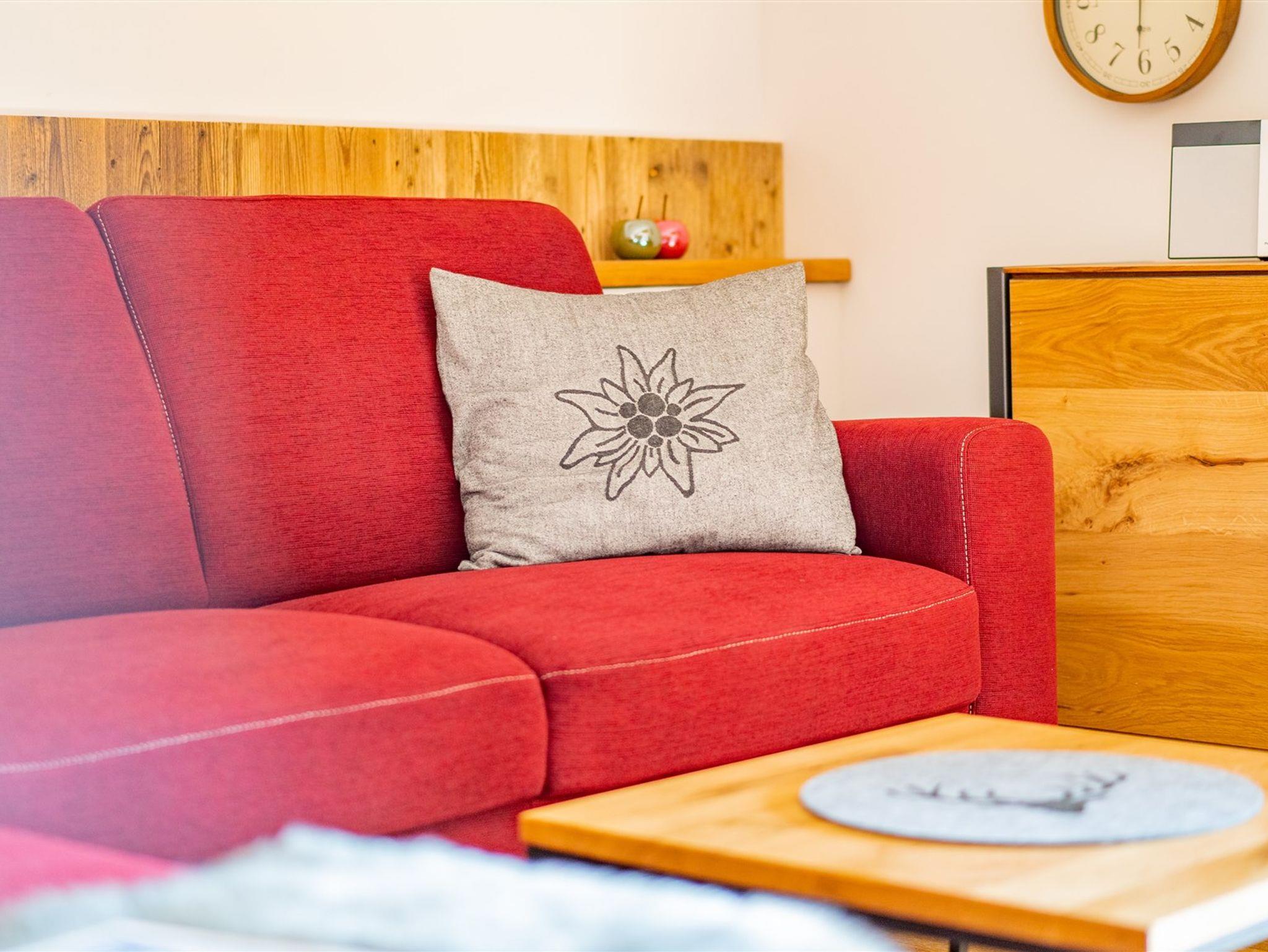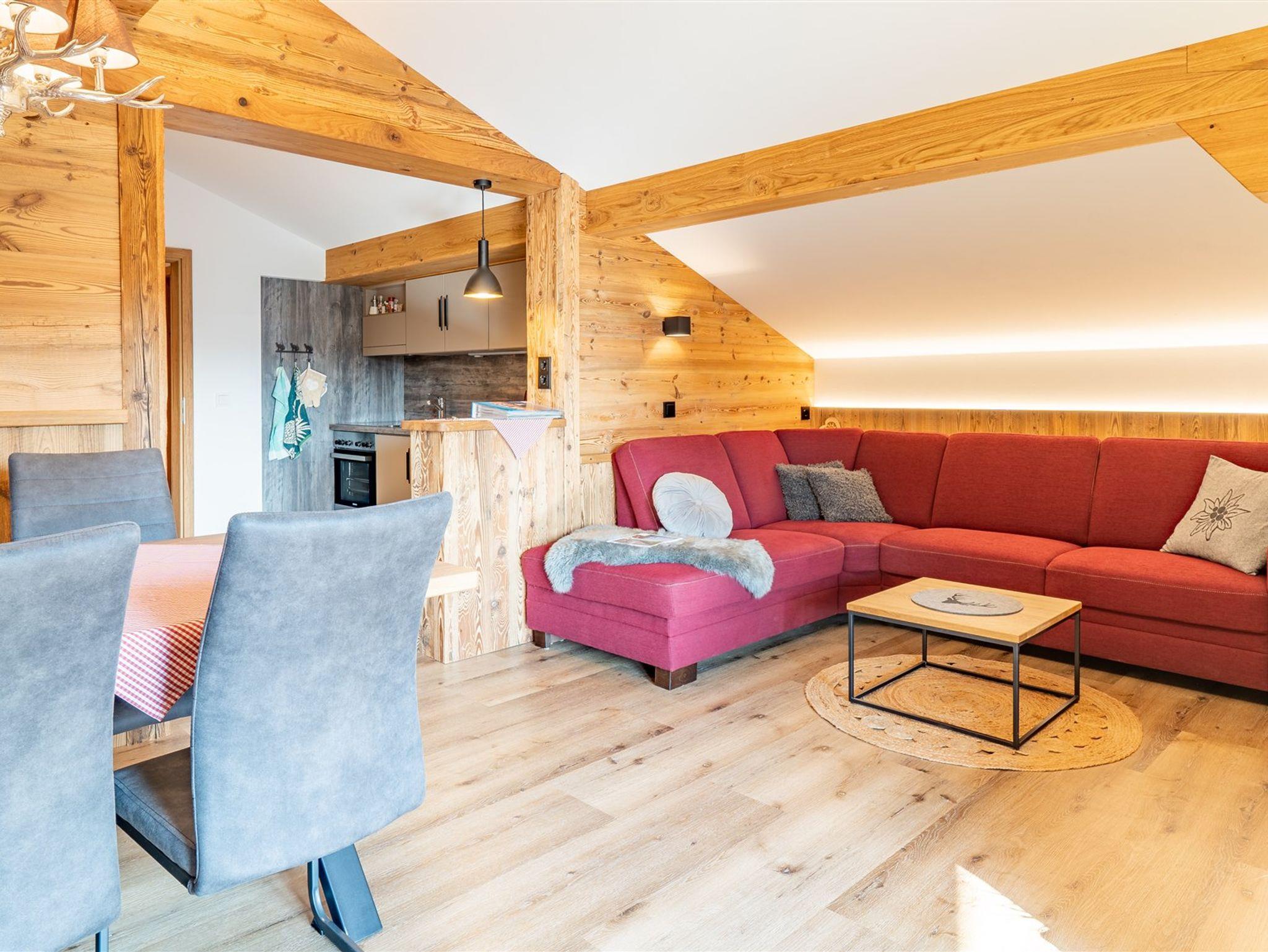 Topmoderne F*****Sterne DTV Dreiraum-Familienwohnung Edelweiß mit zwei separaten Schlafzimmern und zwei Bädern im Natursteindesign, sowie großzügigem Wohnzimmer mit Eckcouch und Essecke mit Stühlen,einer Schreinerküche (zum Wohnzimmer offen) und Balkon in Südwestausrichtung mit Kaiserblick!