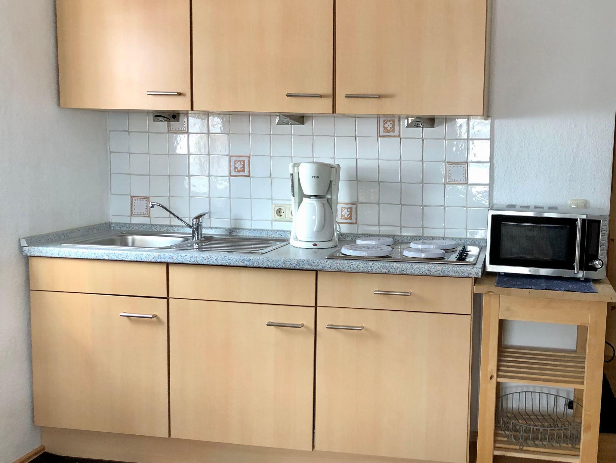 Schöne, gemütliche 2-Raum-Wohnung, Wohnküche, Schlafzimmer, 2 Duschen/WC. Große überdachte Balkonterrasse. Sie haben kostenfreies W-LAN.
