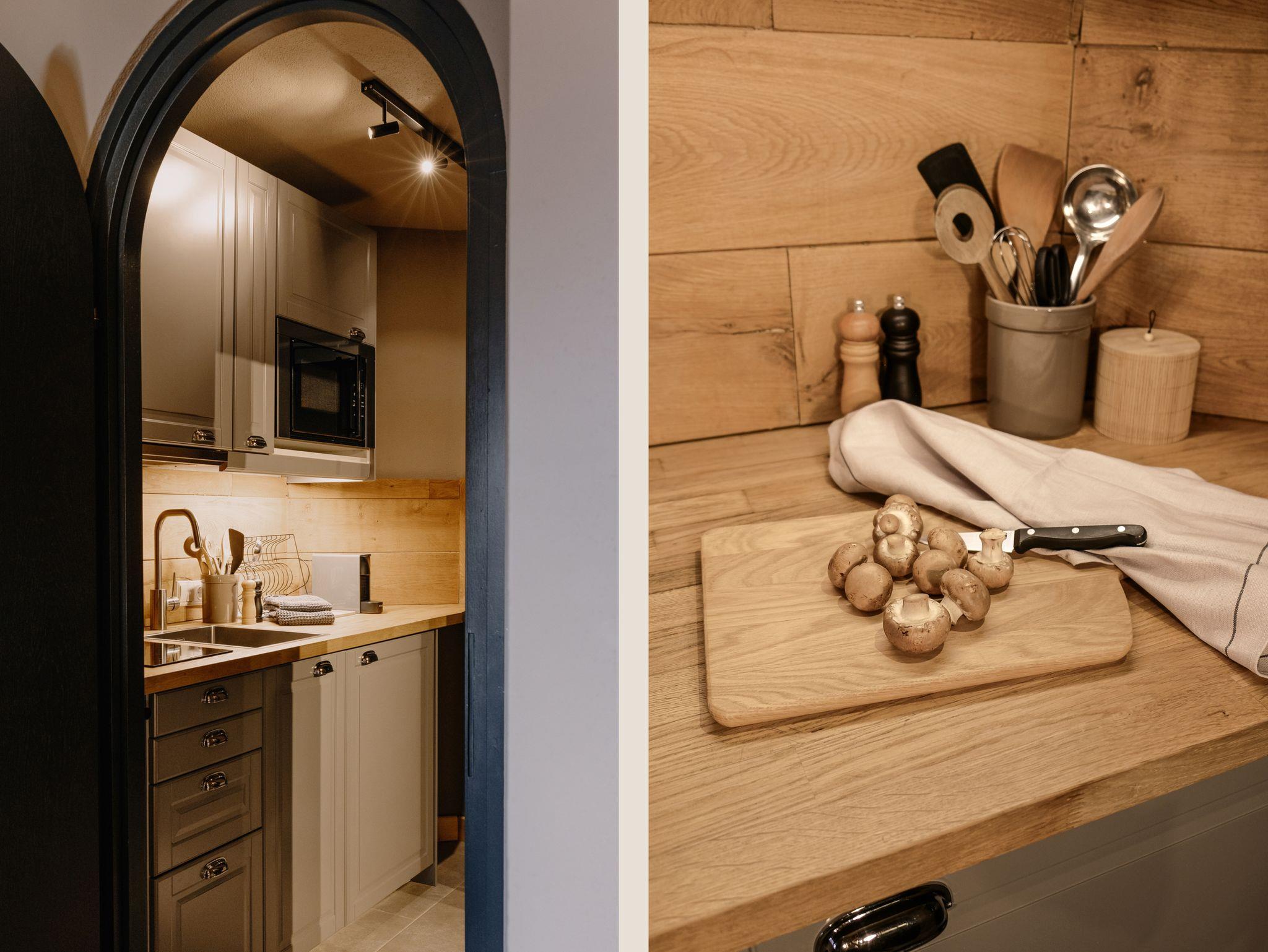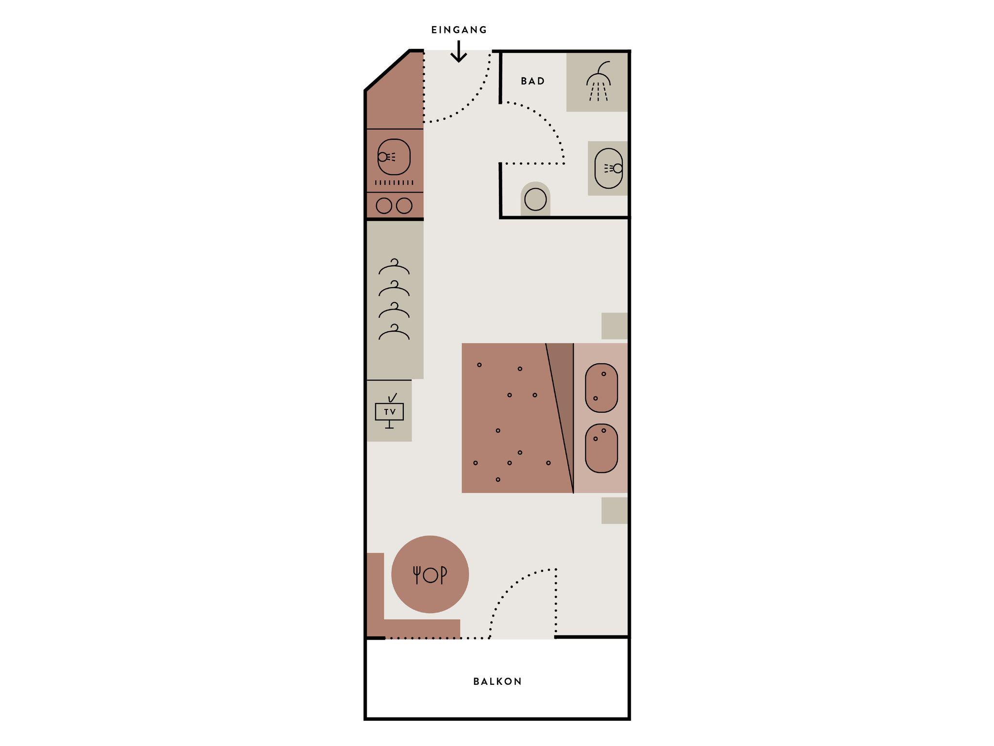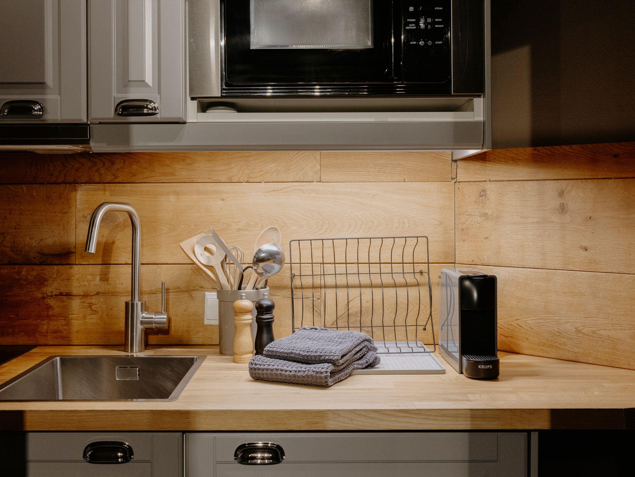 Das kleine Apartment im modernen Landhausstil besteht aus einem kombinierten Wohn-Schlafraum mit Doppelbett (180x200), Flat-Screen-TV, einem alten Bauernschrank und Holztisch, einer gut ausgestatteten Küchenzeile sowie einem modernen Bad mit Dusche, großem Spiegel und Steinwaschbecken.