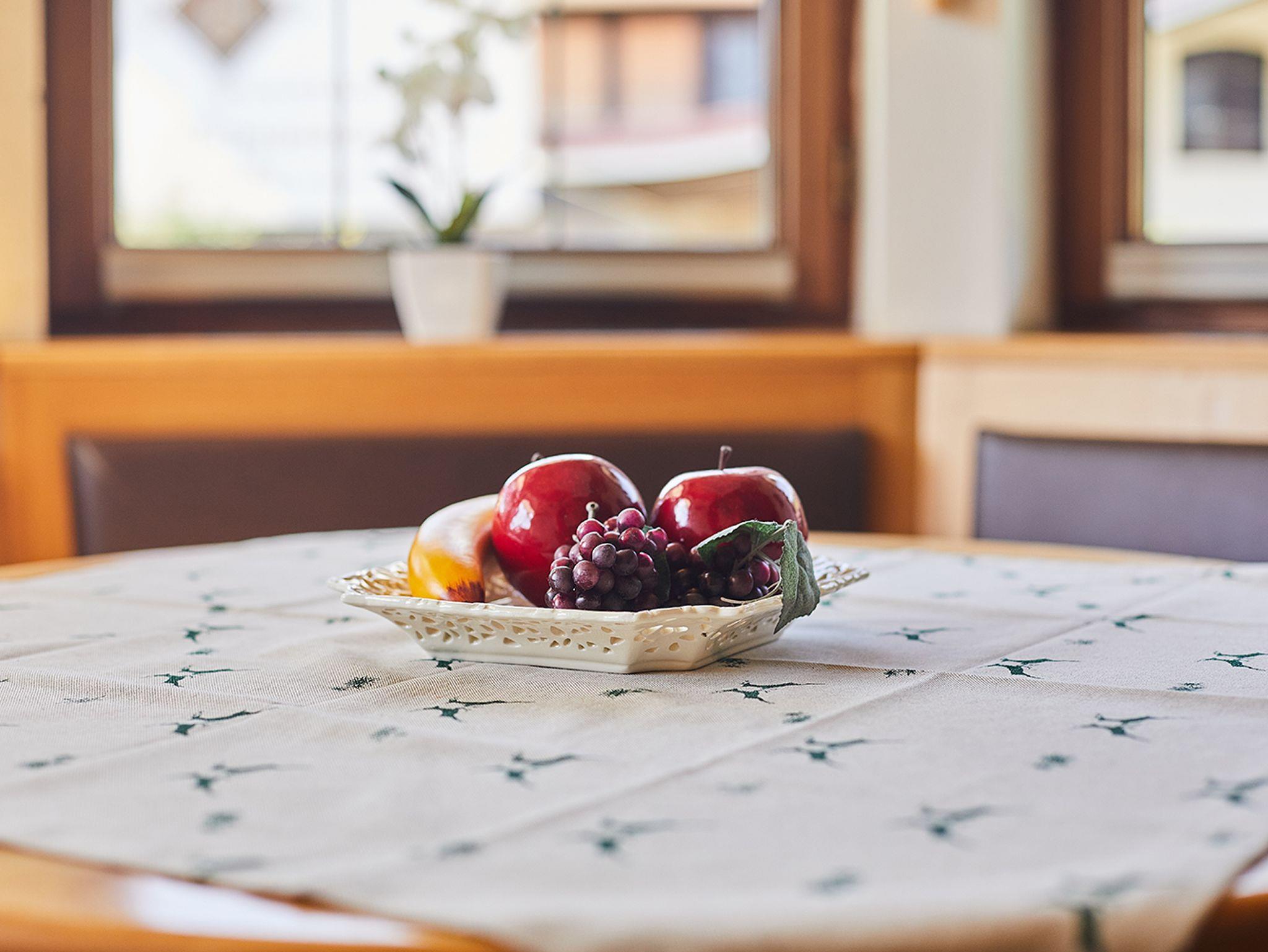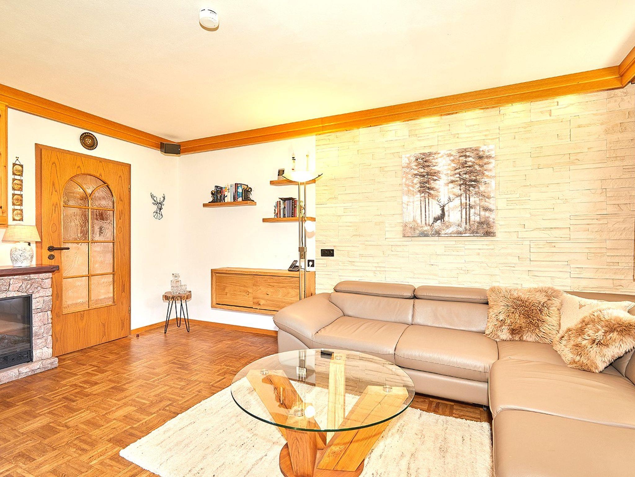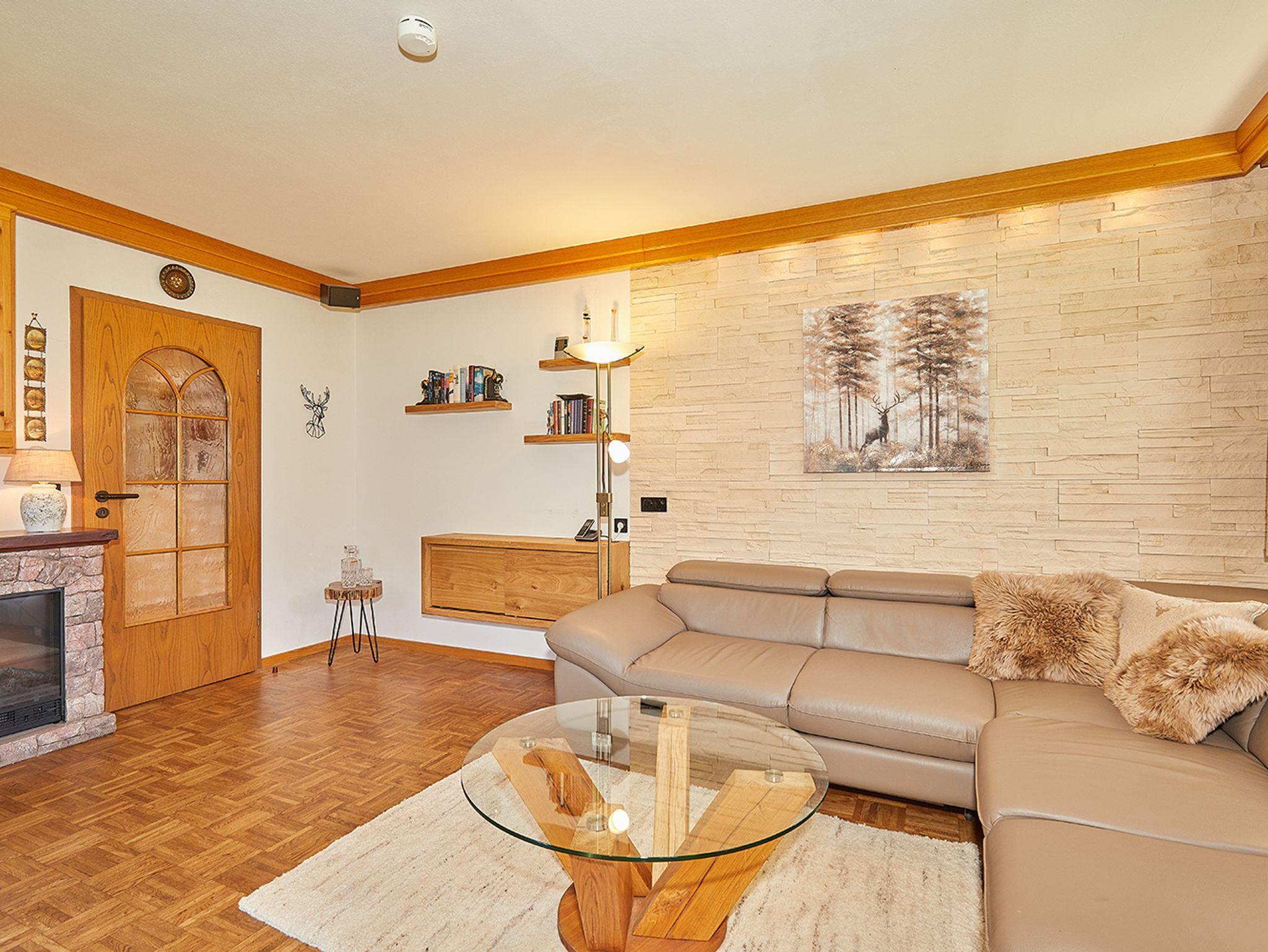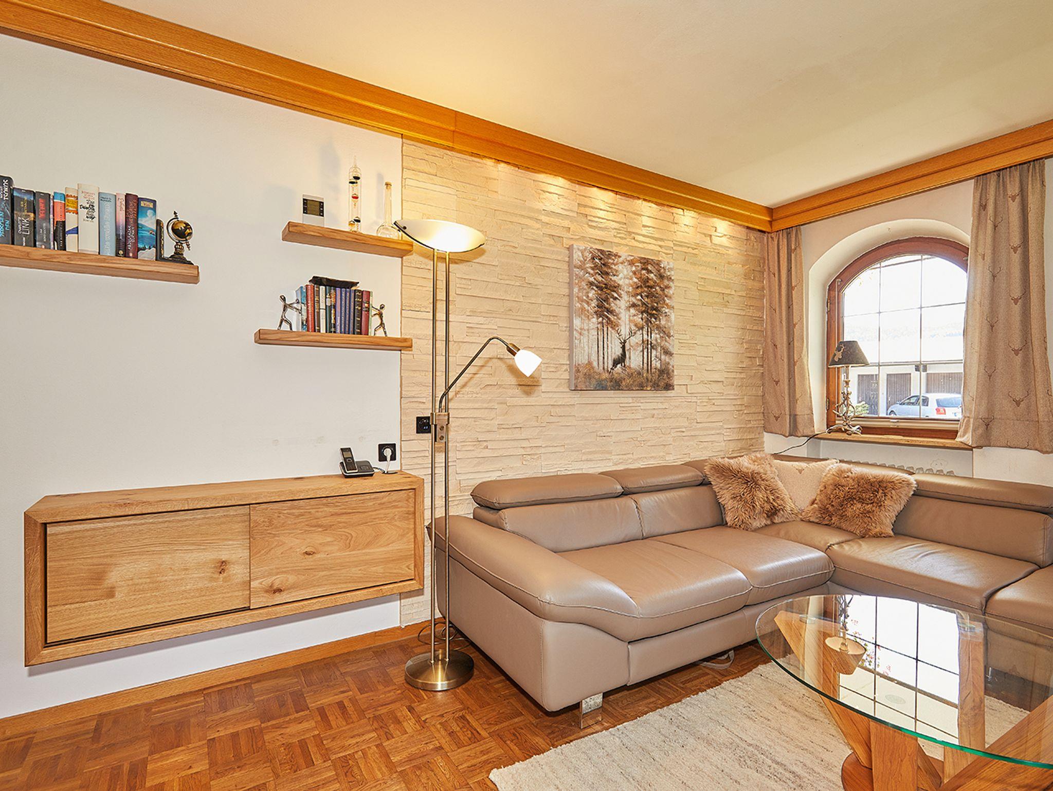 Der Wohnraum verfügt über eine Lederessecke im Erker und ist mit einer modernen Ledercouch, welche zusätzlichen Schlafplatz bietet, sowie einem Kabel-TV, einer Stereoanlage und einem DVD-Player ausgestattet. Weiters gibt es im Raum einen Elektrokamin, welcher besonders im Winter für entspannte Abende sorgt. Nebenan befinden sich eine separate Toilette, sowie die voll ausgestattete Einbauküche, welche keine Wünsche offen lässt. Über eine Wendeltreppe geht es hinunter ins Souterrain, in welchem sich das Schlafzimmer mit bequemen Doppelbett befindet. Die Wohnung verfügt außerdem über ein modernes Badezimmer und eine nach Süden ausgerichtete möblierte Terrasse, die einen herrlichen Blick auf die umliegende Bergwelt bietet und jederzeit zum Verweilen einlädt. Zudem stehen für unsere Gäste eine Sauna, ein Aufenthaltsraum, ein Ski-Raum, WLAN und ein eigener Garagenparkplatz zur Verfügung.