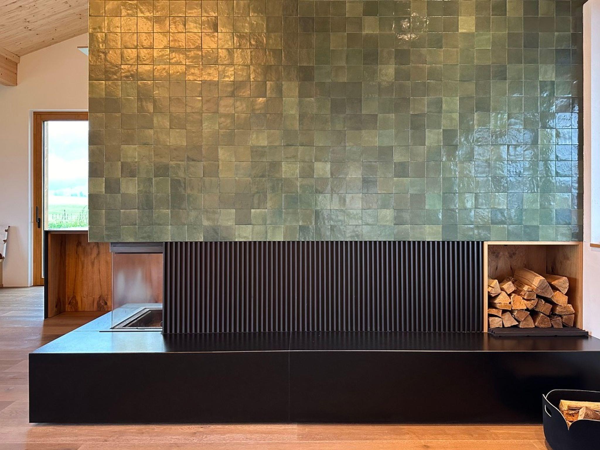 Der Dachstuhl ist komplett sichtbar, ein Kamin (Holz) steht als Raumteiler zwischen den Funktionen von Kochen und Wohnen.
