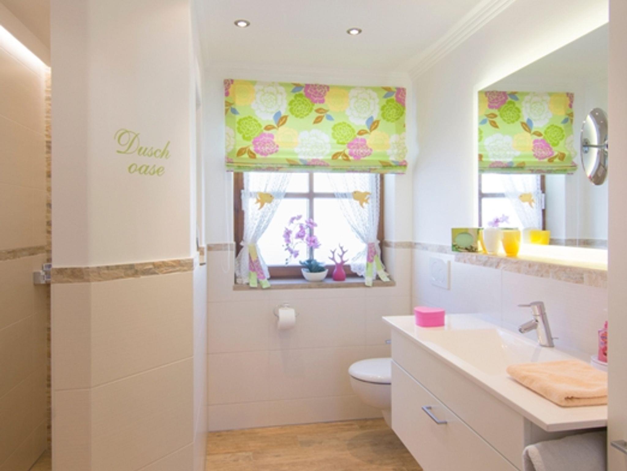 Geräumiges Bad mit Bad/WC und Wellnessdusche, Waschtischanlage und Außenfenster. Großzügige Diele mit Bank und Garderobe.