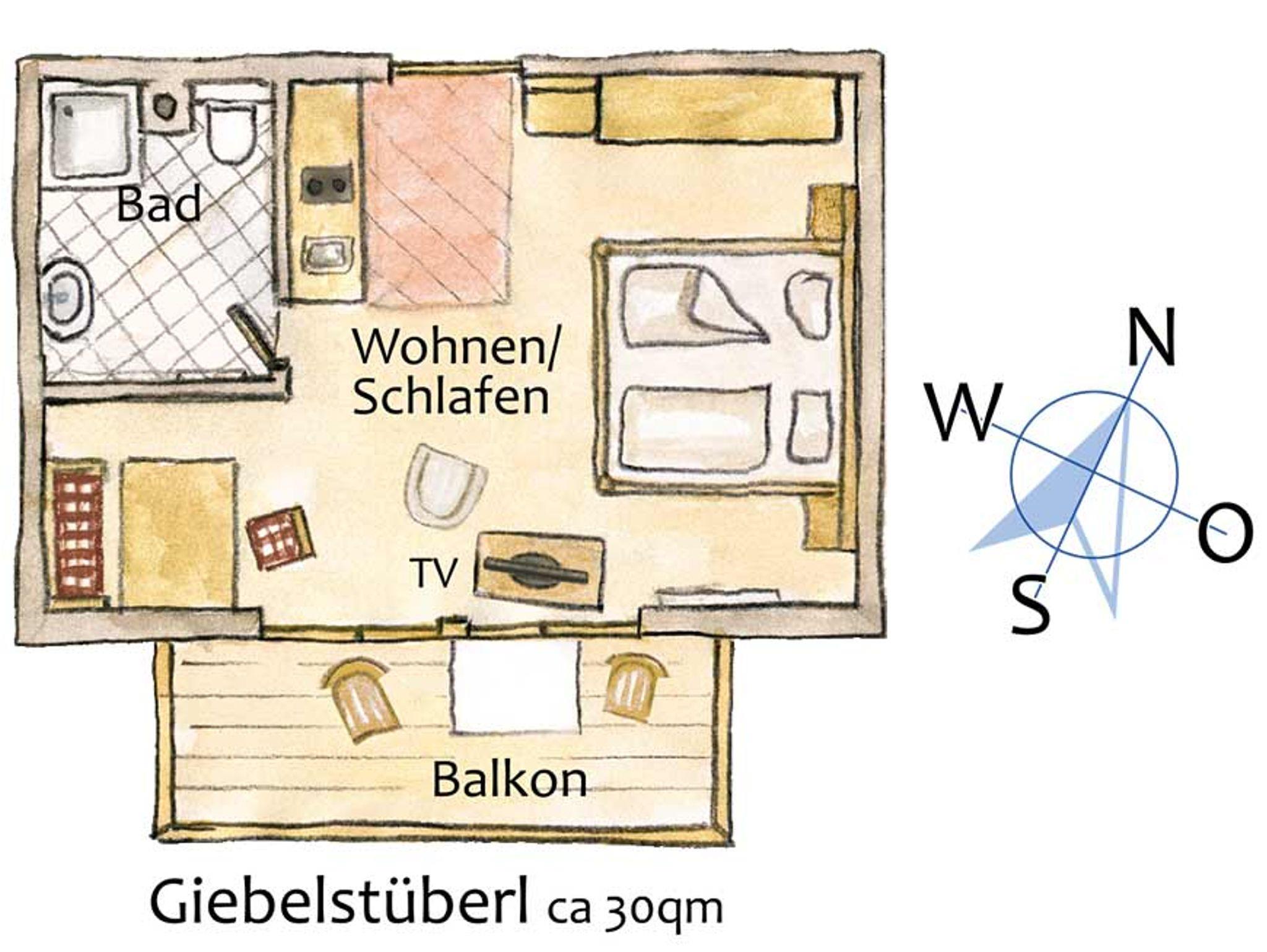 Das großzügige 1-Zimmer-Appartement Giebelstüberl für 2 Personen im Dachgeschoß hat eine Größe von ca. 30 m². Der große Südbalkon bietet freien Blick zum Fellhorn. An der gemütlichen Essecke im Wohnraum können Sie die selbst zubereiteten Mahlzeiten genießen. In der Kochnische lassen sich kleine Mahlzeiten zubereiten. Allergikergerecht wurde in der gesamten Wohnung hochwertiges Echtholz-Parkett verlegt. Bettwäsche und Handtücher sind ausreichend vorhanden und werden nach Ihren Wünschen gewechselt. Für den Fernsehabend steht Ihnen ein großes Fernsehgerät zur Verfügung. Das Duschbad im App. Giebelstüberl wurde komplett renoviert. In unseren Badezimmern bekommen Sie keine kalten Füße! Dafür sorgt die ganzjährig beheizte Fußbodenheizung.