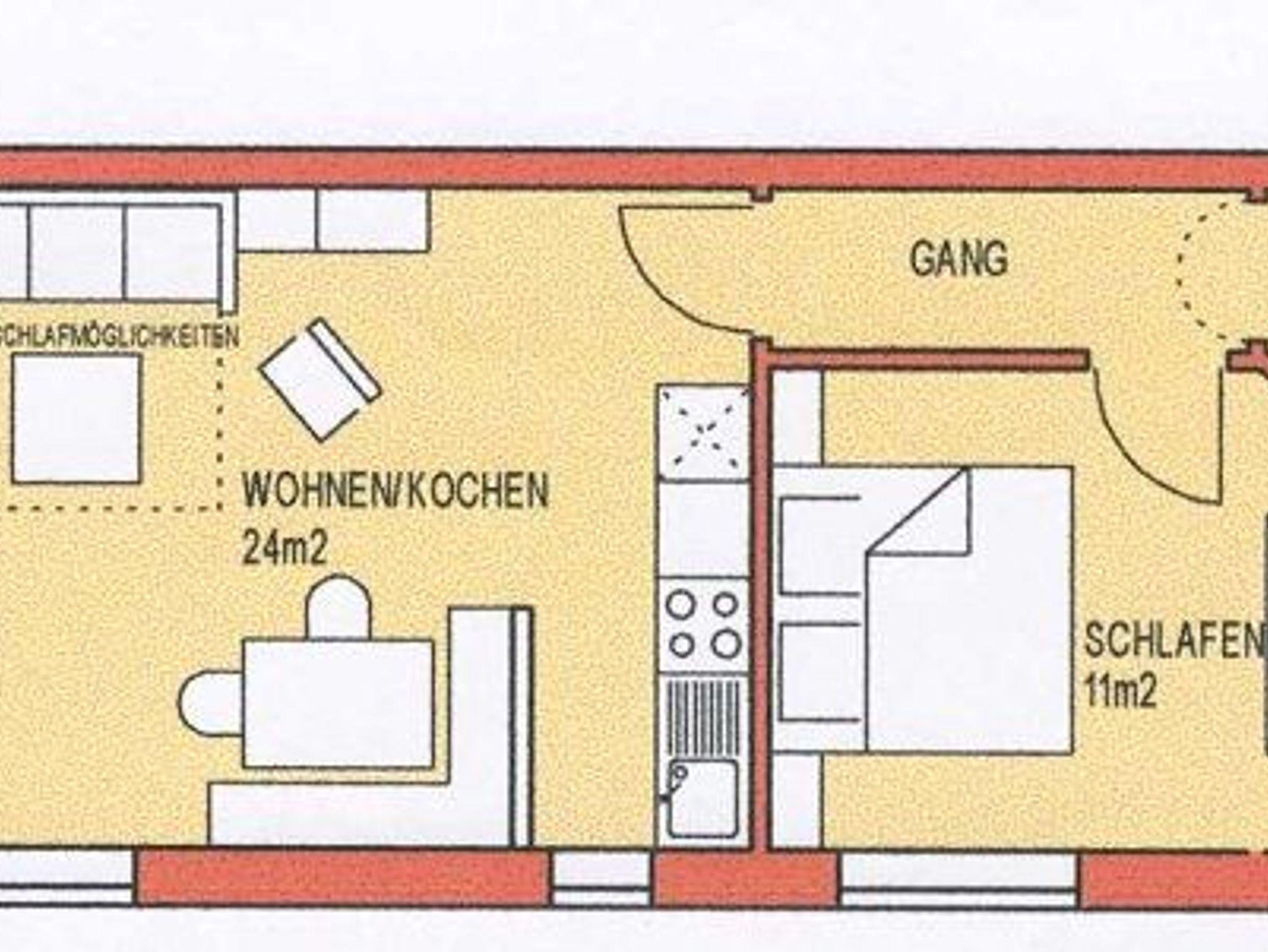 Die gemütliche Zwei-Raum-Ferienwohnung für 2-3 Personen hat eine Größe von 45 m². Die Wohnung verfügt über einen separaten Eingang. Im gemütlichen Wohnraum ist eine Küchenzeile sowie eine Essecke integriert. Die Couch kann für eine weitere Personen aufgebettet werden. Das Extra-Schlafzimmer ist mit einem Doppelbett Breite 1,80m ausgestattet. Das Bad verfügt über eine Dusche und WC.