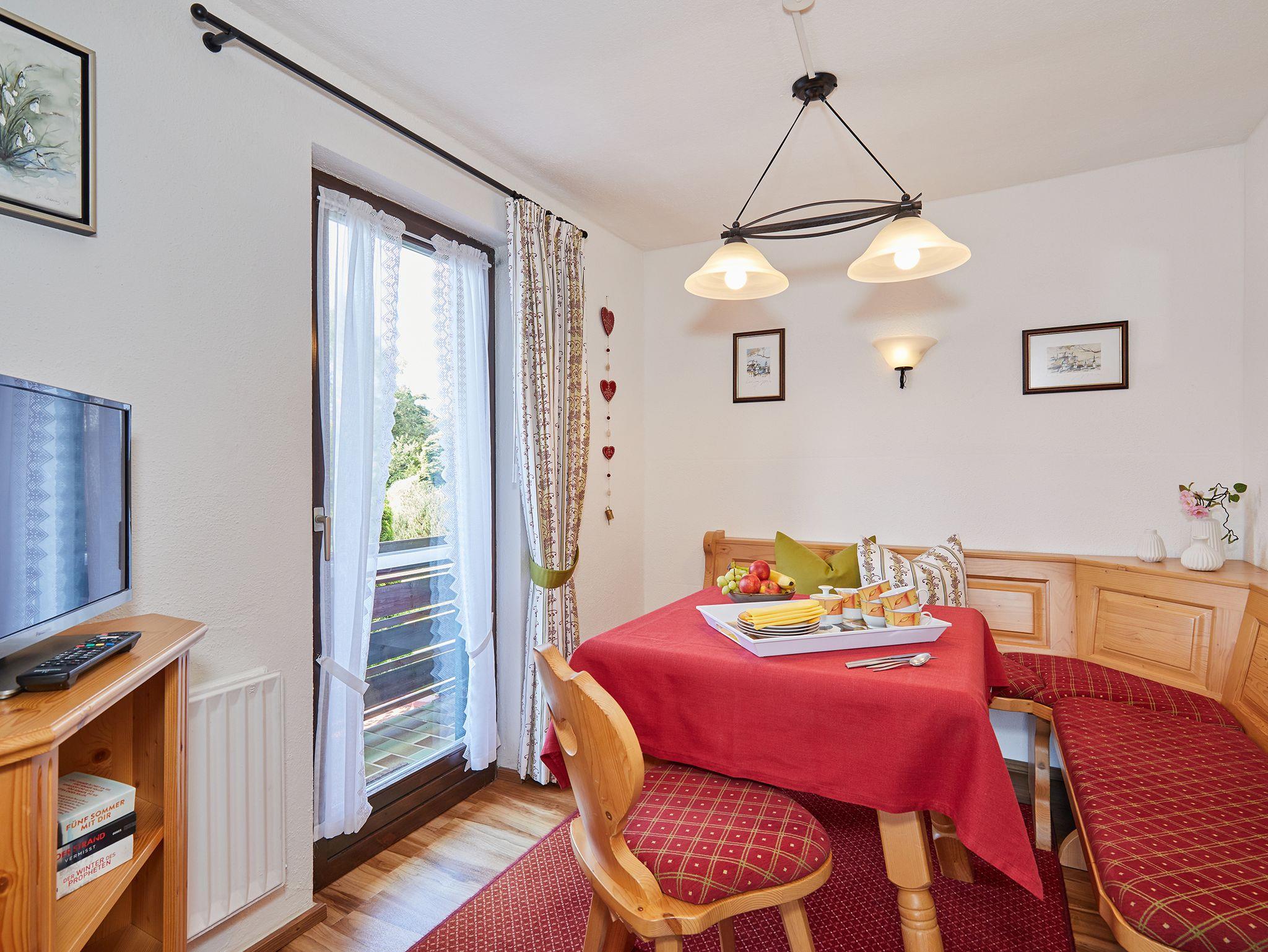 Unsere umfangreich renovierte, gemütlich, liebevoll und komfortabel im Landhausstil neu eingerichtete Wohnung Bergblick befindet sich im 1. OG. Von Ihrem Südost-Balkon haben Sie einen wunderschönen Blick auf Reit im Winkl und die umliegenden Berge. Der gemütlich eingerichtete Wohnraum mit einer Eckbank und einer komfortablen Couch ist mit Flachbild-TV, DVD-Player sowie Stereoanlage ausgestattet. Die separate kleine Küche ist komplett ausgestattet (Mikrowelle, Kühlschrank mit Gefrierfach, Toaster, Wasserkocher). Leckere Schmankerl lassen sich dort gut zubereiten. Das Schlafzimmer ist mit einem Doppelbett (verstellbaren Lattenroste und Bandscheibenmatratzen) eingerichtet. Bettwäsche und Handtücher werden gestellt.
