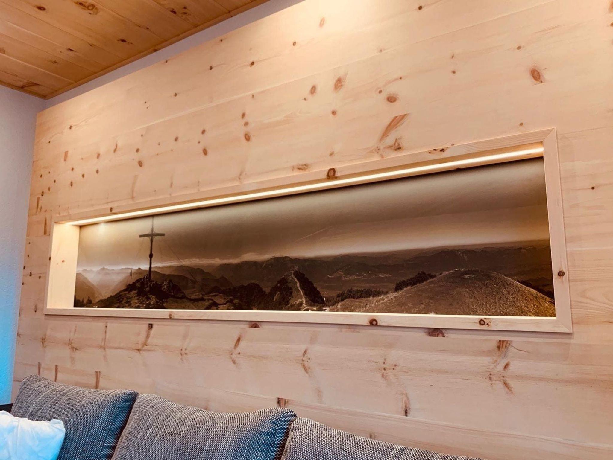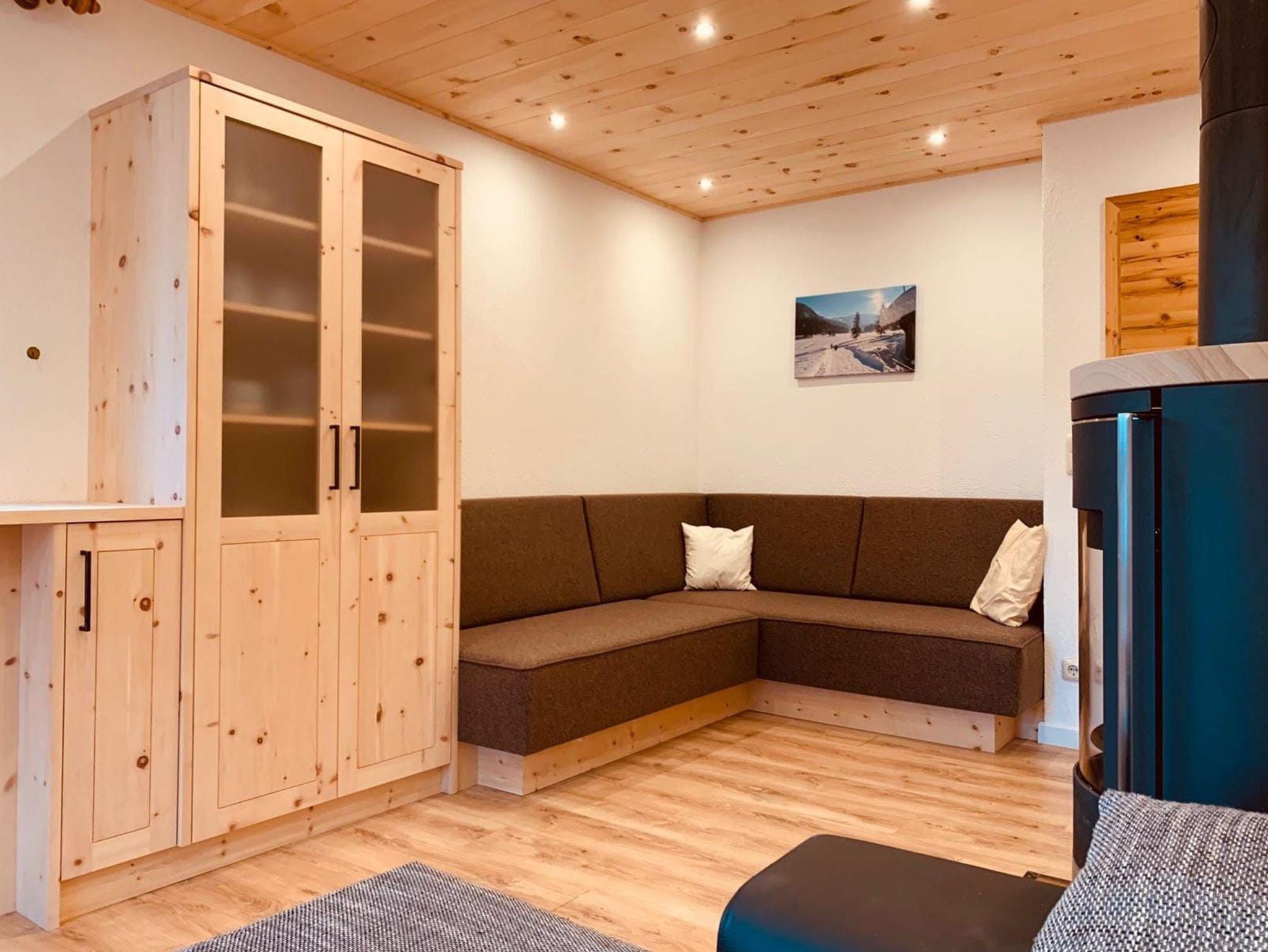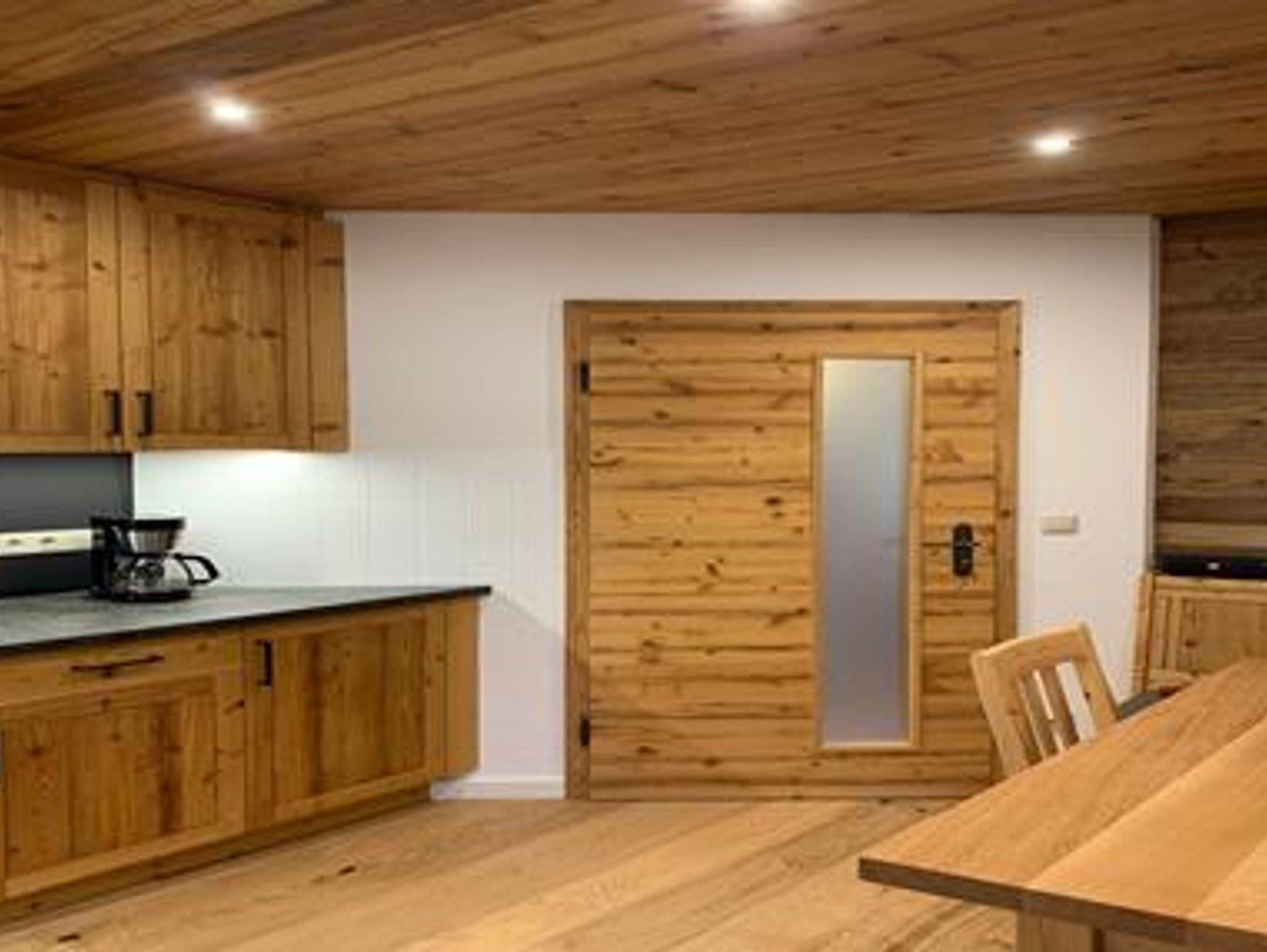 Wohnzimmer, Küche, Diele und Schlafzimmer sind komplett mit Zirben- und Altholz ausgestattet. Es gibt zudem neue Gartenmöbel.