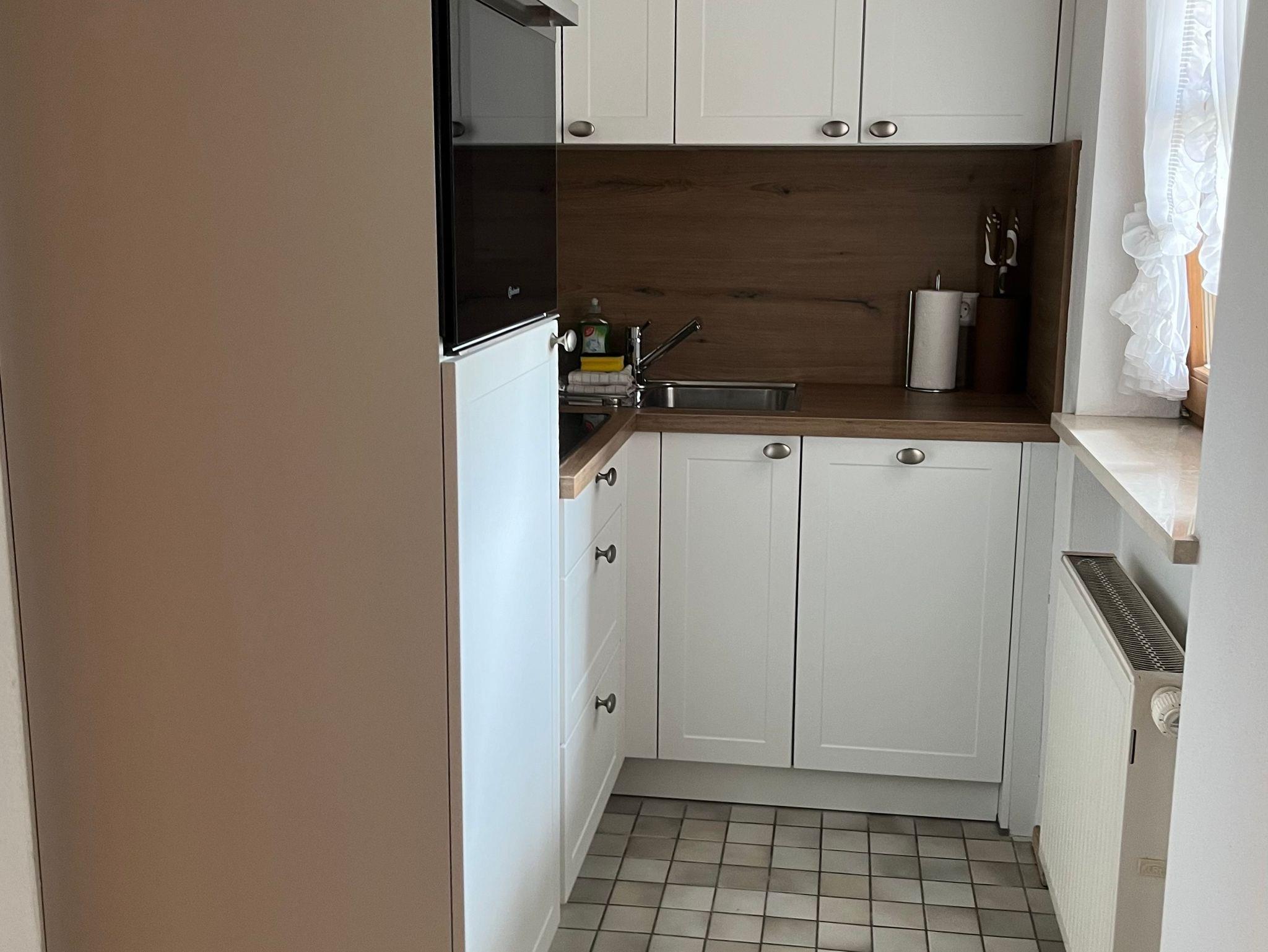 Komfortable Ferienwohnung für bis zu 3 Personen mit extra Schlafzimmer und kleiner moderner, voll ausgestatteter Küche sowie ausziehbarem Doppelbett im Wohnbereich, einem extra Schlafzimmer und Badezeimmer mit Badewanne/Dusche