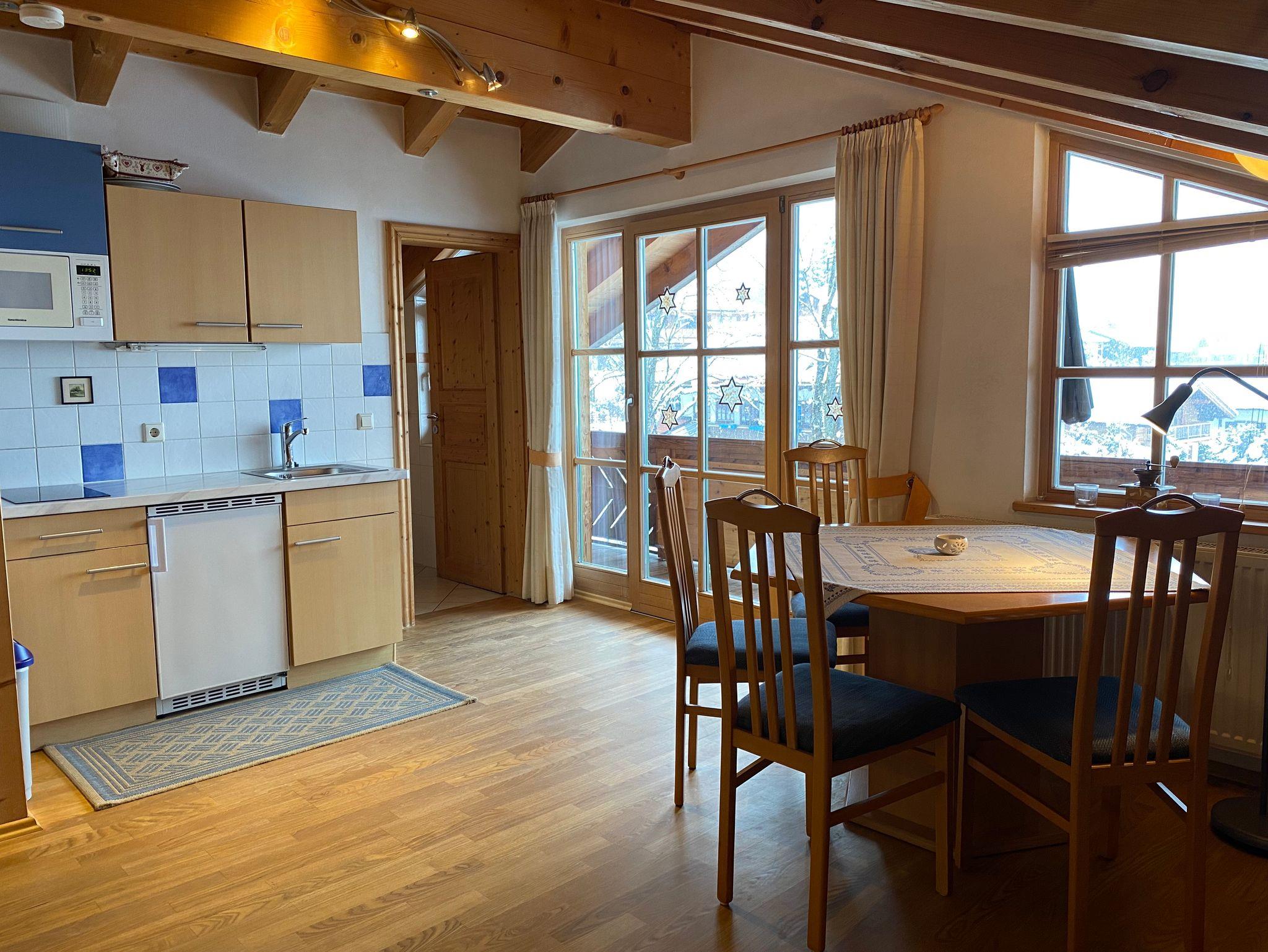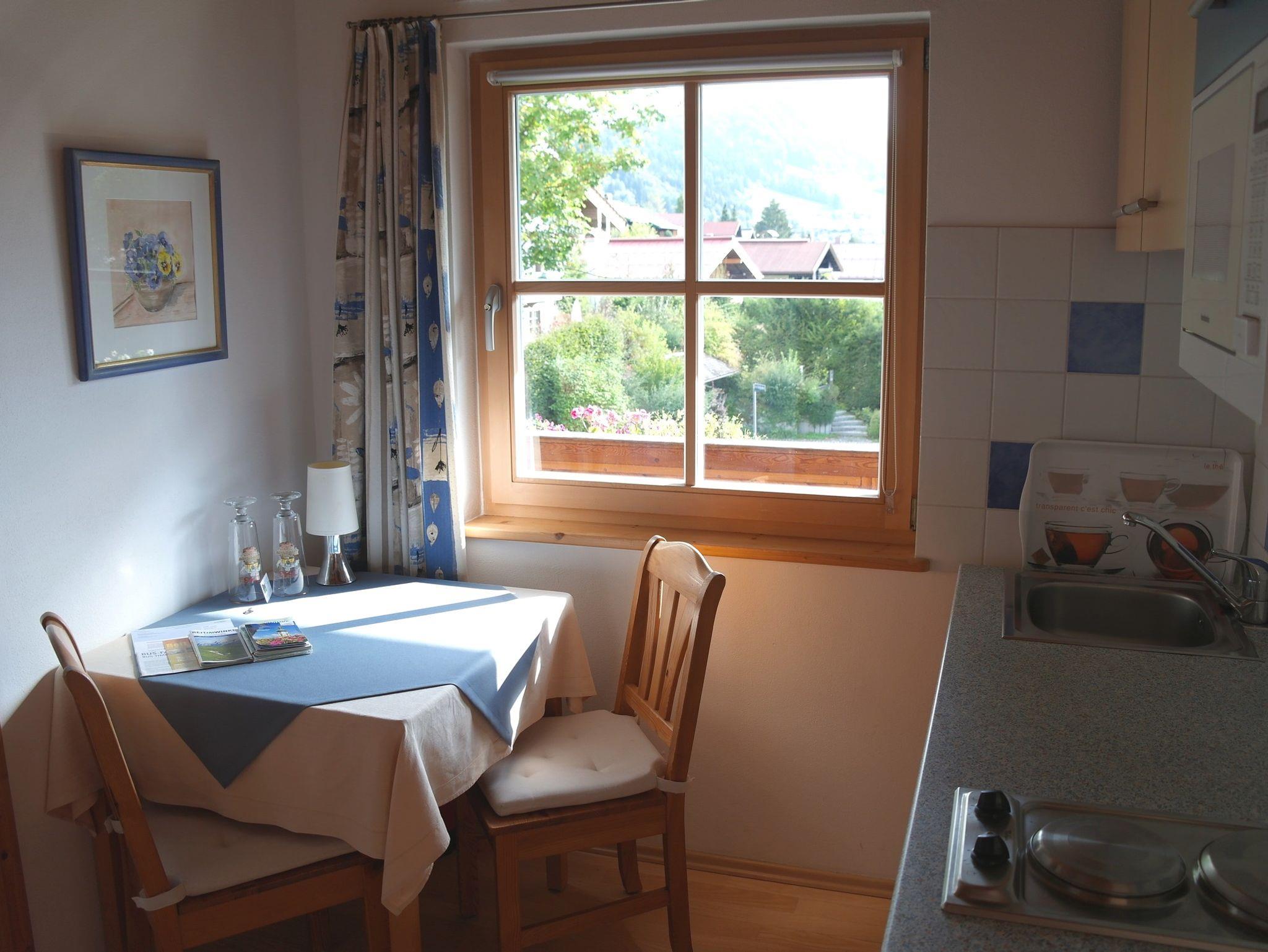 Die nach Osten und Süden orientierte Wohnung im 1. Stock bietet Platz für 2 Personen. Sie verfügt über einen Wohn-/Schlafraum mit Doppelbett, eine kleine Wohnküche mit gut ausgestatteter Küchenzeile, Tisch und Stühlen. Auf dem großen Balkon warten Stühle, ein großer Holzklapptisch und Sonnenschirm sowie ein sehr schöner Ausblick auf den Ortskern und die umliegenden Berge auf unsere Gäste.