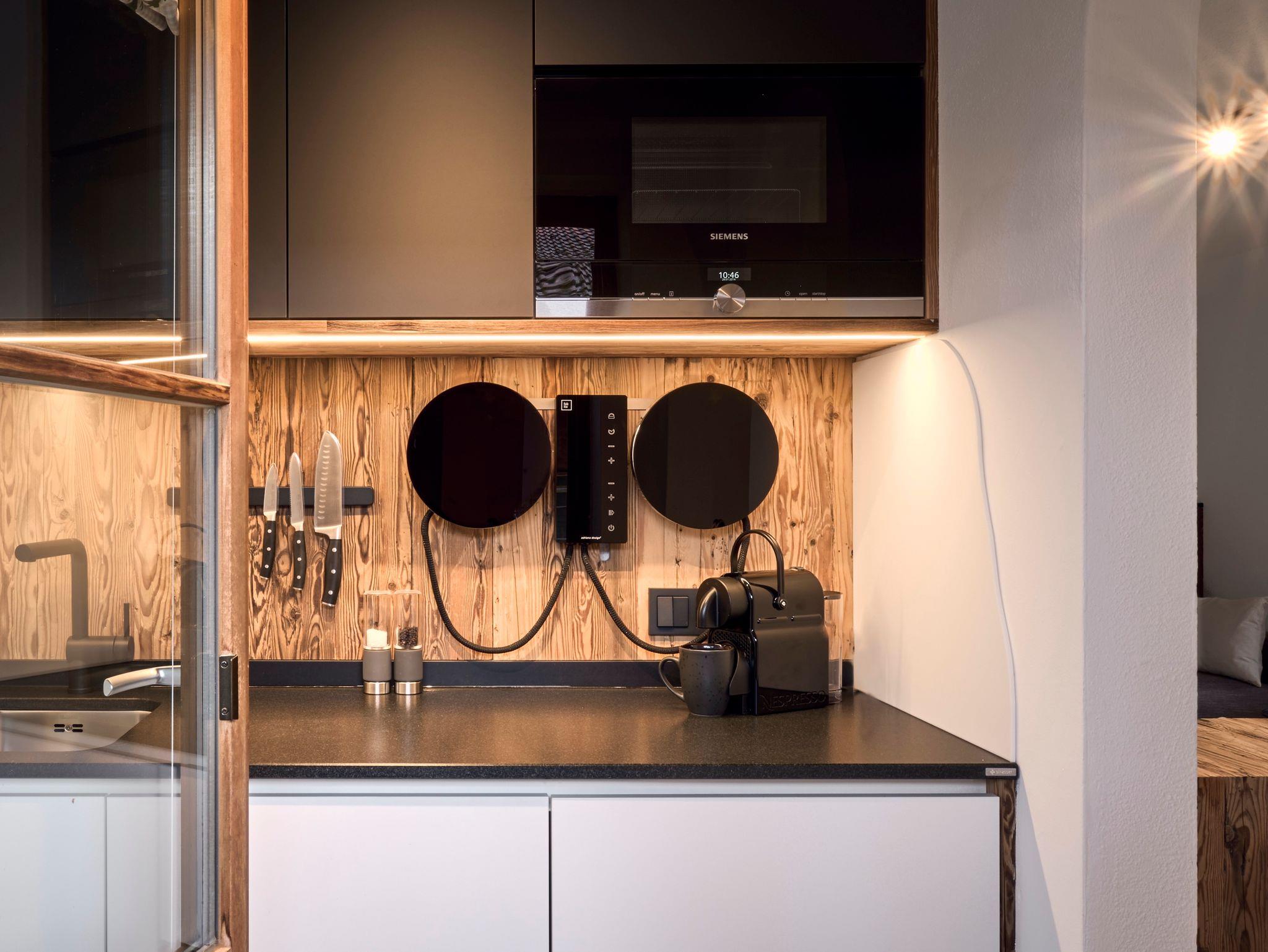 Die kleine, aber feine Küche erlaubt das vollwertige Kochen auf kleinstem Raum – dank 2-Platten-Induktionsherd, vollwertigem Kühlschrank und kombinierter Mikrowellen-/Grilleinheit. Auf Eurer eigenen Terrasse oder Balkon (*je nach Lage des alpstyle plus) könnt ihr auf 10-15 qm bei entsprechendem Wetter ein wohltemperiertes Gläschen aus dem separaten Weinkühlschrank genießen.