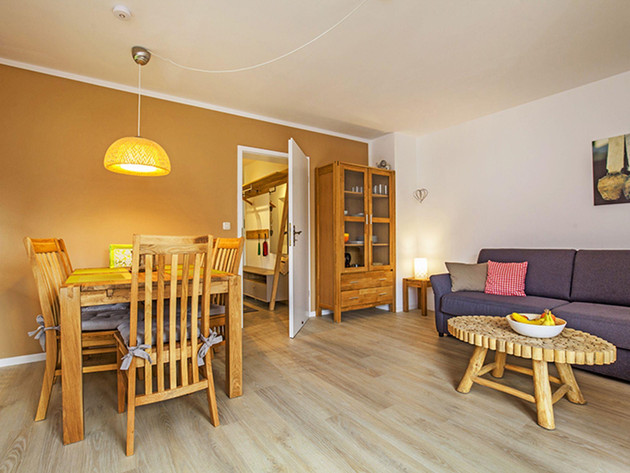 Die Wohnung ‚Schmankerl' wurde 2022 renoviert, dabei wurden auch alle Möbel erneuert. Der moderne, hochwertig eingerichtete Wohnbereich strahlt ein angenehmes Wohngefühl aus und verfügt über einen Essbereich und eine große, komfortable Sofagarnitur. Die neue, vollausgestattete Einbauküche ist unter anderem mit Induktionsherd, Spülmaschine, Mikrowelle, Kaffeemaschine, Toaster, Wasserkocher, ausgestattet und lässt keine Wünsche offen. In einem der Schlafzimmer befindet sich ein bequemes Doppelbett, während das andere mit einem ausziehbaren Doppelbett ausgestattet ist. Bei Bedarf stehen auch ein Kleinkindbett und ein Hochstuhl zur Verfügung. Das helle, große Badezimmer verfügt über WC, Dusche und zwei Waschbecken. Zwei gemütliche Balkone laden bei sonnigem Wetter zum Entspannen ein und bieten eine herrliche Aussicht auf die umliegenden Berge.