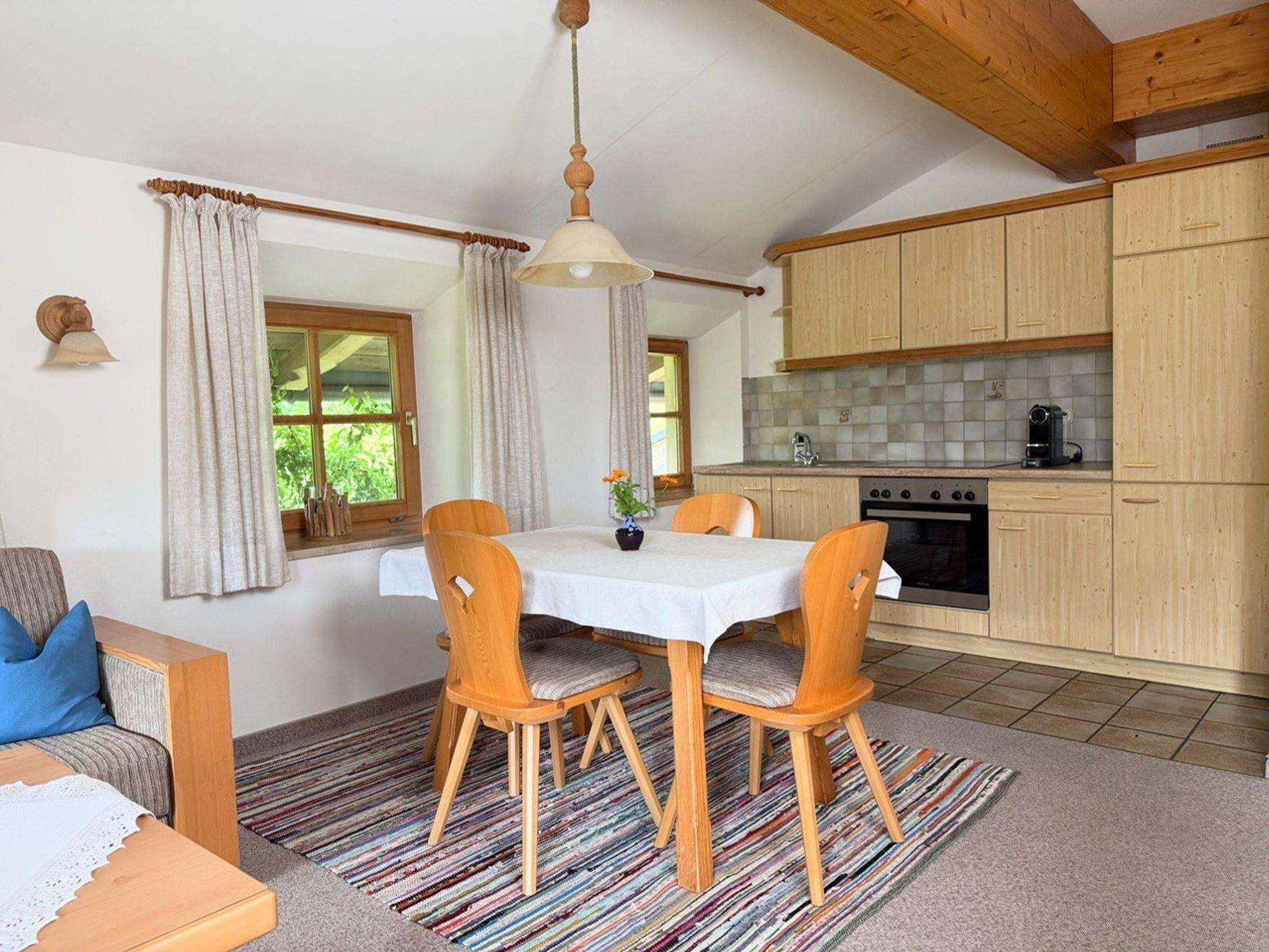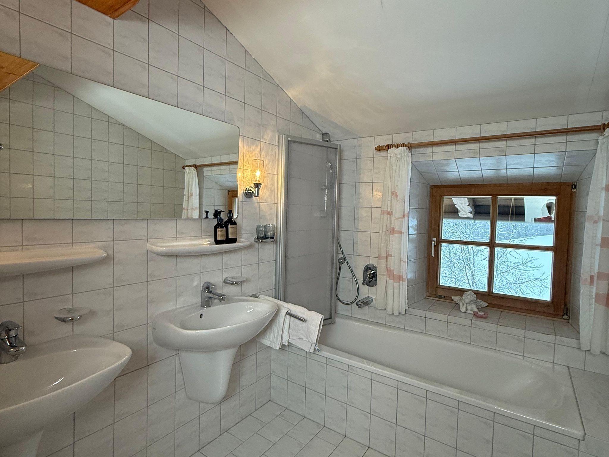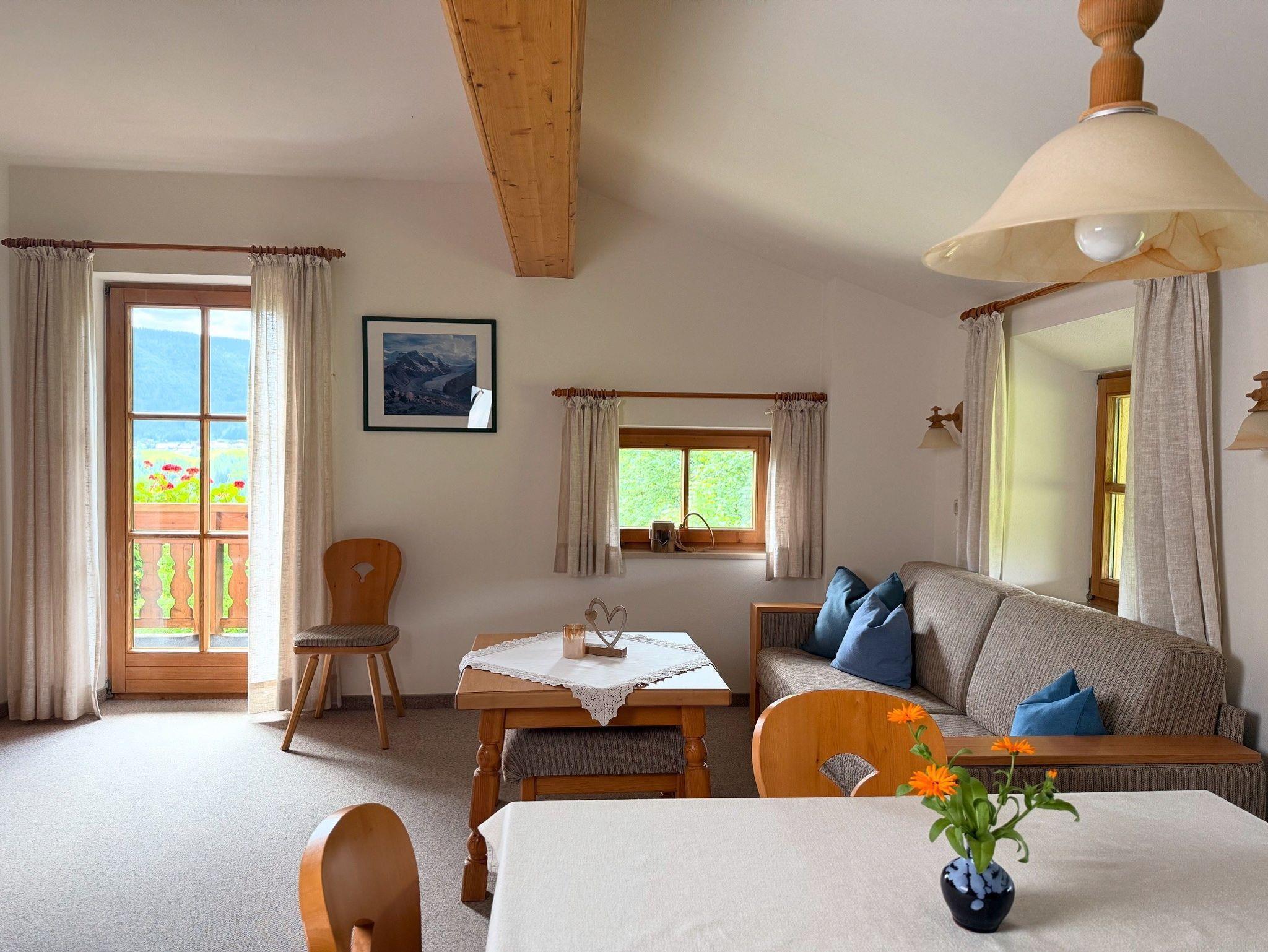 Das helle und großzügig geschnittene Apartment liegt im zweiten Stock und verfügt über einen möblierten Balkon mit Bergblick auf Unterberg, Wilder und Zahmer Kaiser. Es ist ausgelegt für eine Familie mit zwei Kindern oder für vier Personen.