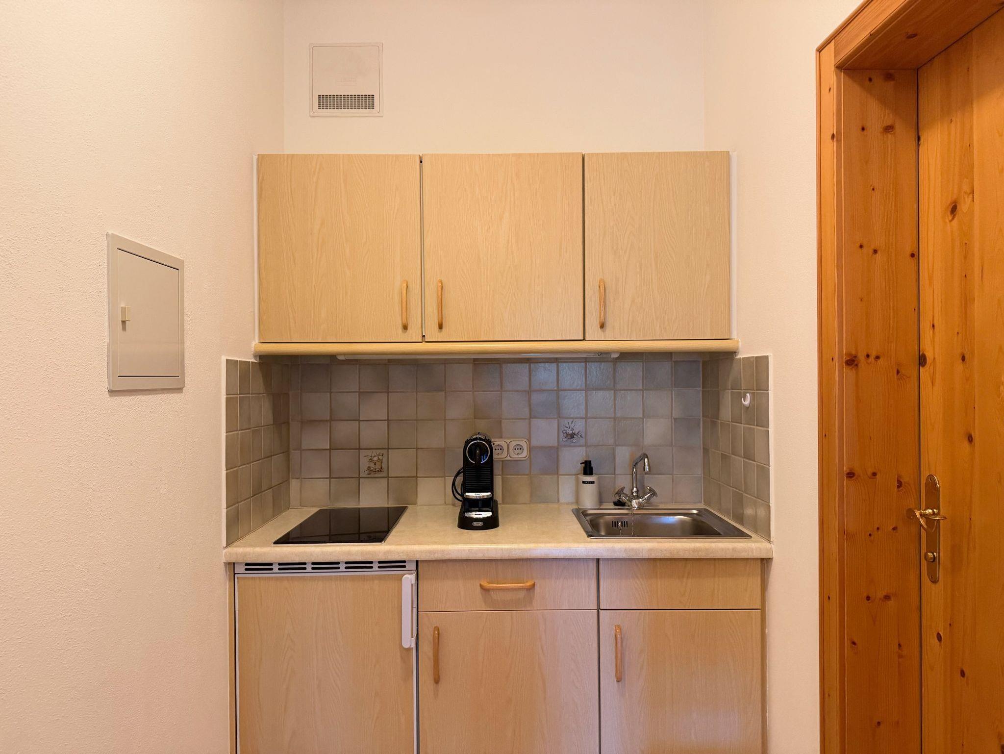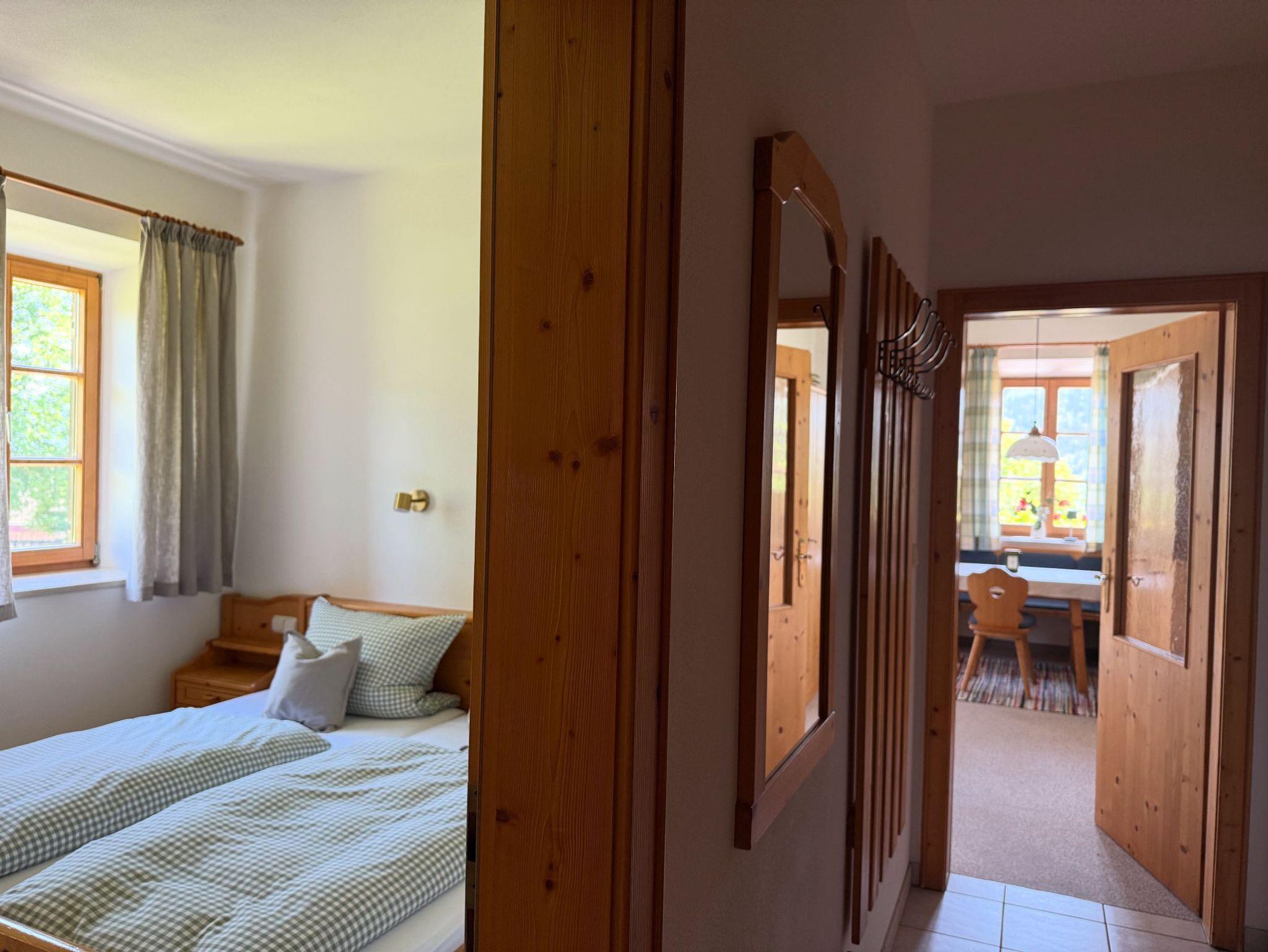 Das helle und großzügig geschnittene Apartment liegt im ersten Stock und verfügt über einen nach Süden ausgerichteten möblierten Balkon mit Bergblick auf Unterberg, Wilder und Zahmer Kaiser. Es ist für zwei Erwachsene oder eine Familie mit ein/zwei kleinen Kindern ausgelegt.