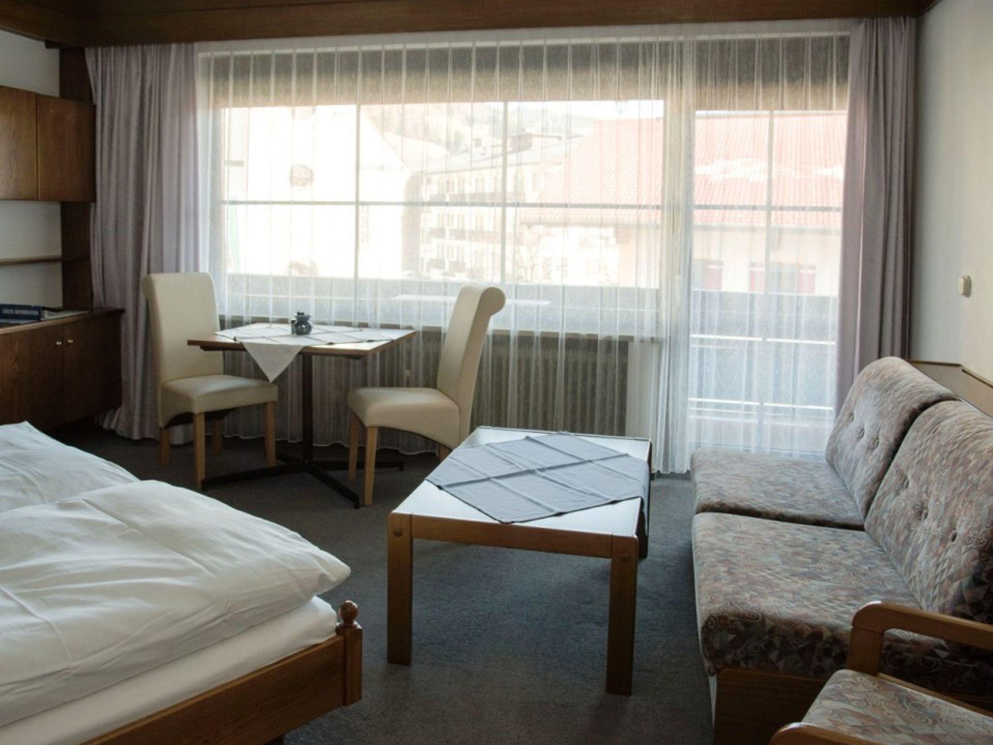 Großer Wohn-Schlafraum mit Doppelbett, gemütliche Sitz- und Essecke, separate Küche und Dusche/WC. Zimmersafe. Vom Ostbalkon mit Morgensonne haben Sie einen Blick zur Kirche und Hausberg.