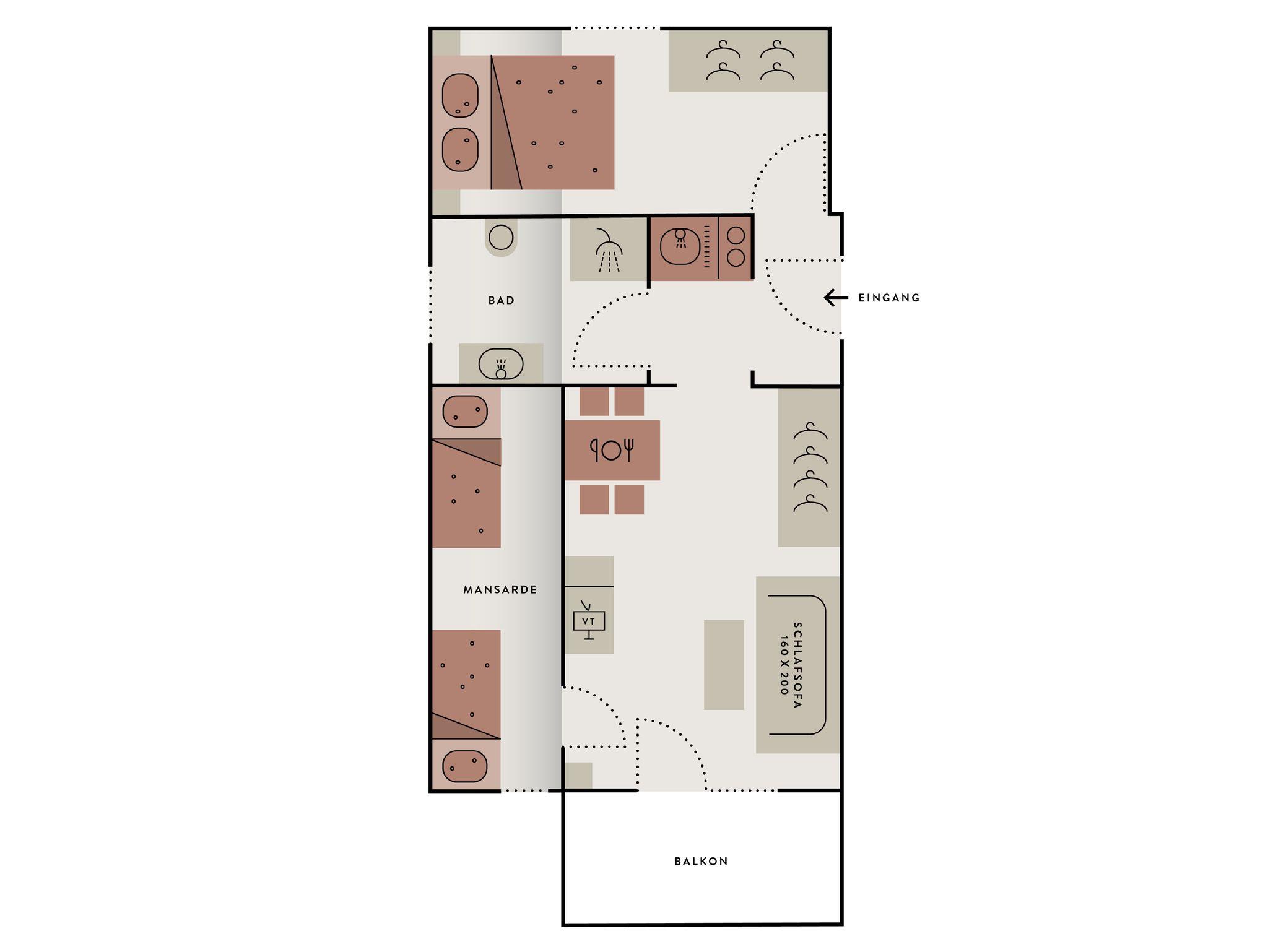 Das nach Süden ausgerichtete Dachgeschoß-Apartment besteht aus einem Wohn-Essraum mit Flat-Screen-TV, Schrank, gemütlicher Sitzecke und Schlaf-Sofa (160x200), einem separatem Schlafraum mit Doppelbett (180x200), Schrank und einem separaten Mansardenraum mit zwei Einzelbetten (90x200), einer kleinen Mini-Küchenzeile sowie Bad mit Dusche.
