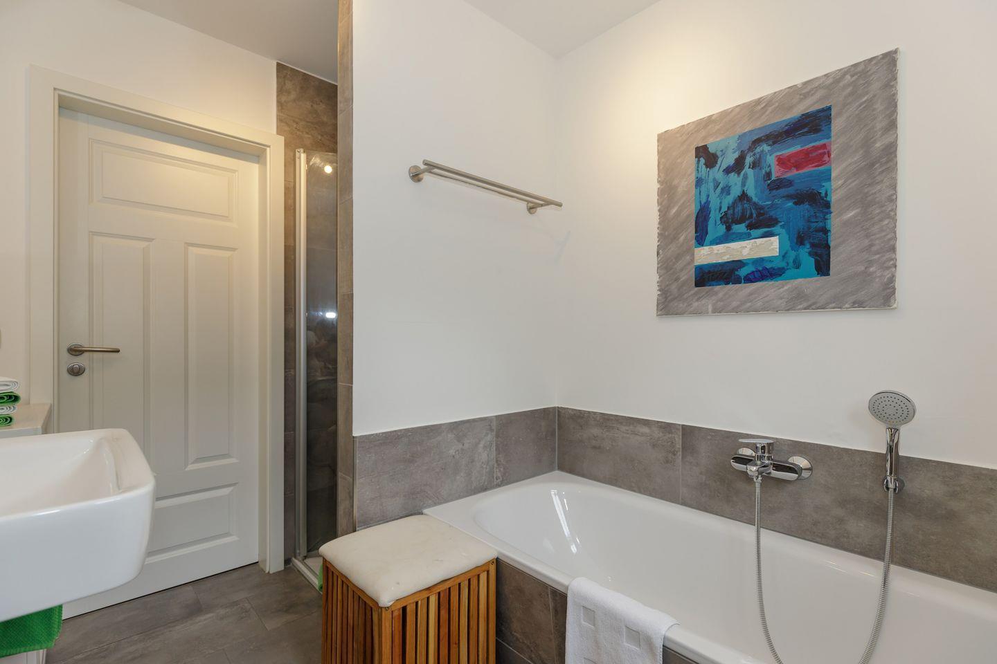 Vier moderne Badezimmer mit bodengleichen Duschen und zwei Bäder zusätzlich mit einer Badewanne bieten Komfort und Funktionalität. Ein Gäste-WC im Erdgeschoß gehört ebenfalls zur Ausstattung.