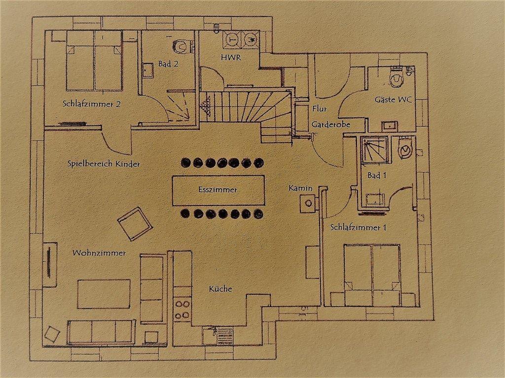 Die offene Küche ist zum Wohnzimmer hin ausgerichtet und vollständig ausgestattet. Neben Herd, Backofen, Kühlschrank mit Gefrierfach, Geschirrspülmaschine, Mikrowelle, klassische Kaffeemaschine mit extra großen Isolierkannen, Wasserkocher und Toaster finden Sie alle notwendigen Küchenutensilien, Geschirr und Besteck. Ein großer Esstisch machen gemeinsame Mahlzeiten und Spieleabende besonders angenehm.
