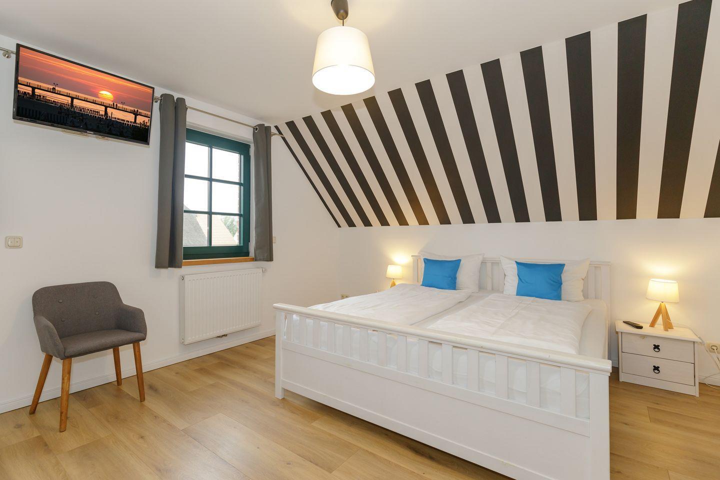 Sieben Schlafzimmer, alle mit Laminatboden ausgestattet, bieten Platz für insgesamt bis zu 14 Personen. Die Räume sind lichtdurchflutet und mit Insekten- und Sichtschutz an allen Fenstern versehen. Nachts sorgen Rolläden für erholsamen Schlaf. Ein gemütliches Wohnzimmer mit Fliesenboden, Sofaecke, Sessel und Fernseher garantiert ein angenehmes Ambiente und unterhaltsame Abende. Für entspannte Stunden sorgen eine HiFi-Anlage, Blu-ray- und DVD-Player sowie eine Auswahl an Büchern und Spielen.