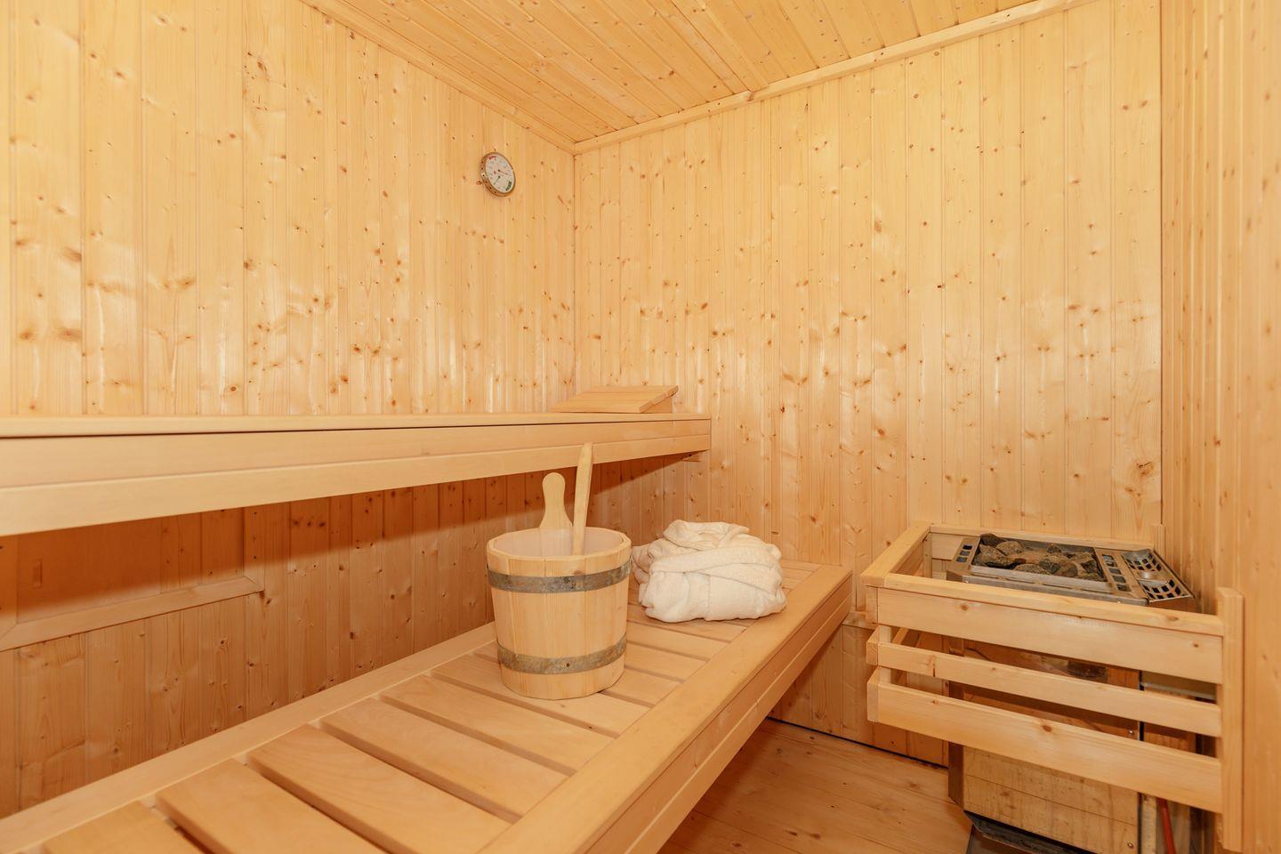 Im HW-Raum befinden sich eine Waschmaschine, ein Trockner und ein großer Kühlschrank mit Gefrierfach. Neben dem Gartenhäuschen befindet sich eine Holzsauna mit Ruhebereich.