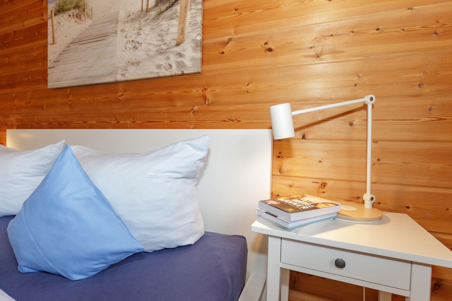 Das Haus wurde mit viel Liebe zum Detail eingerichtet und bietet Platz für bis 6 Personen zzgl. Kleinkind. Im Erdgeschoss befindet sich das Schlafzimmer mit Doppelbett 180x200 cm, ein im Jahr 2021 renoviertes Bad mit großer Dusche, Badewanne und 2 Waschbecken und eine separate Toilette mit Bidet und Waschbecken. Weiterhin befindet sich dort ein großzügiger Wohn-Essbereich mit offener, voll ausgestatteter Küche, großem Esstisch und gemütlicher Sitzecke mit Flachbild-TV und eine nach Süden ausgerichtete Holzterrasse mit weiterer Sitzgelegenheit und Sonnenschirm.