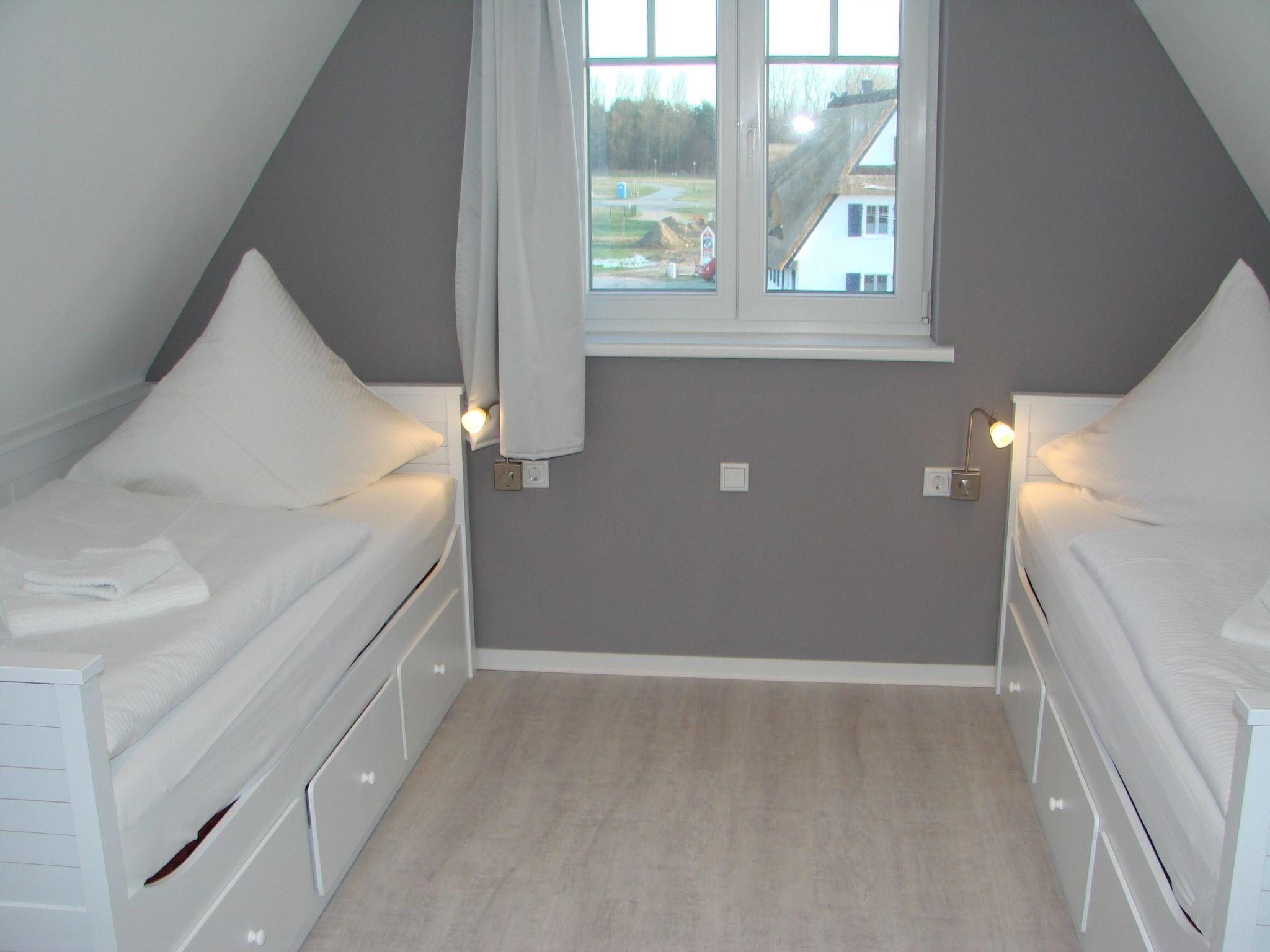 The converted loft is the ideal home for your children. There are two bedrooms. The bunk room with two beds (90x200 cm), desk and wardrobe. The chill lounge is furnished with a high-quality leather sofa bed (consisting of two 90x200 cm mattresses) at a comfortable height, bedside tables, wardrobe, sideboard and satellite TV. Here, too, the windows are protected by fly screens and darkening is provided.