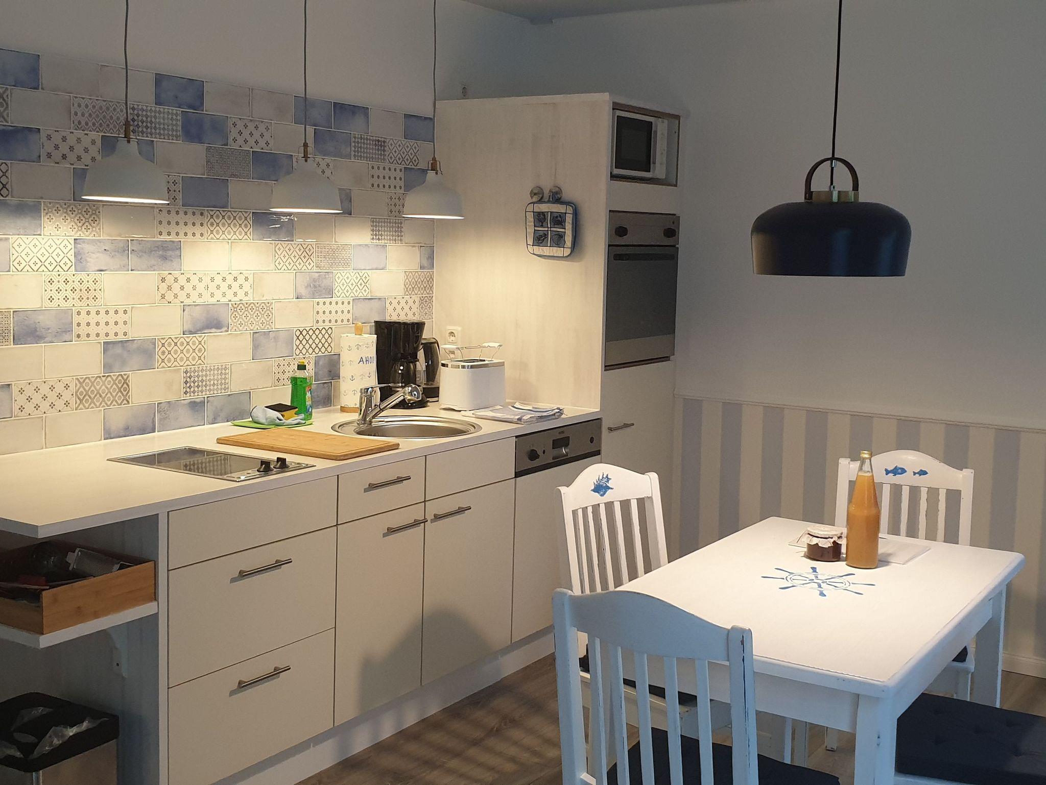 Voll ausgestattete Küche mit kleinem Ceran-Kochfeld, Backofen, Geschirrspüler, Kühlschrank, sowie Filter-Kaffeemaschine. Elektrischer Wasserkocher, Toaster und Microwelle sind selbstverständlich.