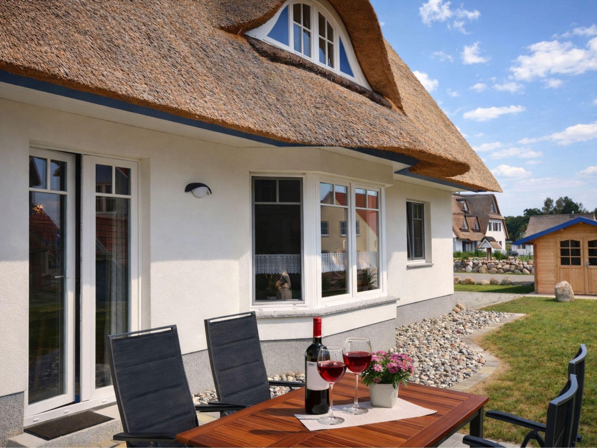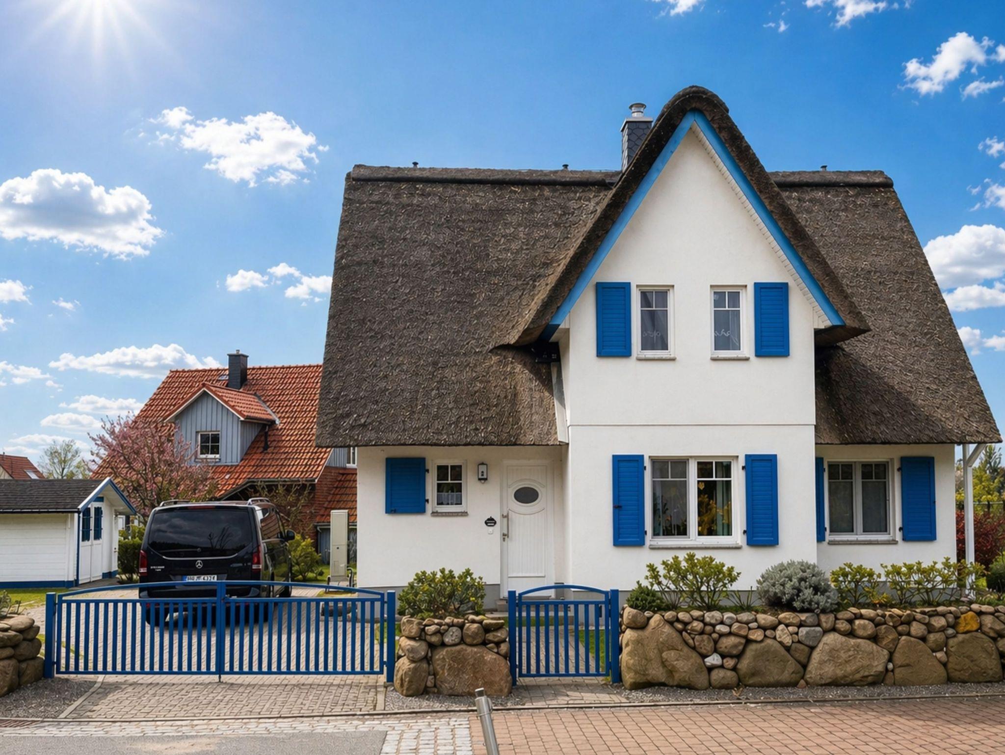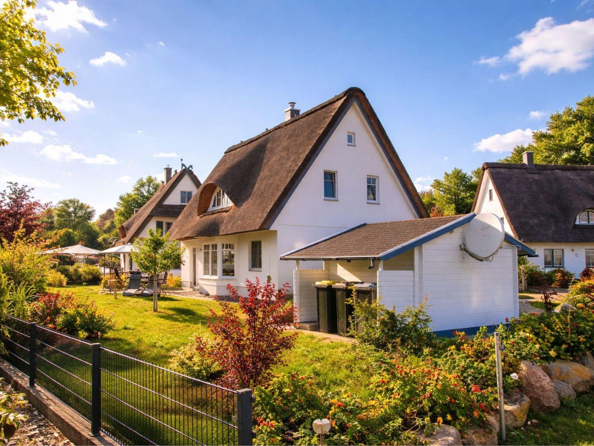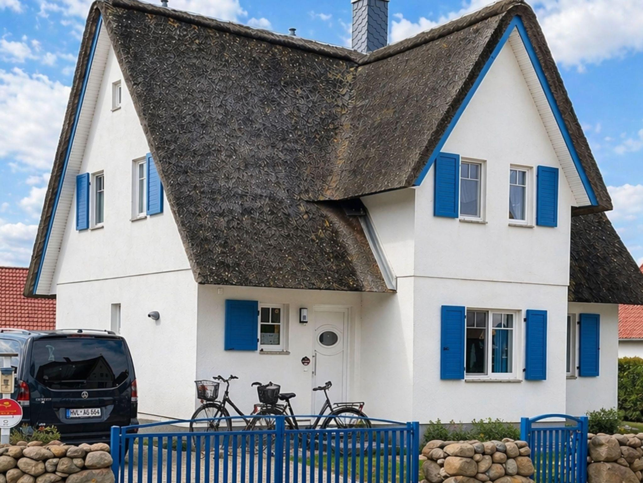 Komfort im Ostseeurlaub im Ferienhaus unterm Reetdach für 6 Personen plus 1 Kleinkind in Strandnähe im Ostseebad Rerik, am ruhigen Ortsrand Richtung Ostseebad Kühlungsborn. Sehr gut ausgestattetes Ferienhaus mit 3 Schlafzimmern, 2 Duschbädern, Sauna, Kamin und Waschmaschine. Eine E-Bike und E-Auto-Ladestation via Wallbox bietet den Gästen im Urlaub technischen Komfort. Der abschließbare Fahrradschuppen auf dem eingezäunten Gartengrundstück bietet Sicherheit für E-Fahrräder und E-Roller.