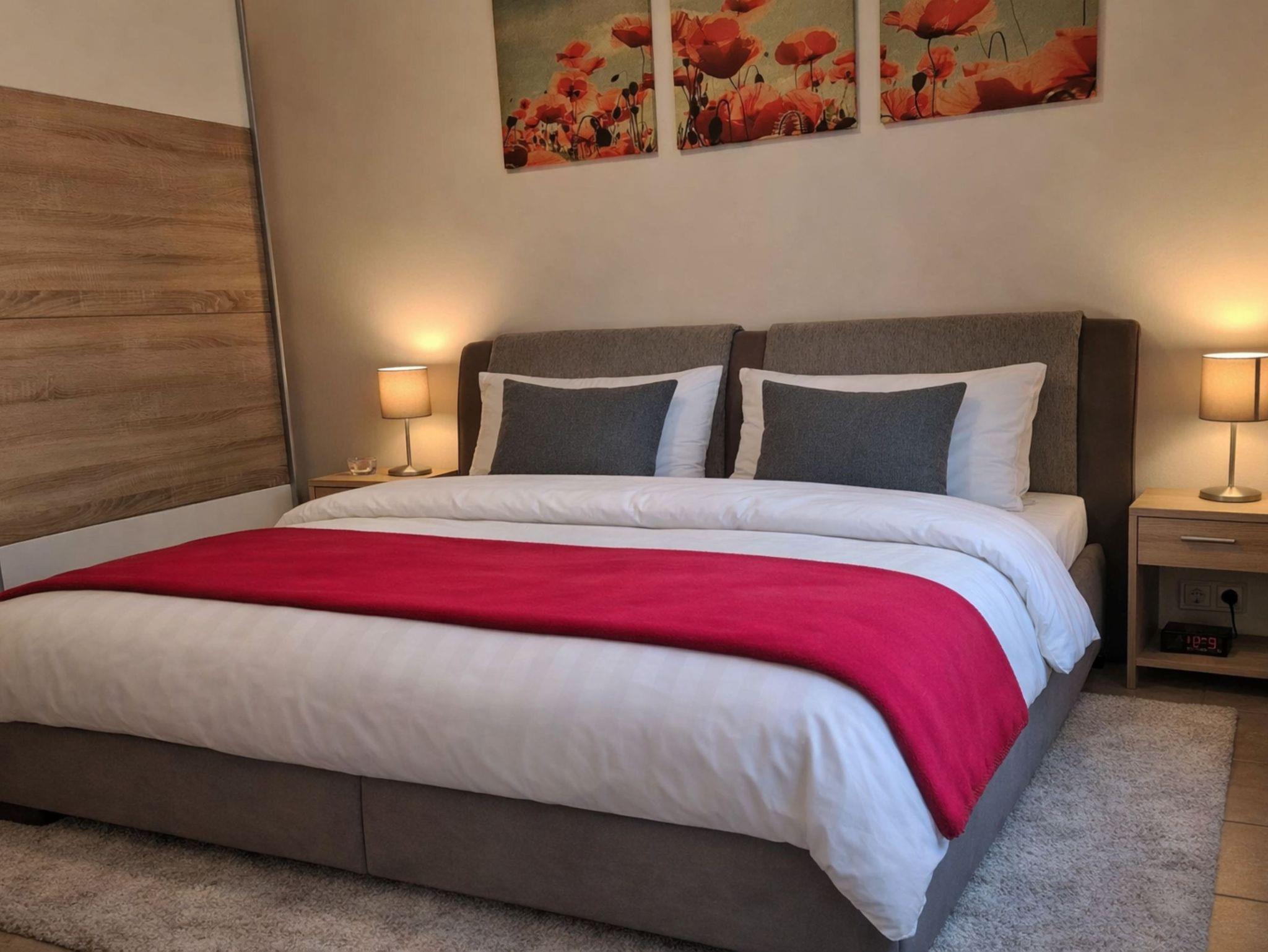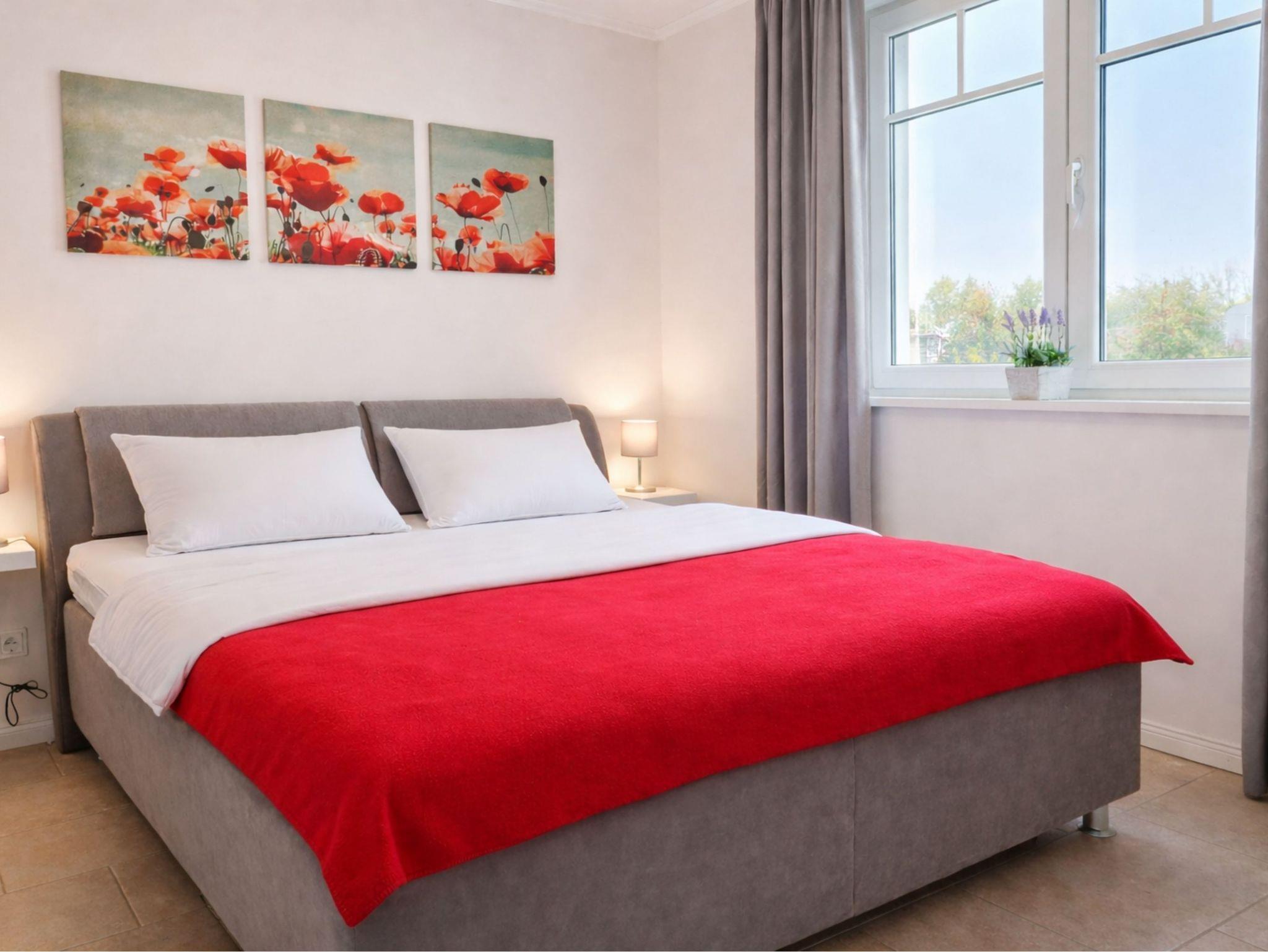 Schlafzimmer 2 mit Balkon und Doppelbett (1,80 x 2m) und Platz für Babybett (Reisebett-ohne Kinderbettwäsche!), Schlafzimmer 3 mit Doppelbett (1,60 x 2m) und TV.