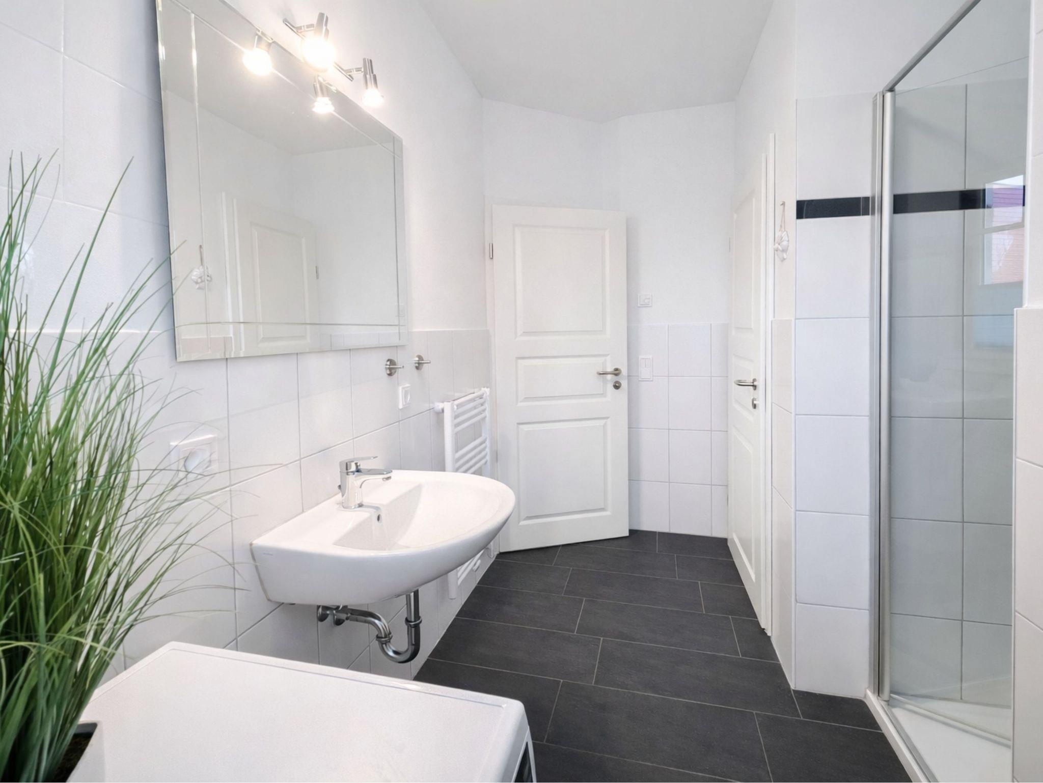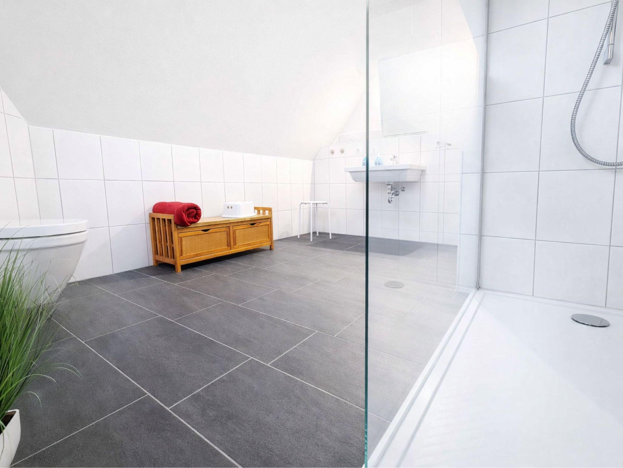 Geräumiges Bad mit ebenerdiger großer Dusche und WC.