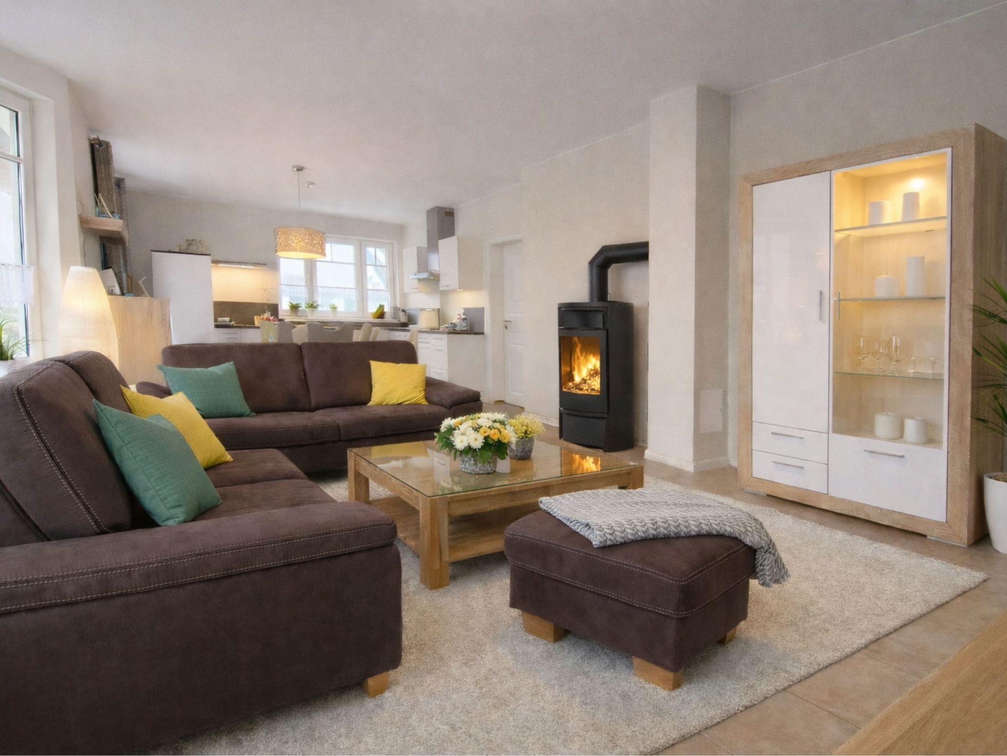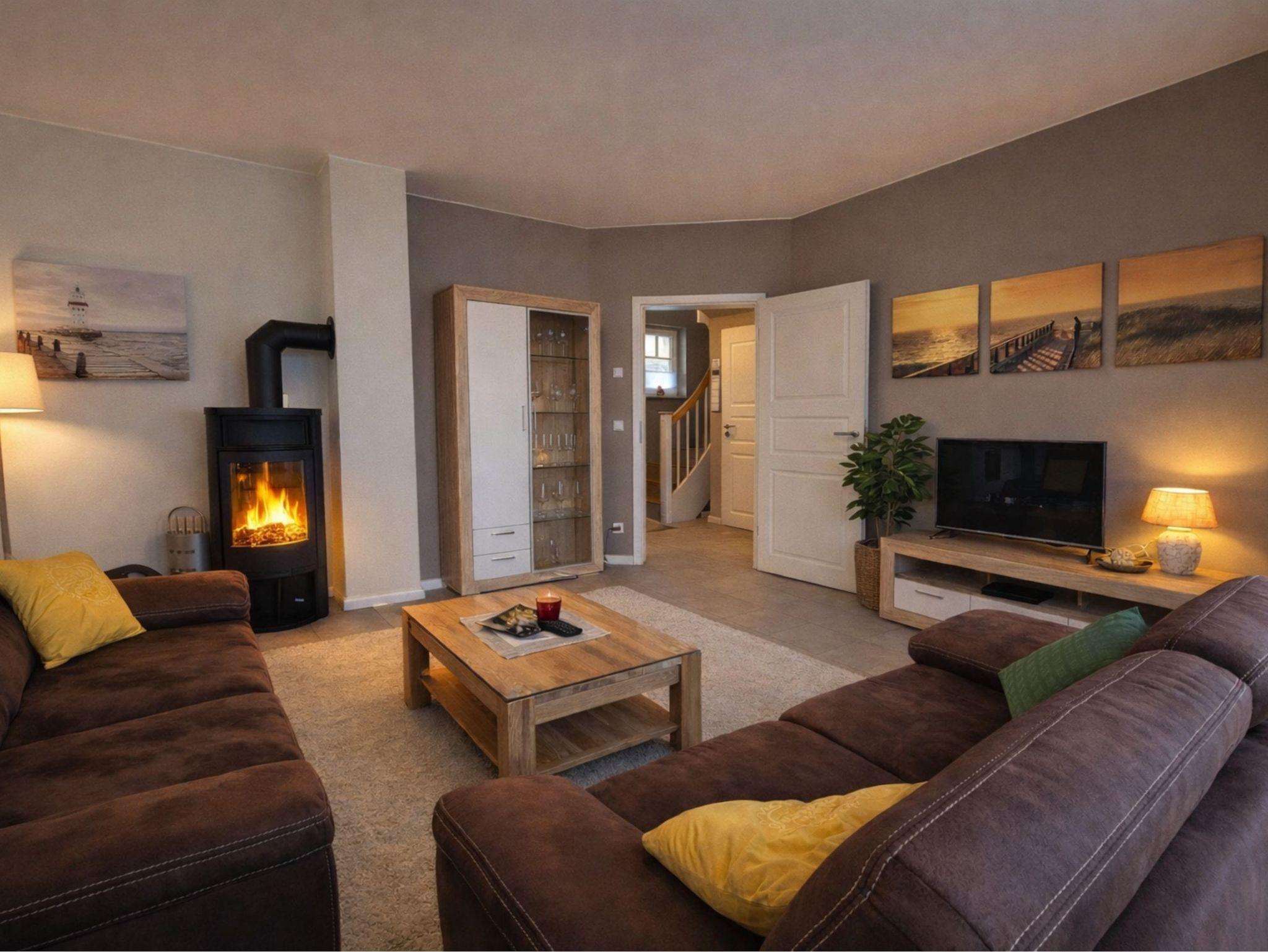 Erdgeschoss: Wohnbereich mit Kamin und Einbauküche. 1 Schlafzimmer mit Doppelbett und 1 Duschbad/ WC, alles ebenerdig.