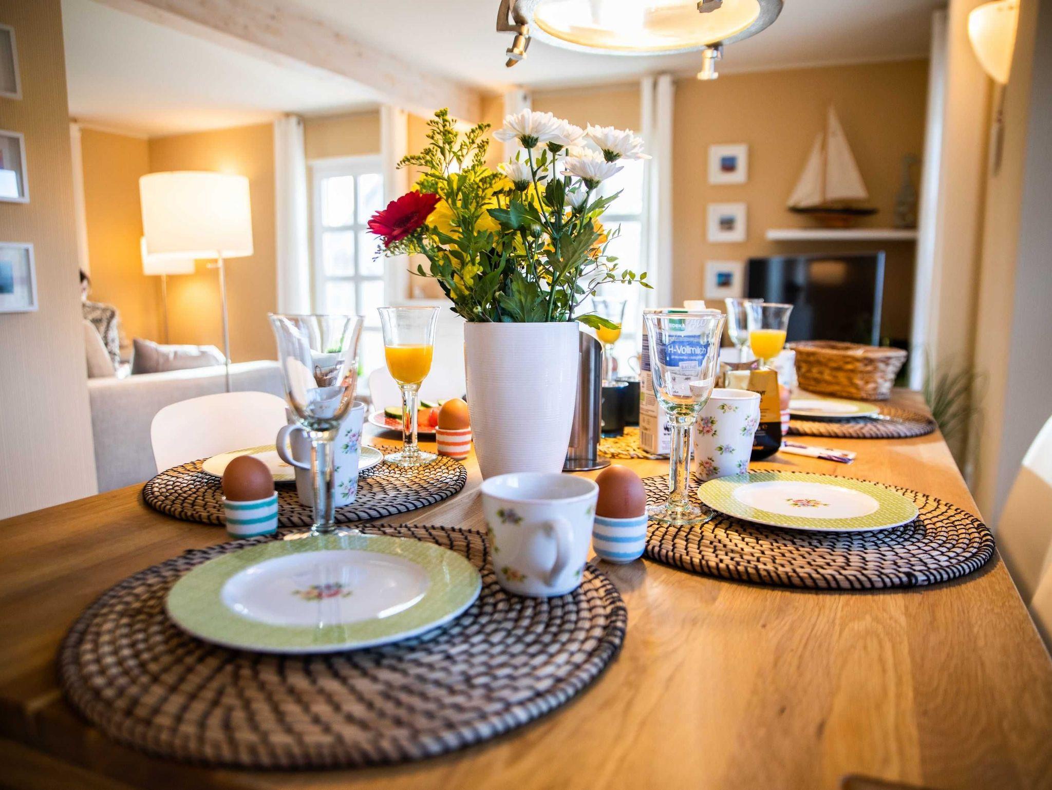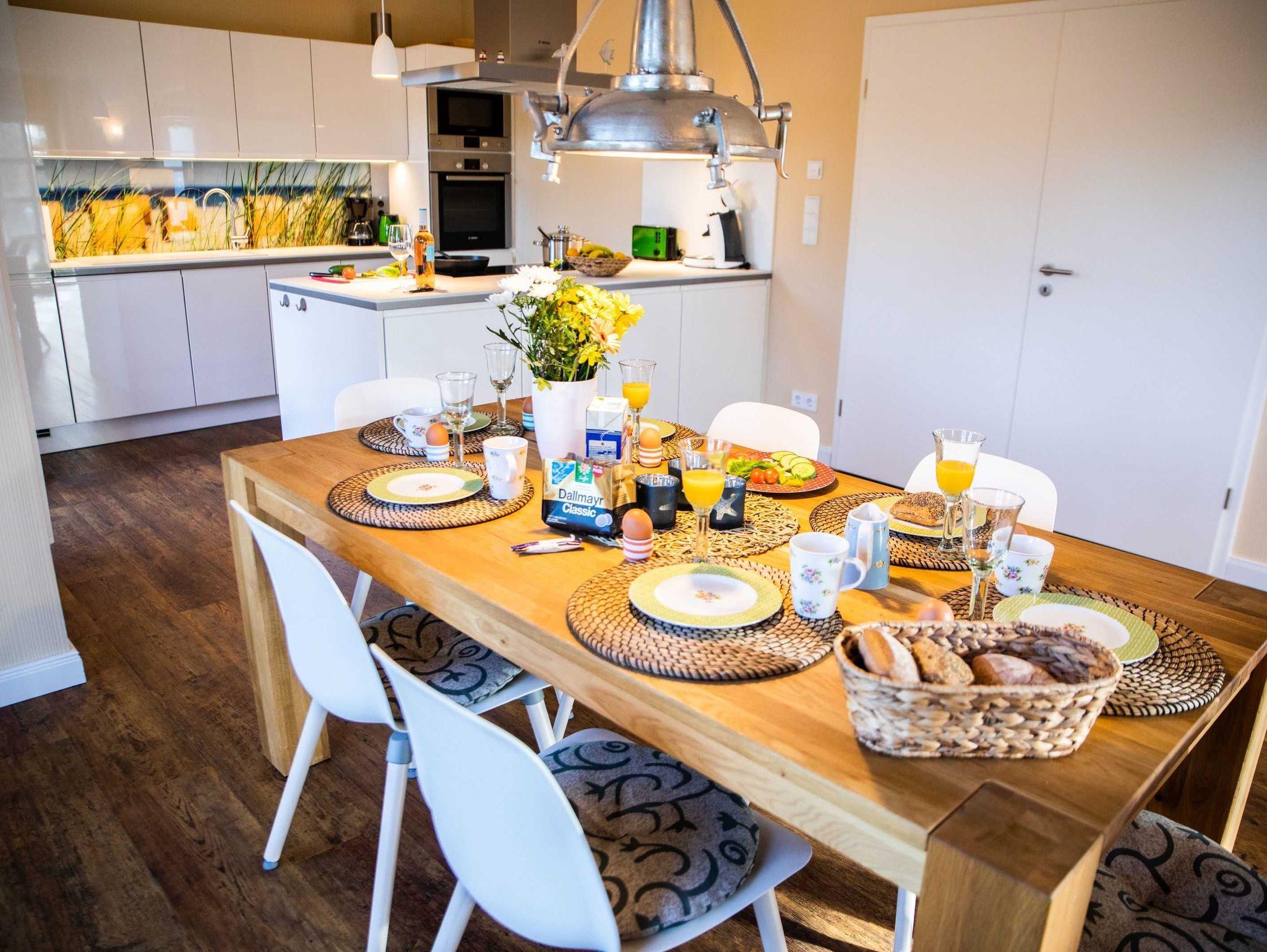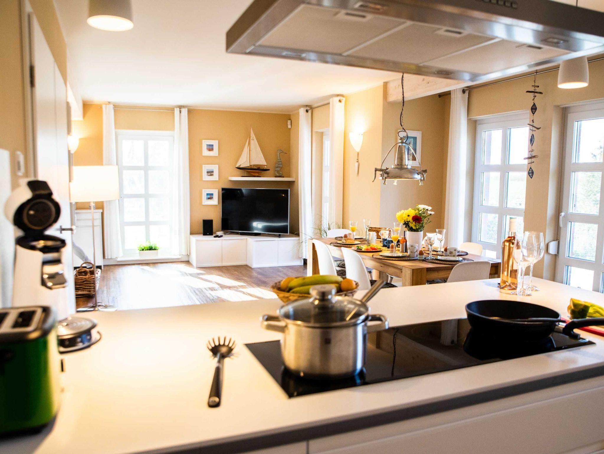 Zum 4-Sterne-Ferienhaus gehört eine moderne Einbauküche mit Geschirrspüler, großem Kühlschrank inkl. geräumigen Gefrierfach, Induktionskochfeld, Backofen, Mikrowelle, Filterkaffee- sowie Senseokaffeemaschine, Wasserkocher, Toaster und Waschmaschine. Das Wohnzimmer und die Küche mit Essbereich sind offen, hell und lichtdurchflutet gestaltet. Weiterhin stehen Euch Alexa, Bluray-Player, Kinder DVDs, 55 Zoll-TV, Radio, freies WLan, Bücher und Gesellschaftsspiele zur Verfügung.